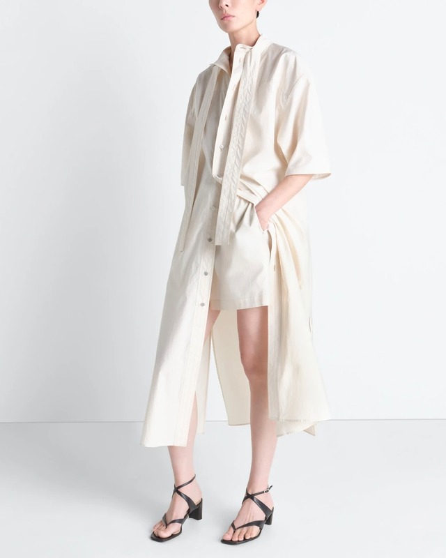 ●item info 「TUXEDO A-LINE WIDE CUFFS SHIRT(WILLIAM CHECK L)」 THOMAS MAISON社のブロード素材を用い、タキシード仕立てのフロント比翼とワイドカフスを備えたAラインシャツ。肩線をやや落としたドルマンスリーブ仕様により、肩まわりは自然に落ちるラインを描き、裾へ向かってゆるやかに広がるAラインシルエットが優雅な動きを生み出します。フロントの切り替えは洗練された印象を保ちつつミニマルな美しさを実現。袖先に向かって広がる特徴的な筒形のワイドカフスデザインが女性らしさを演出しております。素材は通気性と軽さを兼ね備え、単品でもレイヤードでも活用しやすい設計。計算されたパターン設計と細部までこだわりぬいた仕様により、フォーマルから日常までシーンを問わず活躍する一着です。 size: 36,38 36 : 肩幅53.5㎝ バスト131㎝ 袖丈13㎝ 着丈65㎝ 38 : 肩幅55㎝ バスト135㎝ 袖丈13㎝ 着丈67㎝ color: WILLIAM CHECK L material: MAIN PART:COTTON 100% ANOTHER FABRIC:COTTON 100%