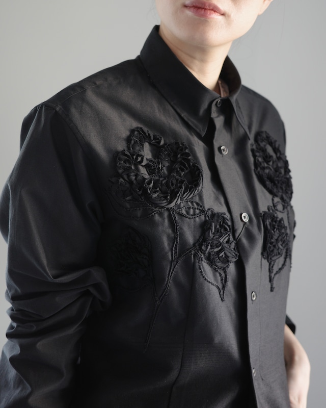 ●item info -unisex item- 上半身はシャツ地、裾に向かってウールへと移行する、一枚の生地の中で素材自体が変化する特別なテキスタイルを使用。 胸元には、共生地をバイアス方向に裁断、構築した立体的な花の刺繍を配置。 テーラードとシャツ、構築と装飾、機能と詞性を繋ぐ、TAAKKならではの融合的アプローチを体現する一着。 ( pic 1-8 165cm / 1 ) color: black size: 1 1 / 身幅53cm 着丈 74cm 肩幅45.5cm 袖丈62.5cm material: ウール60% コットン25% ナイロン9% 【 TAAKK(ターク)】 イッセイ ミヤケで経験を積んだデザイナーの森川拓野が2012年に立ち上げたブランド。 "形に、中身に、素材に、技術に、方法に、体験をなぞり新しい体験を重ねる。 終わりのない探索をデザイン"をコンセプトに、生地や素材に対する斬新なアプローチを落とし込んだ洋服を提案し続けている。 2019年には「FASHION PRIZE OF TOKYO 2020」受賞、2023年には初のウィメンズコレクションを展開。 - TAAKK 26S/S collection concept - 26SSシーズンには解体的ディテールと精巧なテイラーリングの調和が目立つコレクション テーマは「The Common Baseline of Art and The Ordinary(アートピースと日常着の境界)」。 ブランドがかねてから追求してきたものづくりの姿勢そのものをテーマに設定し、「タークにとってのベーシック」を追求 定番である「グラデーションファブリック」からは、シャツとスーツがグラデーションで一体化したデザインを提案。過去数シーズンにわたり展開してきた彫刻的な刺繍技術は、より立体的なフォルムとして表現するなど、これまでに培ったさまざまな独自のテクニックを進化させたデザインを発表しました。