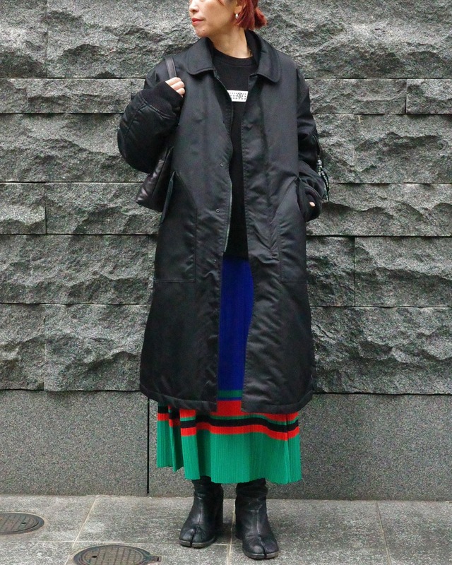 ●item info 日本のインナーダウンウェアブランド"TAION"とのコラボレーションによって復刻された、リバーシブル仕様のロングMA-1コート。 08sircusのアイコニックなアイテムにTAIONの高機能なダウンを内包することで、モードな表情と軽やかな防寒性を両立させたデザインにアップデート。 表面はマットでエレガントなナイロン、裏面はダウンのキルティング構造という異なる表情を持ち、気分やスタイリングに応じた着こなしが可能。 08sircusらしいミニマルな構築と、TAIONの機能性が融合した1着。 (pic 1-17 149cm / 0 ) color: black material: Faclic :Nylon: 100% Down: down 95% feather 5%, Filling: Polyester 100%, Liner: Nylon 100% SIZE : 0 :着丈101cm, 肩幅49.5cm, バスト127cm, 袖丈 60cm 1 :着丈101cm, 肩幅49.5cm, バスト127cm, 袖丈 60cm -2025-26 autumn and winter collection- エレガンスとミリタリーの融合 ニュートラルな空気を纏いながら エレガンスとミリタリー。 相反するようでいて、どこか惹かれ合う二つの要素はニュートラルな空気を纏いながら、 個性と混ざり合い、モードの中で新たなストーリーを紡いでいく。 前シーズンに引き続き、 メンズとウィメンズの要素が溶け合うニュートラルな空気感にこだわりコレクションを展開。 80年代のバランスをエレガントに昇華し、ミリタリーの要素を加えながら モードでニュアンスを生むシルエットで新たな美意識を追求。 柔らかくも力強い表情を持つ素材を重ねることで質感に奥行きを持たせ新たな表現を生み出す。