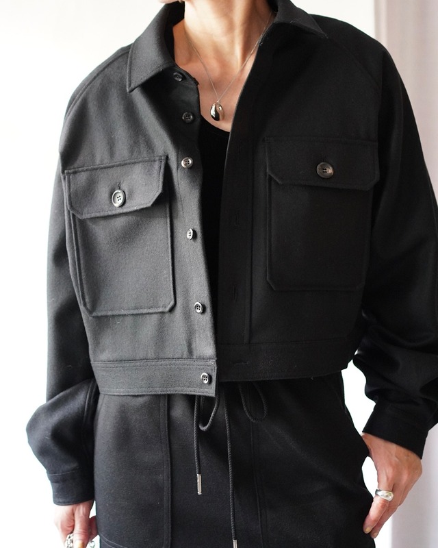 -item info- US NAVYのCPOシャツをベースとしたカジュアルなブラウスを、ショート丈で女性らしくアップデート。大き目のパッチポケットとたっぷりとボリュームを持たせた袖がデザインの特徴となっております。フロントサイドに1箇所、バックサイドに2箇所タックを入れることで立体的になり、ショート丈との最適なバランスを構築しています。肩回りと袖はゆったりとした設計で、袖を少し長めの設計にすることでカフスがブラウジングされ、袖口のタックにより更にボリュームを持たせています。また、釦は使用箇所によりサイズを変え、すっきりとしたディテールに仕上げています。高級感溢れる柔らかな質感と独自のパターン設計で、ミリタリーアイテムをモダンに進化させたTHE RERACSならではの一枚です。 ( 着用149cm / 36) 【 THE RERACS (ザ リラクス) 】 2010年デビューの新鋭ジャパニーズブランド「THE RERACS(ザ・リラクス)」。 デザイナーの倉橋直実氏は、セレクトショップ勤務中にパターンメイキングやテキスタイルを学び、その後ブランド活動をスタート。 ベーシックでありながらも既成概念に捉われず、時代に合ったシルエットや素材を追求しながら、着る人に依存する、着る人を美しくするデザインを提案している。 - THE RERACS 24FW - 2024年秋冬のテーマは“INVENTOR” 春夏のテーマ“INVENTION”に続くシーズンです。 普遍的・日常的なものの組み合わせによる摩擦によって生まれる新しいクリエーション。 一見してトラディショナルなアイテムでも、 耐久性と質感のラグジュアリーを両立させた素材や継続可能性を考慮したハイブリット素材を使用し、 「ザ・リラクス」らしいパターン設計に落とし込むことで、 時代に合ったバランスかつ本質的なラグジュアリーを提案しています。 color : black size:36,38 36 / 身幅124cm,袖丈75.6cm, レングス45cm 38 / 身幅128cm,袖丈77.4cm, レングス46cm material: WOOL 100%