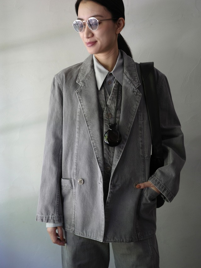 ●item info 「四角形の布に穴をあけて、袖(肩)をとりつける。」というアイデアから生まれたジャケット。 着物のような平面、幾何学的なモチーフと西洋的なドレープ、テーラリングを組み合わせた、YOHEI OHNOの造形コンセプトが強く反映された作りです。 袖口には「チェスの馬」のチャームつき。(クリーニングの際は取り外し可能) "Antipope(対立教皇)"は敬愛するアーティスト、マックス・エルンストの作品名から拝借した。 ( pic 2-8 着用149cm / 36) color / grey size:one / 36 身幅52cm 着丈54cm 肩幅55cm 袖丈56cm material: 表地: Wool100% 裏地: Cupro100% -2025 F/W- 素朴な日常の中から生まれる美しい造形 デビュー10周年を経て「変わらずラグジュアリーとは程遠い、素朴な日常の中で『塑像』を繰り返す自分」という現在地を俯瞰し、“造形”という大野自身にとってのエッセンシャルな行為に向き合ったという2025FW collection 人間の身体と衣服との関係性に図形や建築的な空間を取り入れることによって、新たなフォルムや身体像を探求することを目指す、ヨウヘイ オオノらしいアプローチを遺憾無く発揮した。 素材使いには、これまでも度々着想源としてきたバウハウスや、ドイツの現代アーティスト ヨーゼフ・ボイスの作品における乾いた質感を反映。黒やグレー、ブラウン、カーキ、白を基調とした質素なカラーパレットにより、フォルムや質感を引き立てた。 - YOHEI OHNO - アート、建築、工業デザインなどからインスパイアされた、アーティスティックで構築的なシルエット、ユーモアあふれるディテールへのアプローチに定評がある。伝統的な洋服のルールに縛られない自由な発想から生まれるデザインが強み。 desiner / 大野陽平 文化服装学園でパターンカッティング・ソーイングの基礎を習得し、その後イギリスに留学。ノッティンガム・トレント大学(Nottingham Trent University)でファッションを学ぶ。卒業コレクションは、ロンドン卒業コレクション(London GFW 2014)で発表。2014年、自身のブランド「ヨウヘイ オオノ」を立ち上げる。2015年年秋冬コレクションでデビュー。2017年秋冬東京コレクションでランウェイデビュー。同年東京ファッションアワードを受賞。2018-19インターナショナル・ウールマーク・プライズアジア大会で優勝。2021年、「3711 プロジェクト(3711 Project)」ローンチ。使用されないまま眠っている着物の反物にブランド独自のデザインと技術を加え、新たな一点ものの服に仕立て上げるプロジェクト。デザイナーの大野が選りすぐったヴィンテージの反物を使用した、モダンな一点物を提案する。
