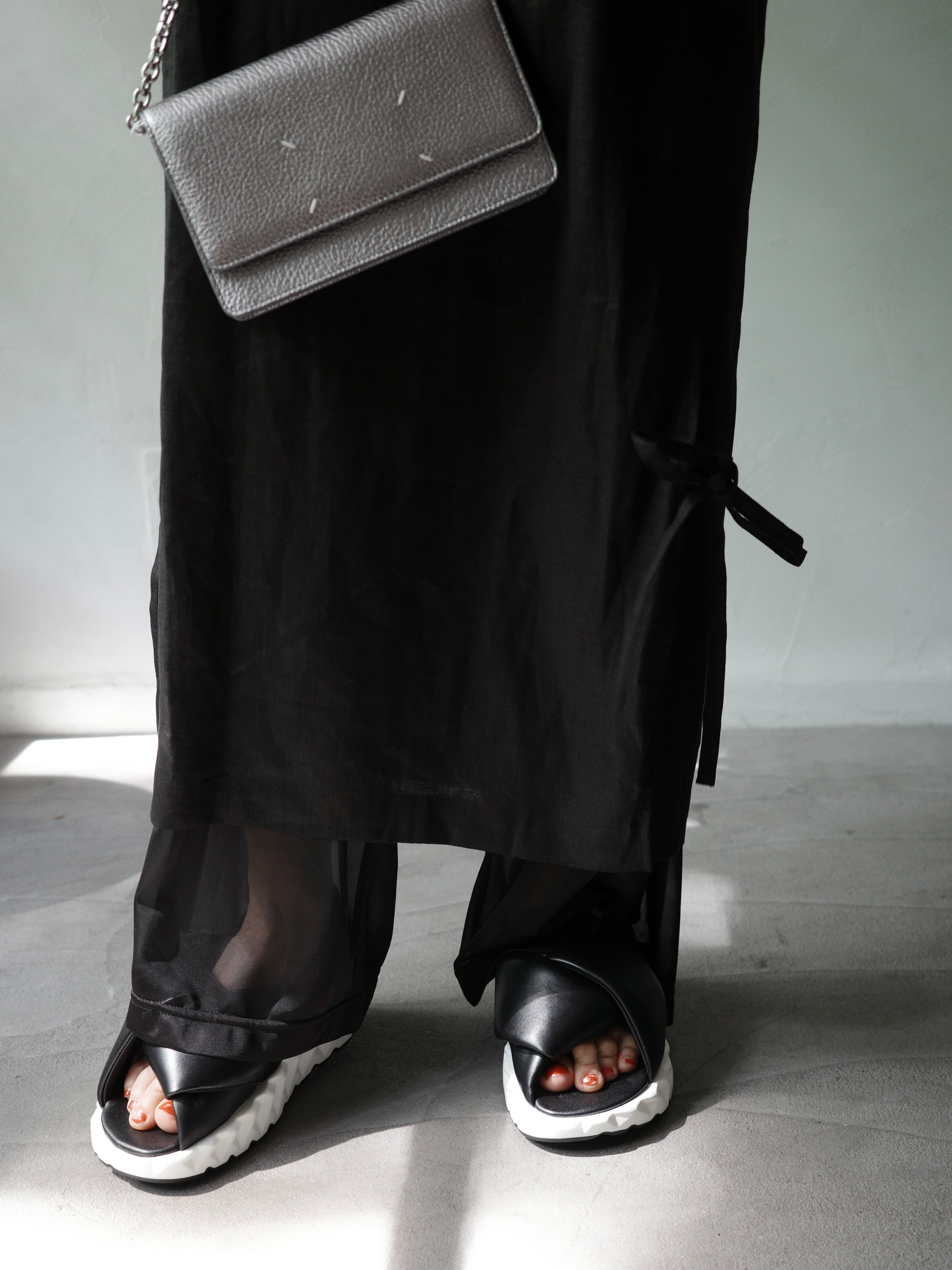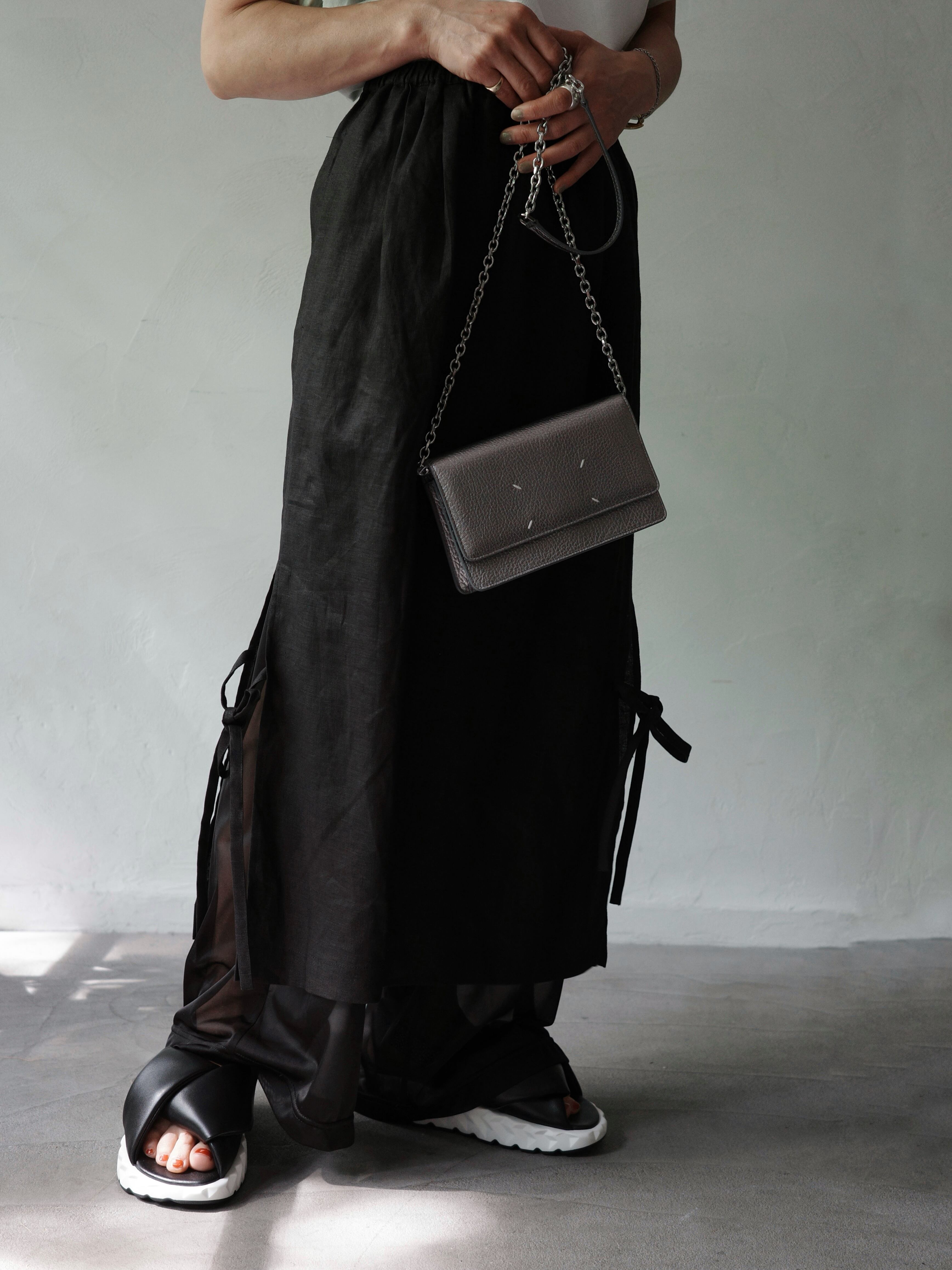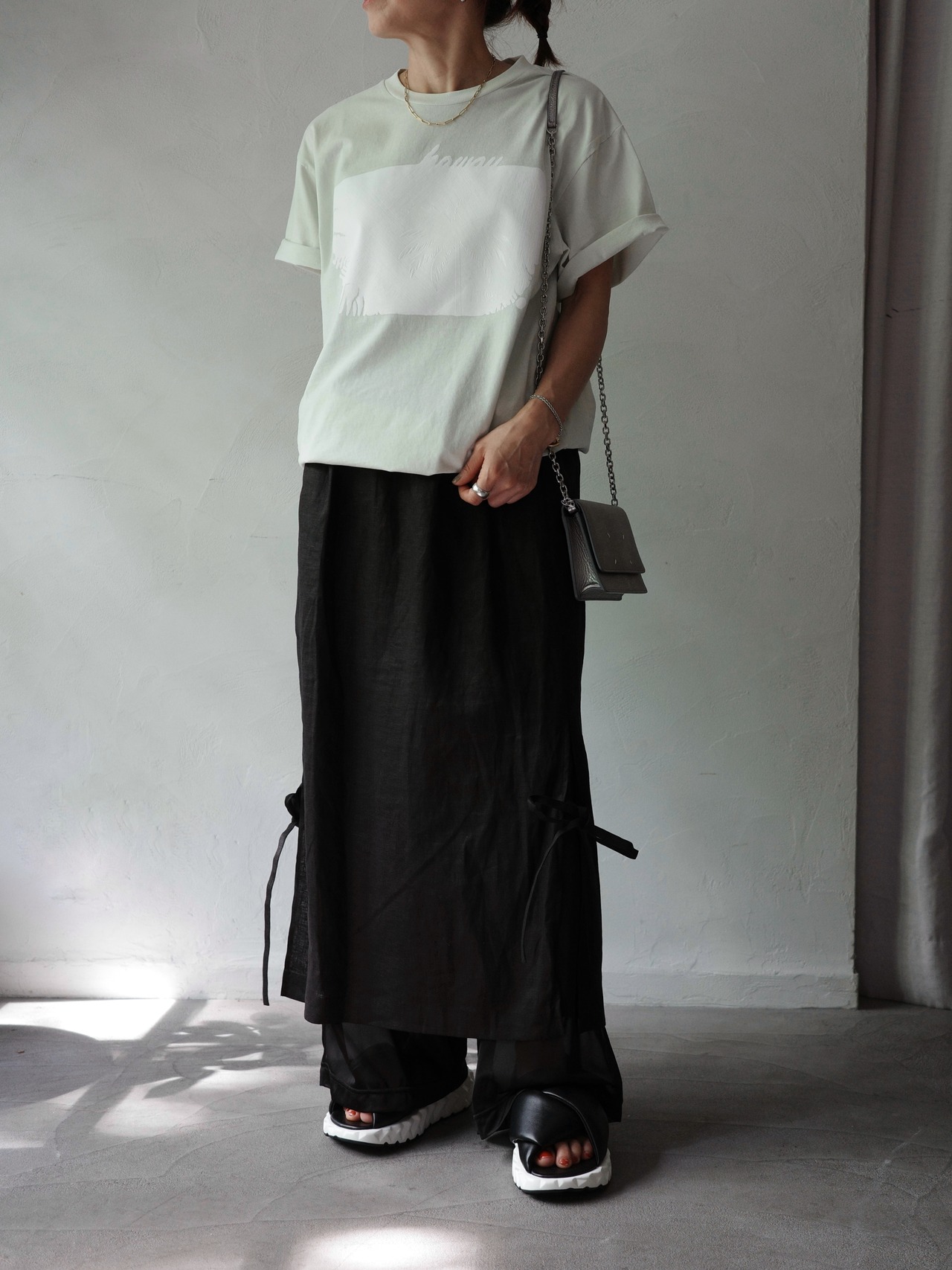 初夏らしい涼しいリネンと涼しげ感のあるトリコットの今までにない素材を使用したレイヤードデザインボトムス。