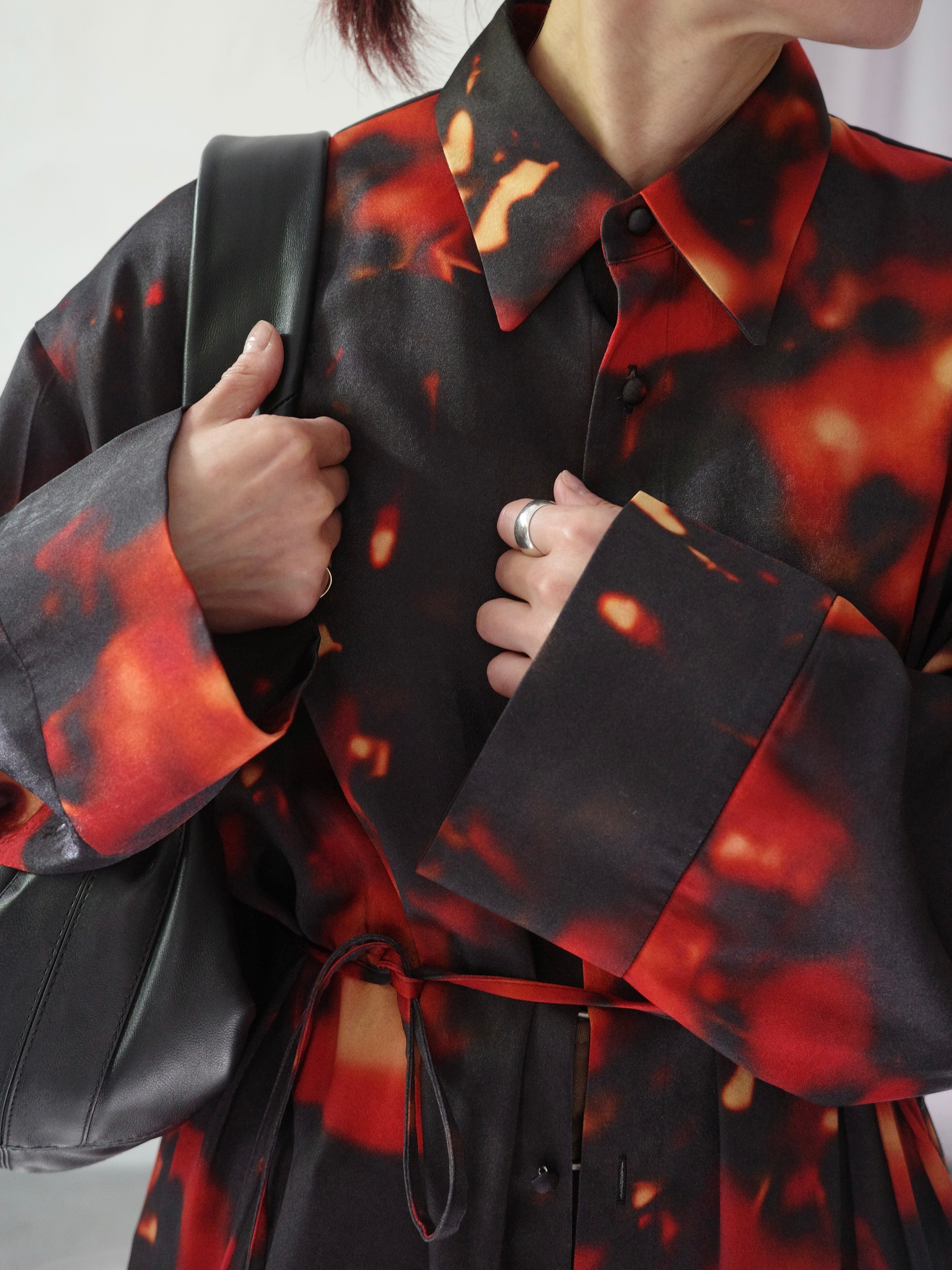 ムラ感のある抜染柄をあえてプリントで表現し、さらにぼかしたような曖昧な仕上がりが現代アートのような奥行きを感じさせる1着。