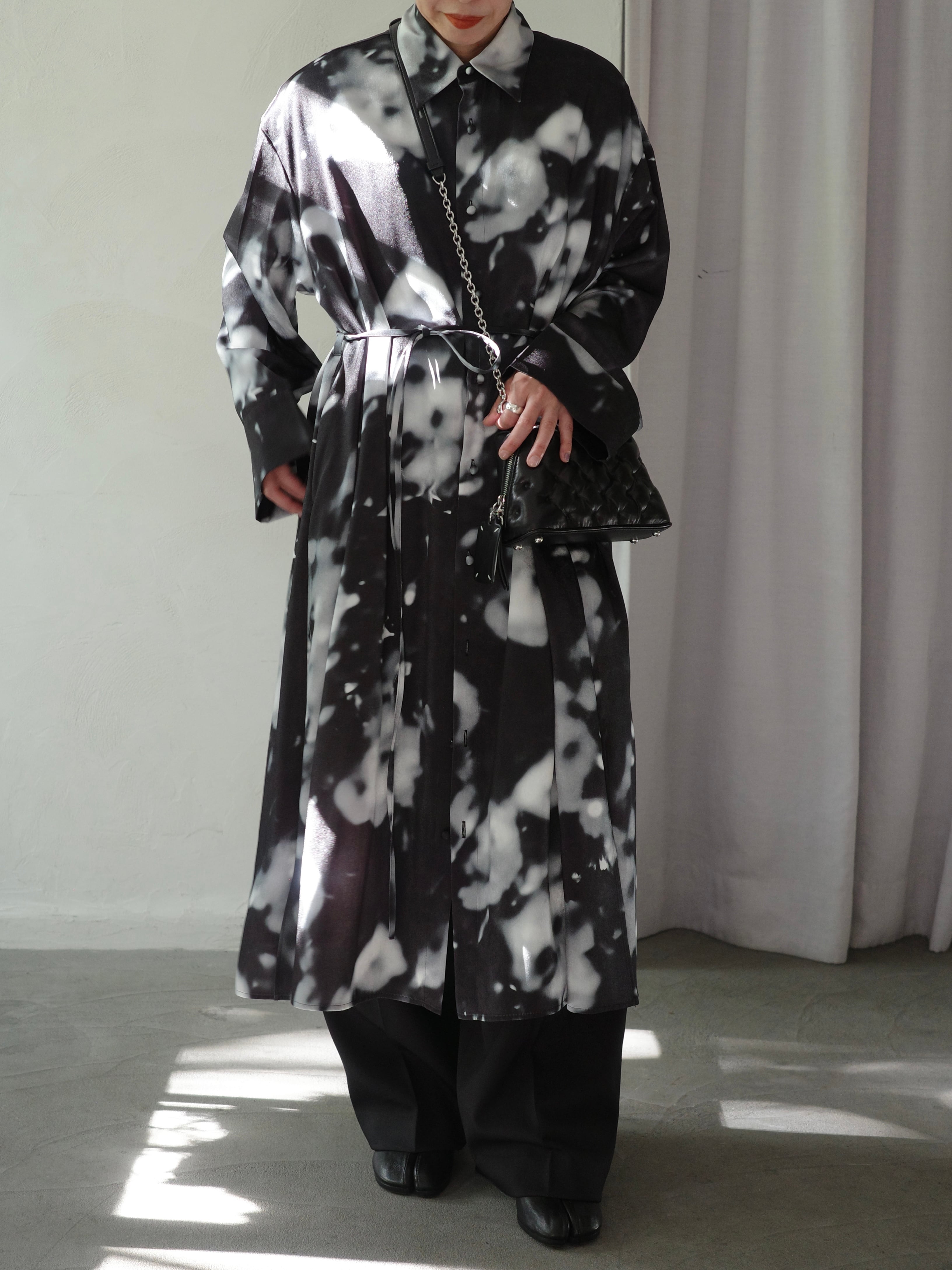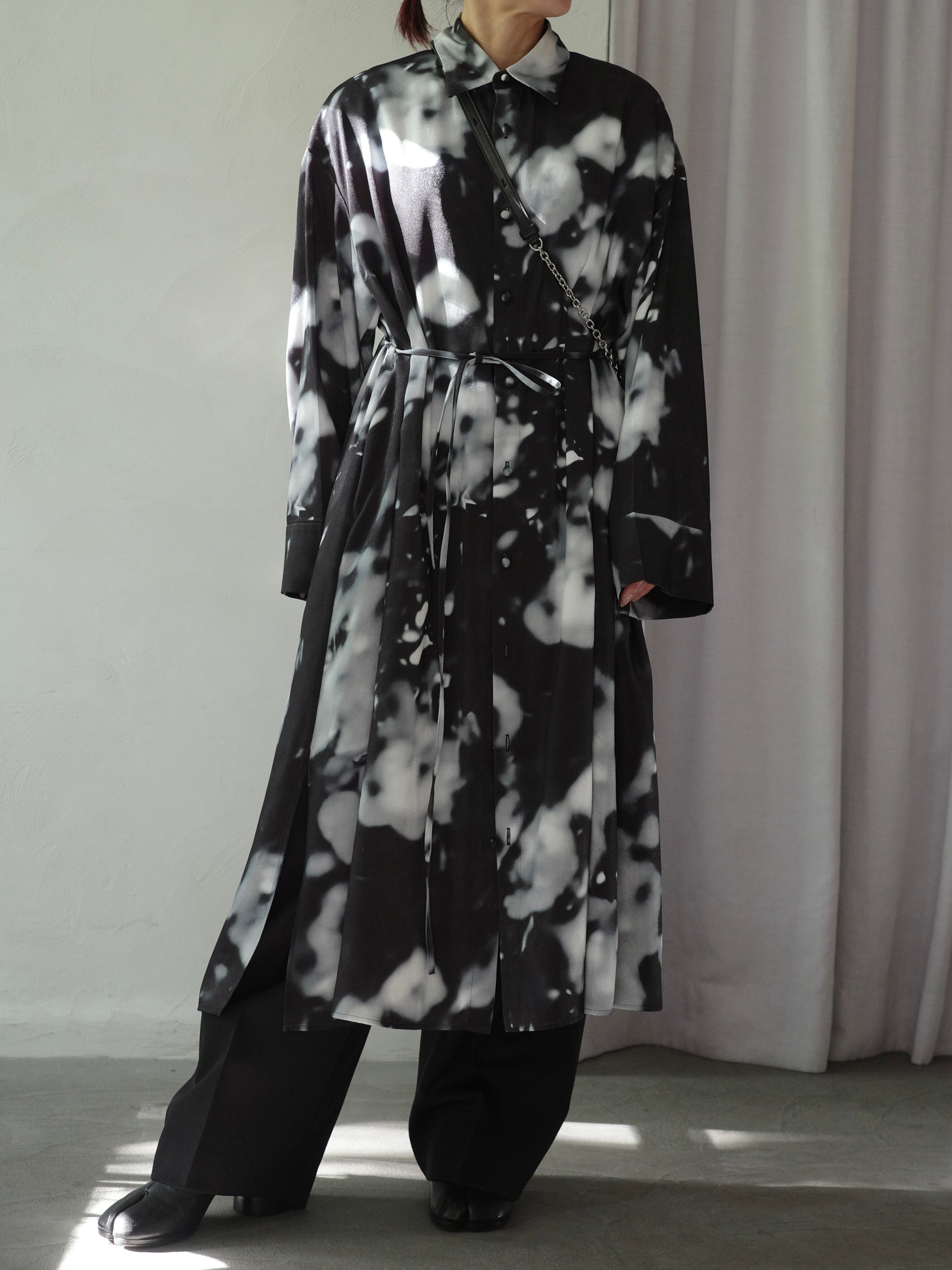 ムラ感のある抜染柄をあえてプリントで表現し、さらにぼかしたような曖昧な仕上がりが現代アートのような奥行きを感じさせる1着。