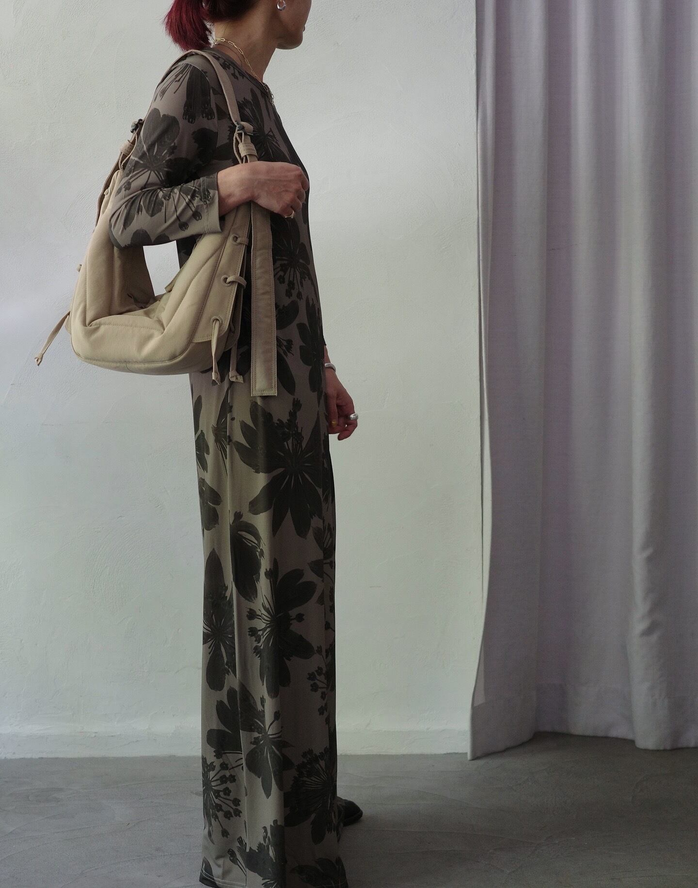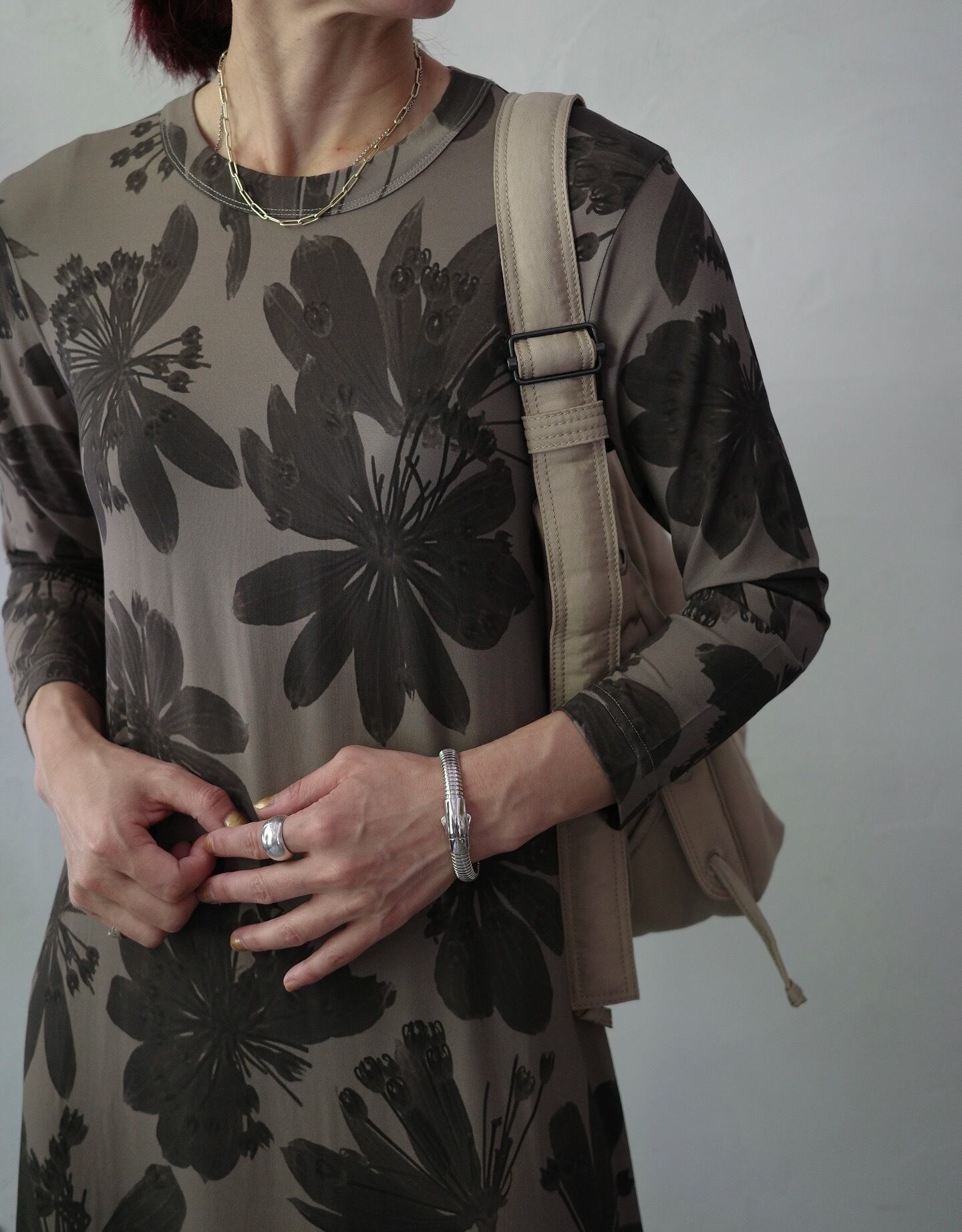 柔らかなジャージー素材に、印象的なプリントを全面にあしらった流れるようなAラインドレス。高めのクルーネック、七分袖、そして動きやすい緩やかなフレアヘムが、クリーンでありながら表情豊かなシルエットを演出します。滑らかなストレッチ素材が肩と腕に優しくフィットし、ボディに沿ってゆったりとしたドレープを描きます。