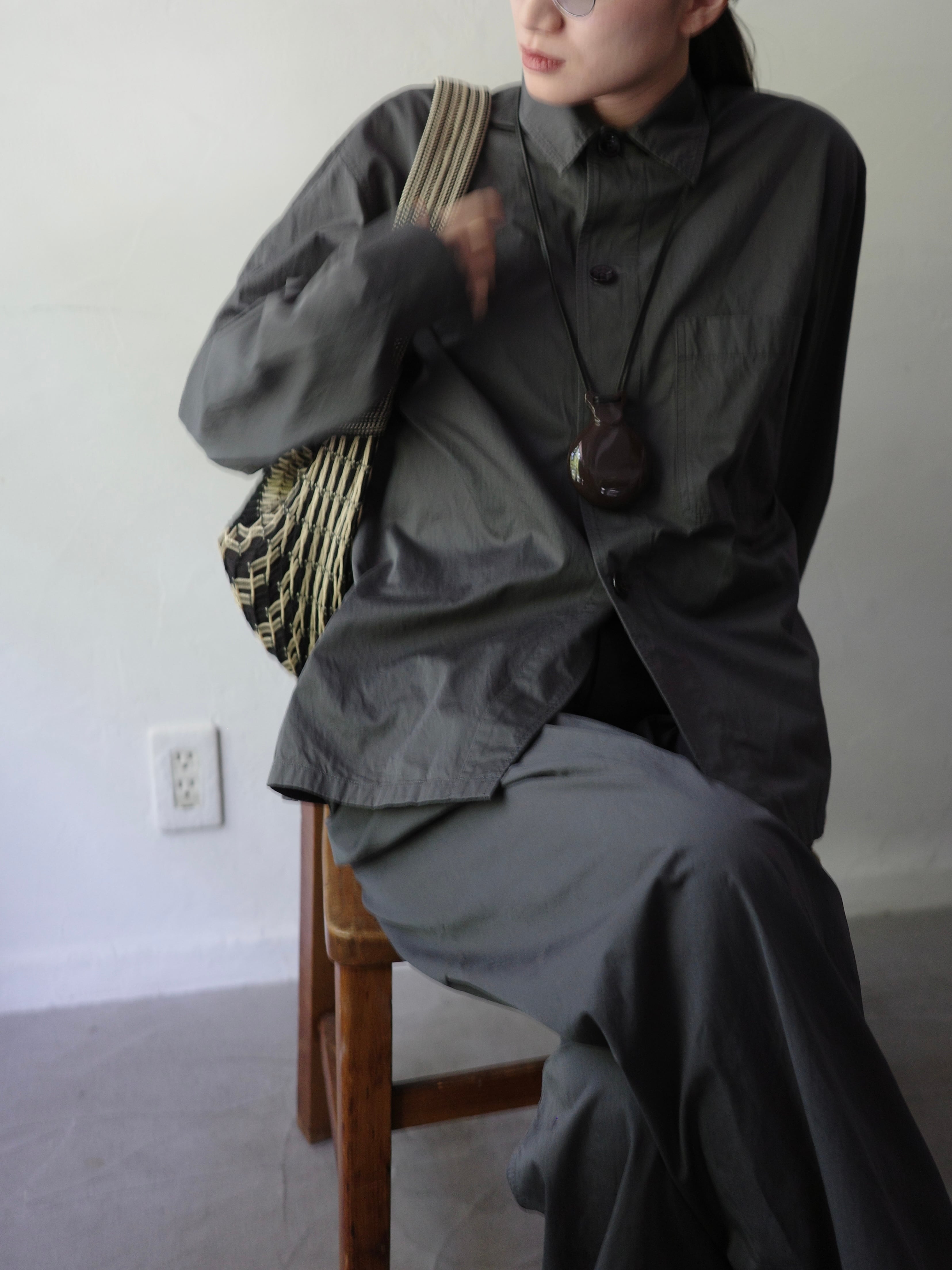 今シーズンは、厚手のコットンウォッシュポプリンを使用し、構造と着心地の両方を兼ね備えています。パジャマシャツはコンバーチブルカラーを採用し、襟を少し開けてリラックスした着こなしも可能です。ボックス型のストライプスタイルはフロント中央のワイドなプラケットに4つのコロゾボタン、フロントのパッチポケット、そして袖口の切り替えが特徴です。