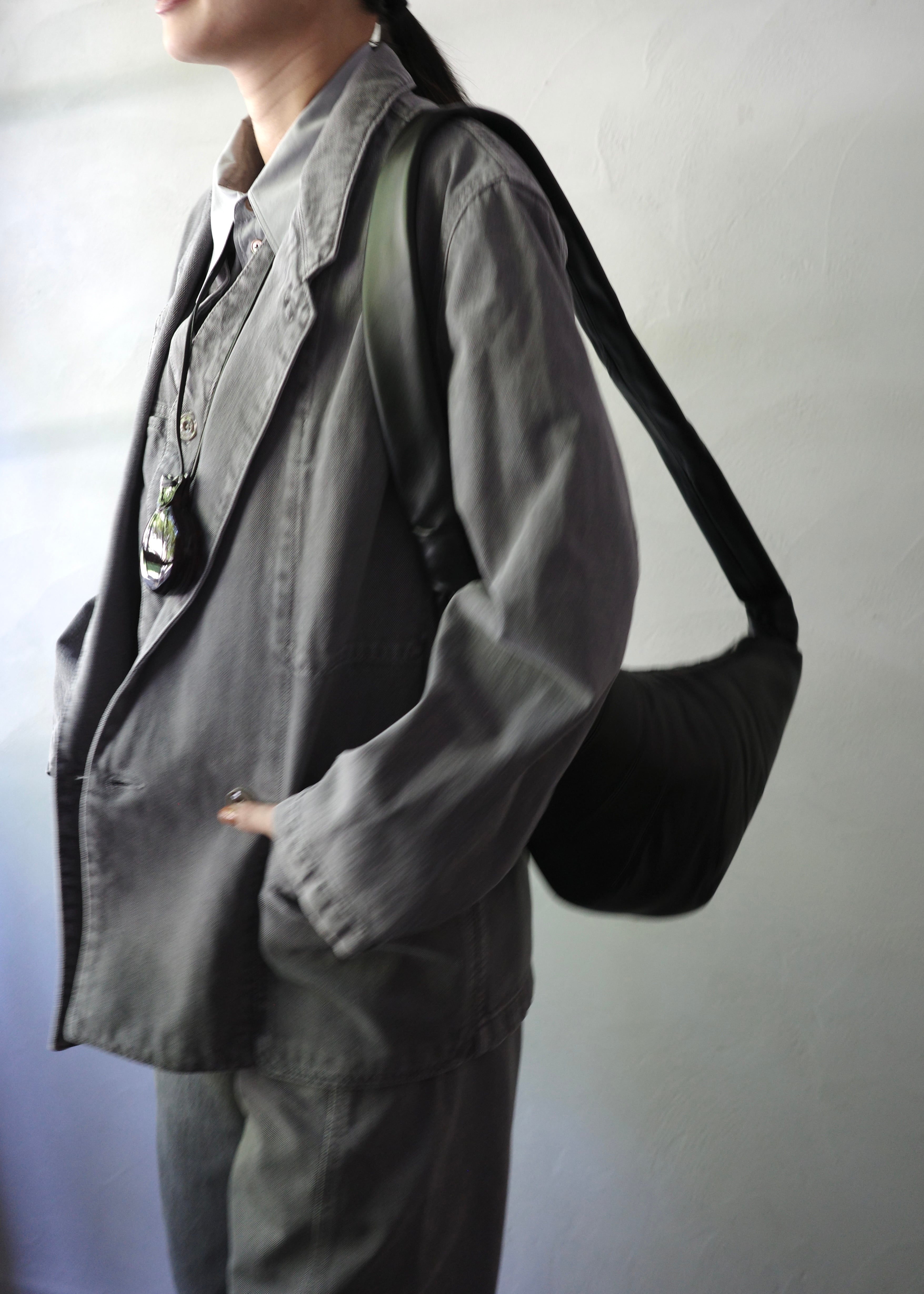 厚手のデニム生地を使用し、ガーメントダイ加工を施すことで雪のような風合いに仕上げています。