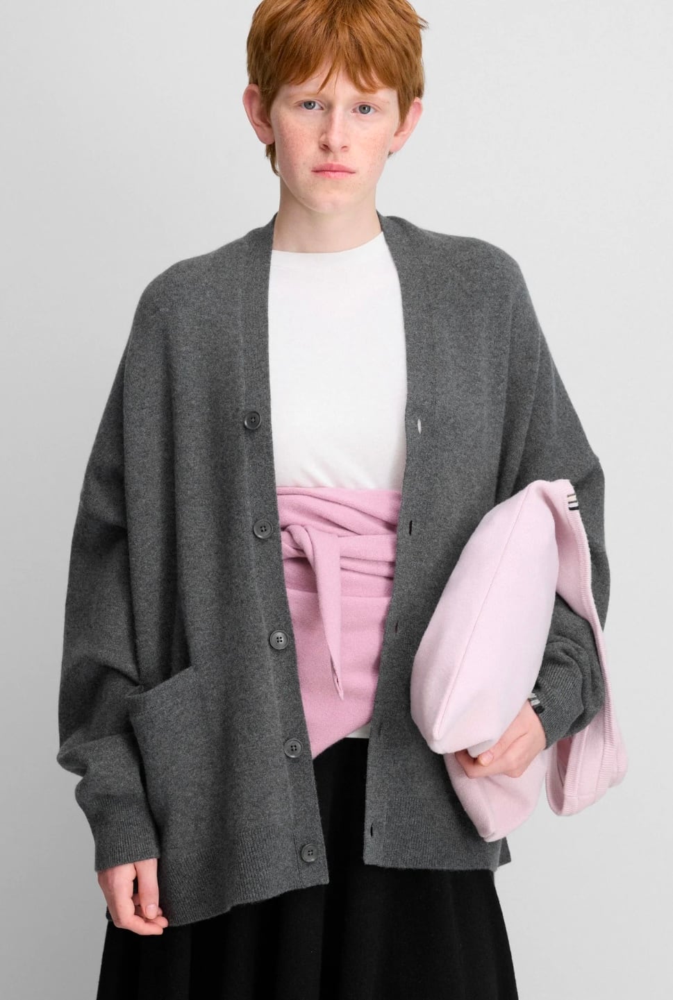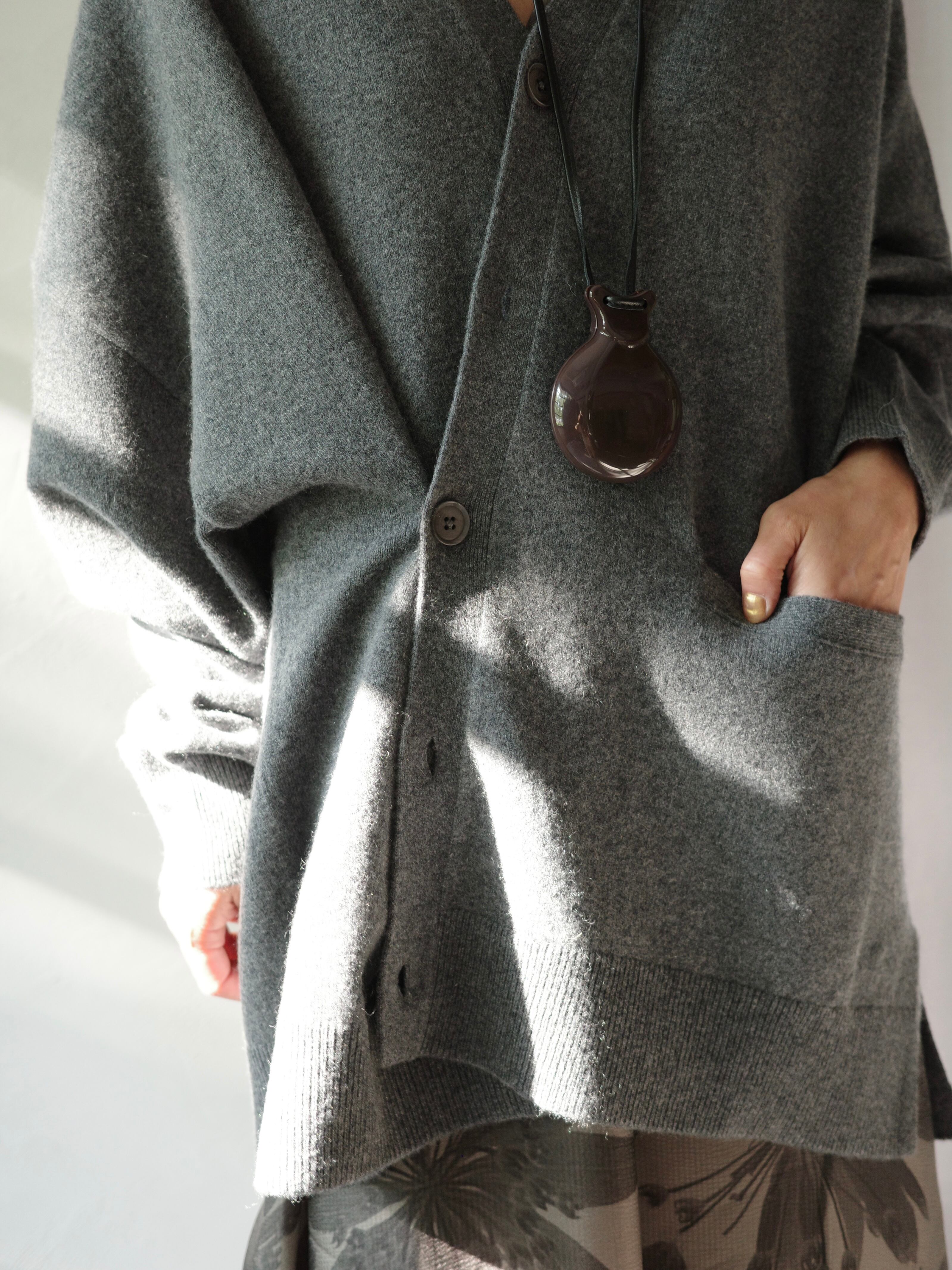 ロントにパッチポケットが2つ、ドロップショルダー。サイドにはボタンが1つ付いており、カーディガンのフィット感を調節できます。ボタンは耐久性の高いコロゾ製で、ヤシの種子から抽出された完全に天然で化学薬品を含まない素材です。