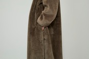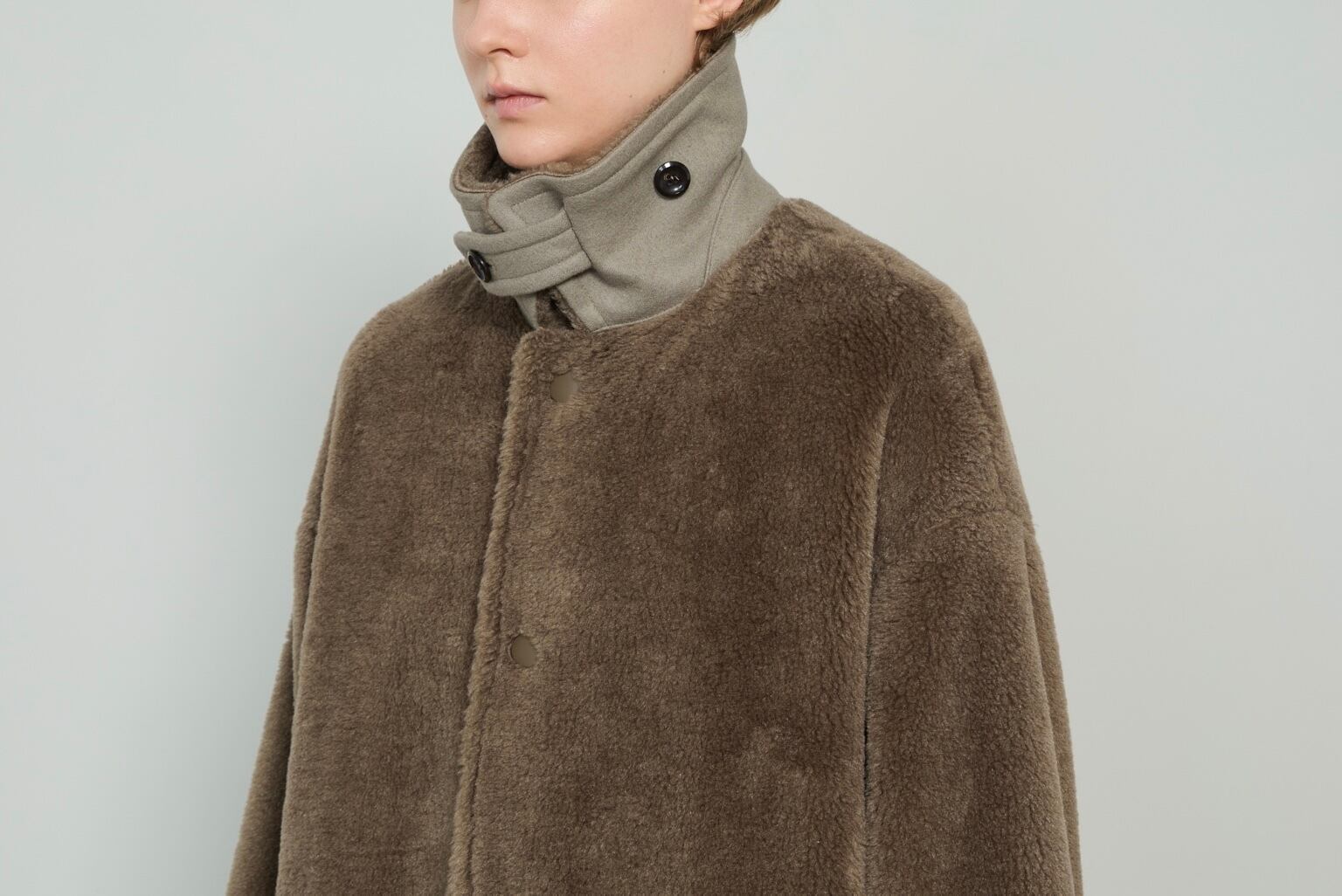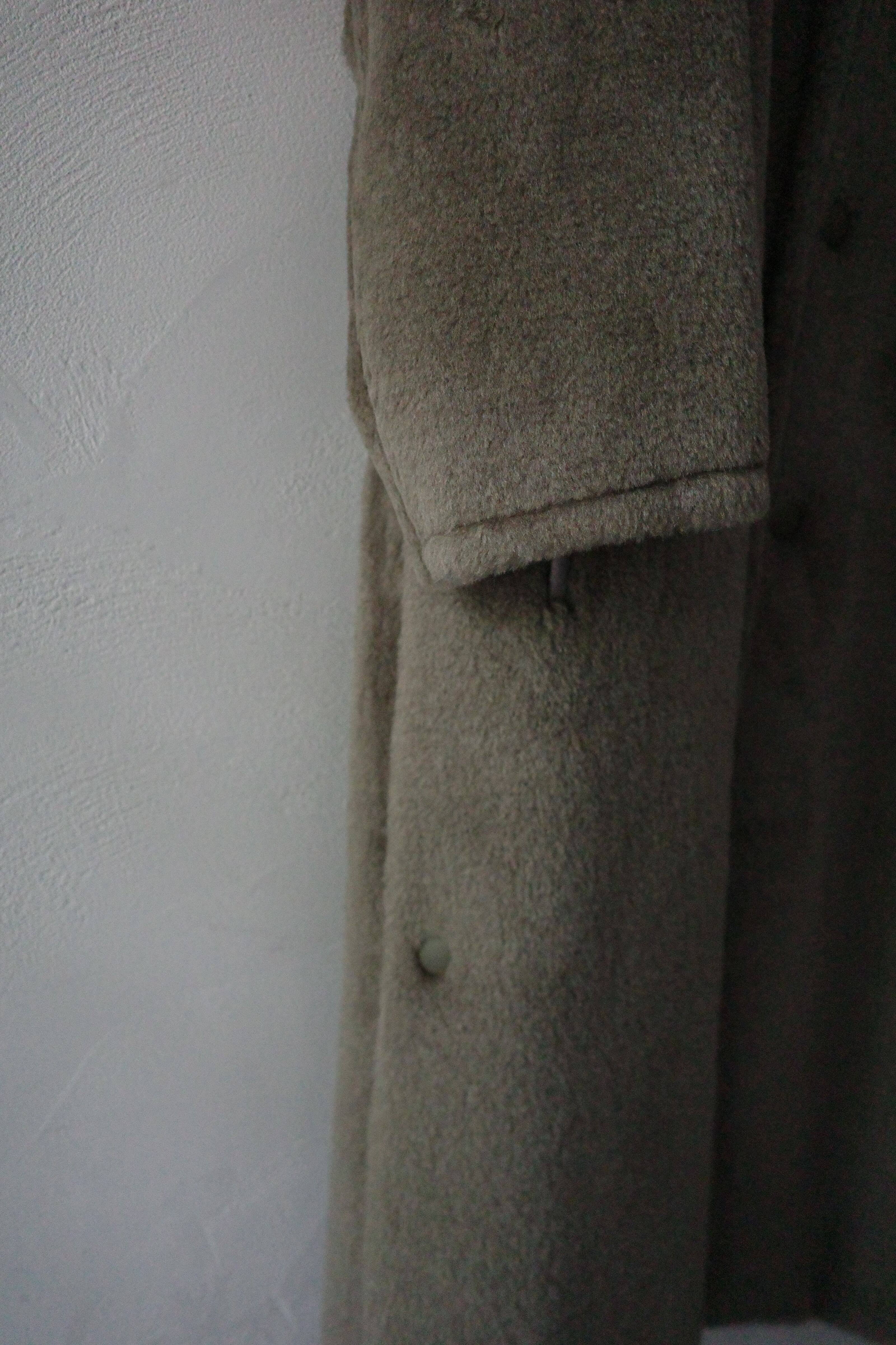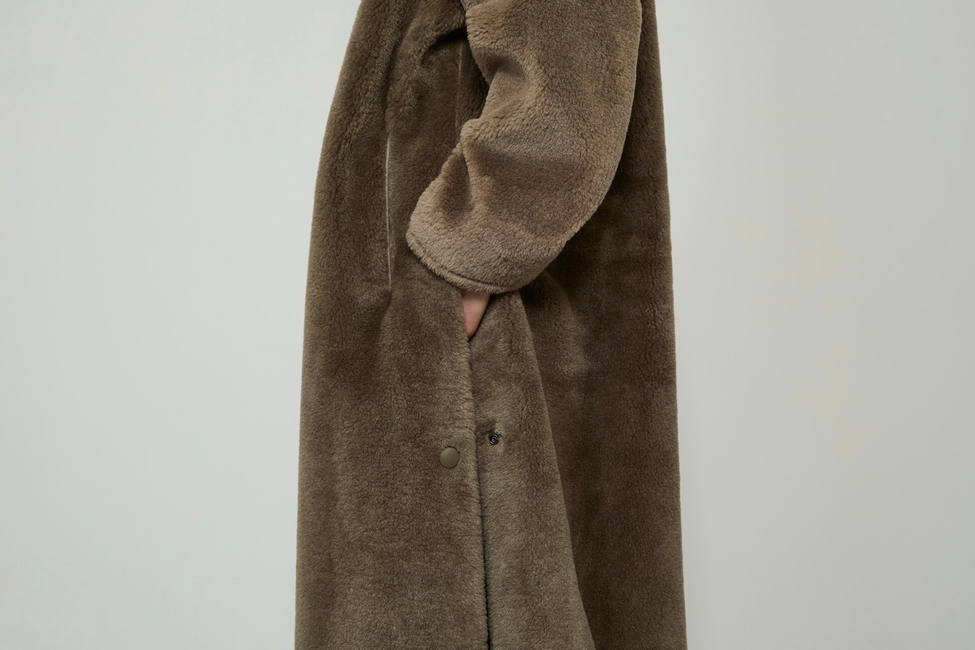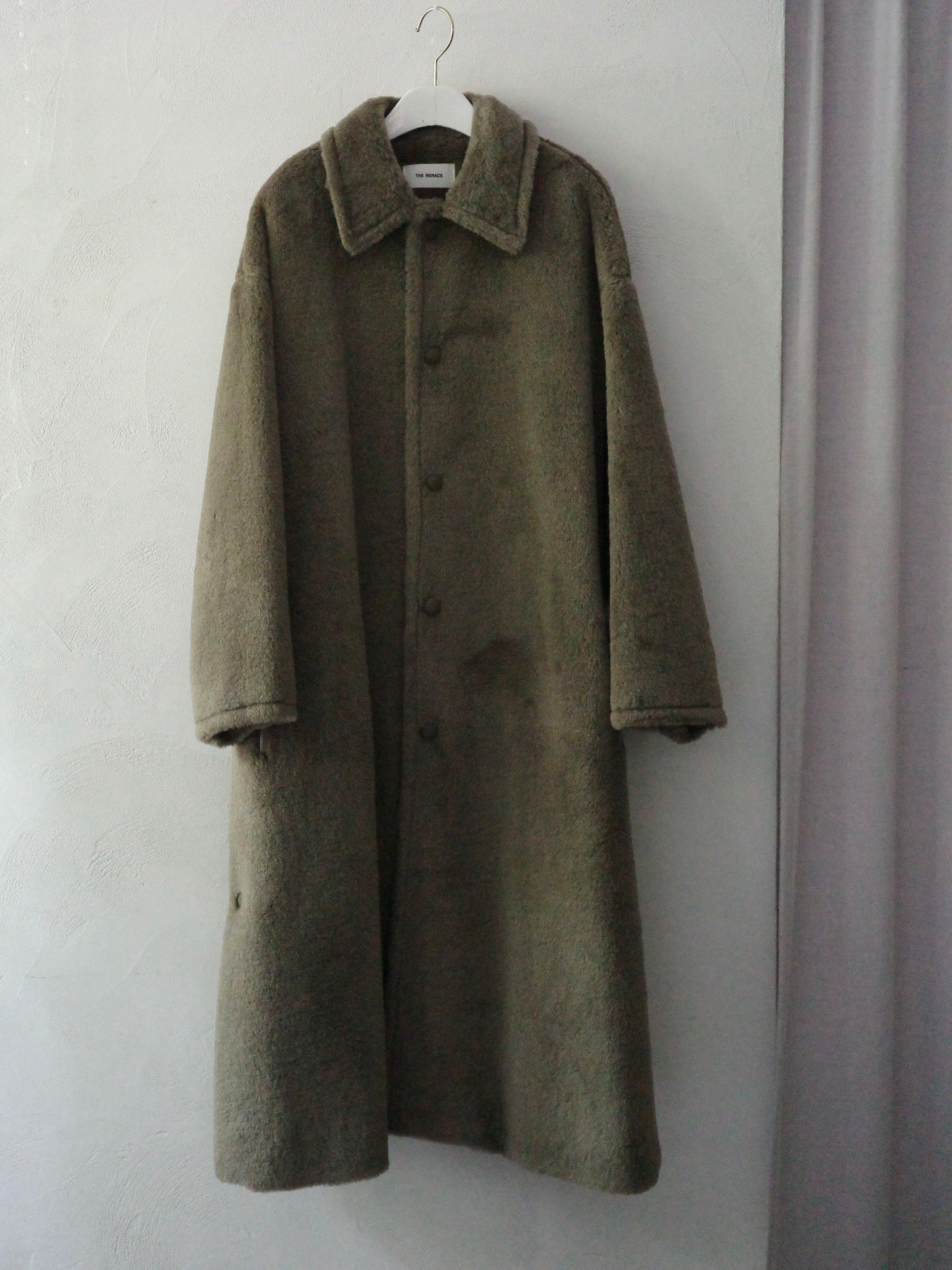 ボアのふんわりとしたシルエットと、襟元のバルカラーがデザインとフロントに施されたドットボタンが特徴的な1枚。厚みのある生地を使用しているコートの為、肩のラインを下げ、腕や胴回りにゆとりをもたせることで着用時の圧迫感が少なく、袖通りの良い設計です。ウールとシルクをブレンドした素材を使用し、ボリュームと弾力がありながらも軽い風合いに仕上げています。また厚みのある生地に対し、ボタンで調節可能なスリットをいれることで動きを出すなど、ラグジュアリーなデザインと実用性のバランスを取る為の工夫が組み込まれたTHE RERACS定番のバルカラーコートを再構築した1枚です。