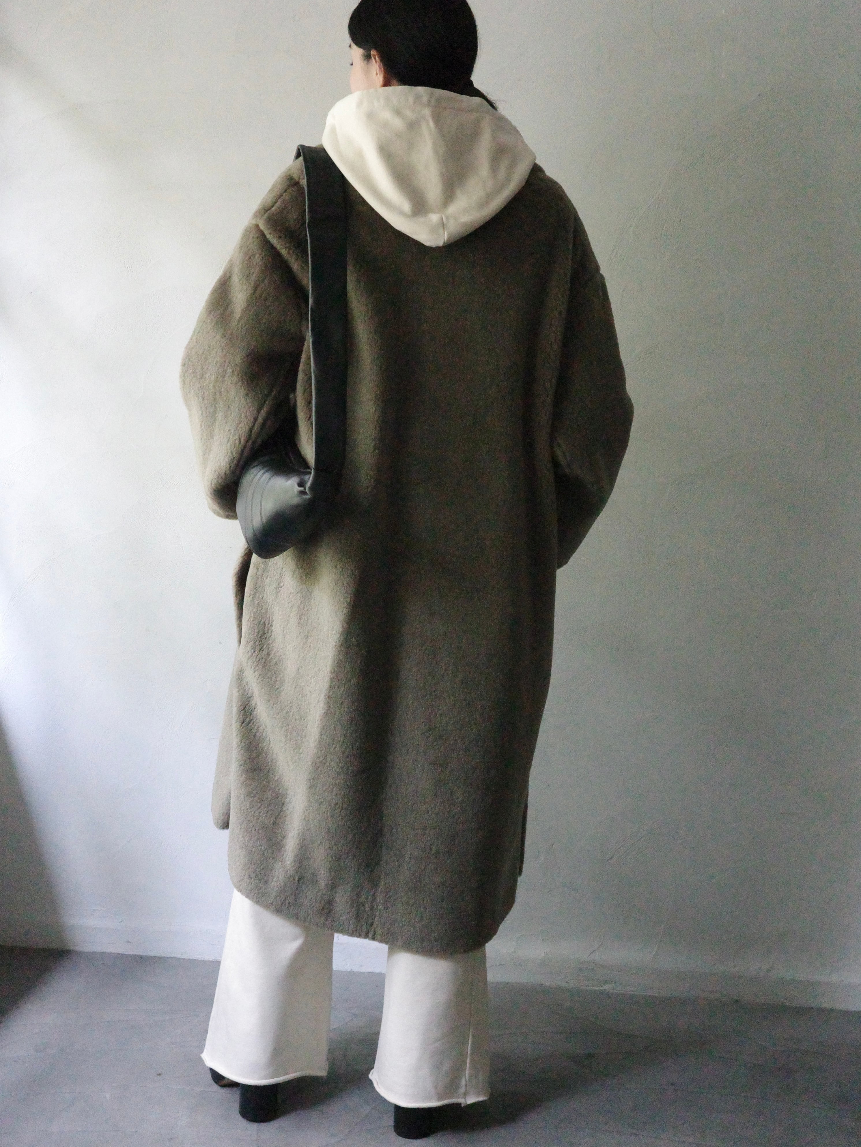 19.5マイクロンのメリノ羊毛の原綿とシルクをブレンドしたウールシルクボア素材。スライバーニットで編み立て、根元から綿(ワタ)の状態で成形されている為、ボリュームと弾力がありながらも軽く仕上げています。空気層がボア部分に出来る為、保温性にも優れています。オリジナルの長さにカットすることで軽やかかつ保温性に優れたRERACS定番のオリジナル素材です。今期はシルクをブレンドする事で、奥から放たれる素材自体の滑らかな肌触りとなり、光沢感がラグジュアリーさを演出します。