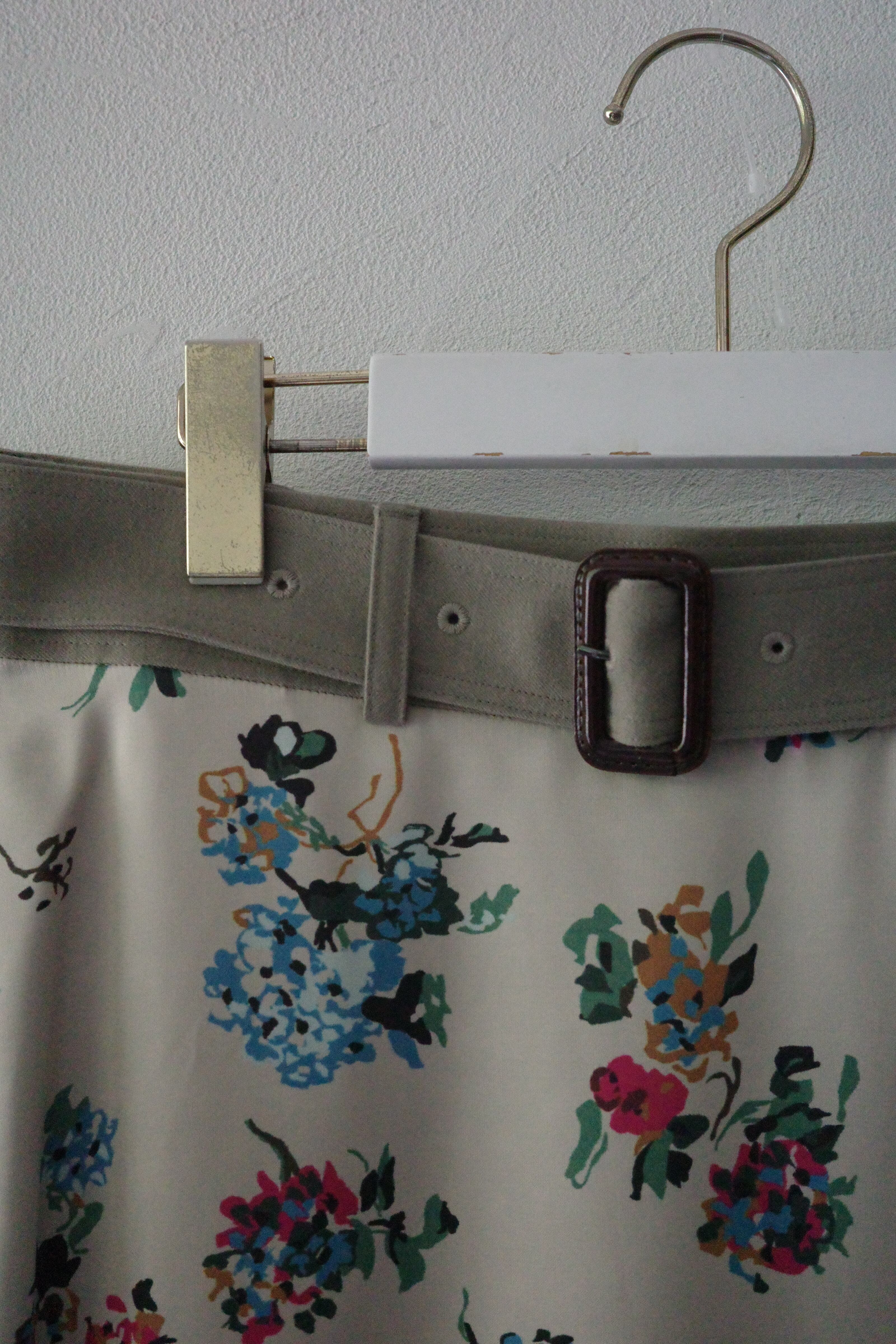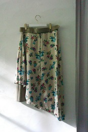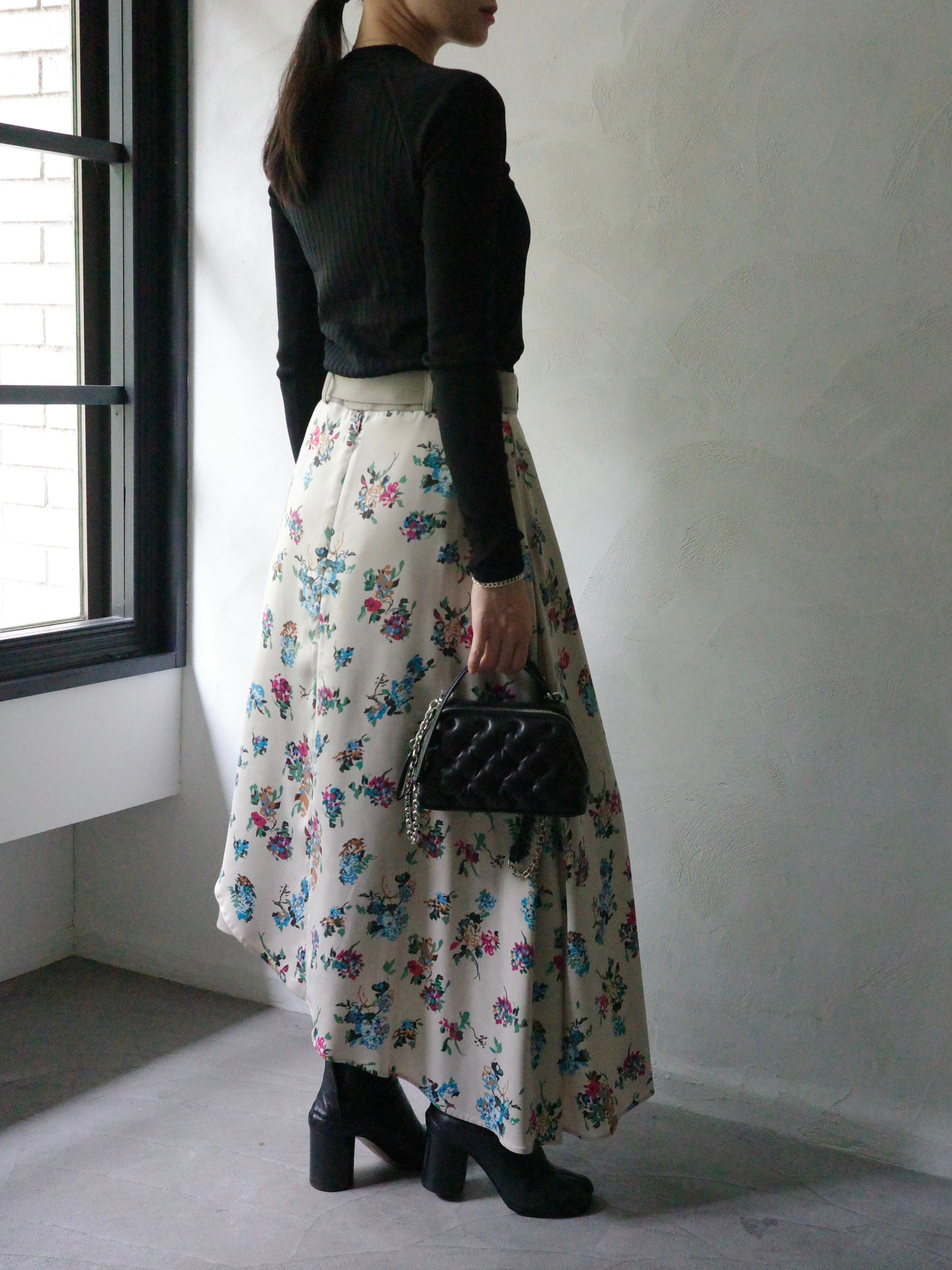 上品な花柄と、リラクスらしい構築的なシルエットが融合したアシンメトリースカート。