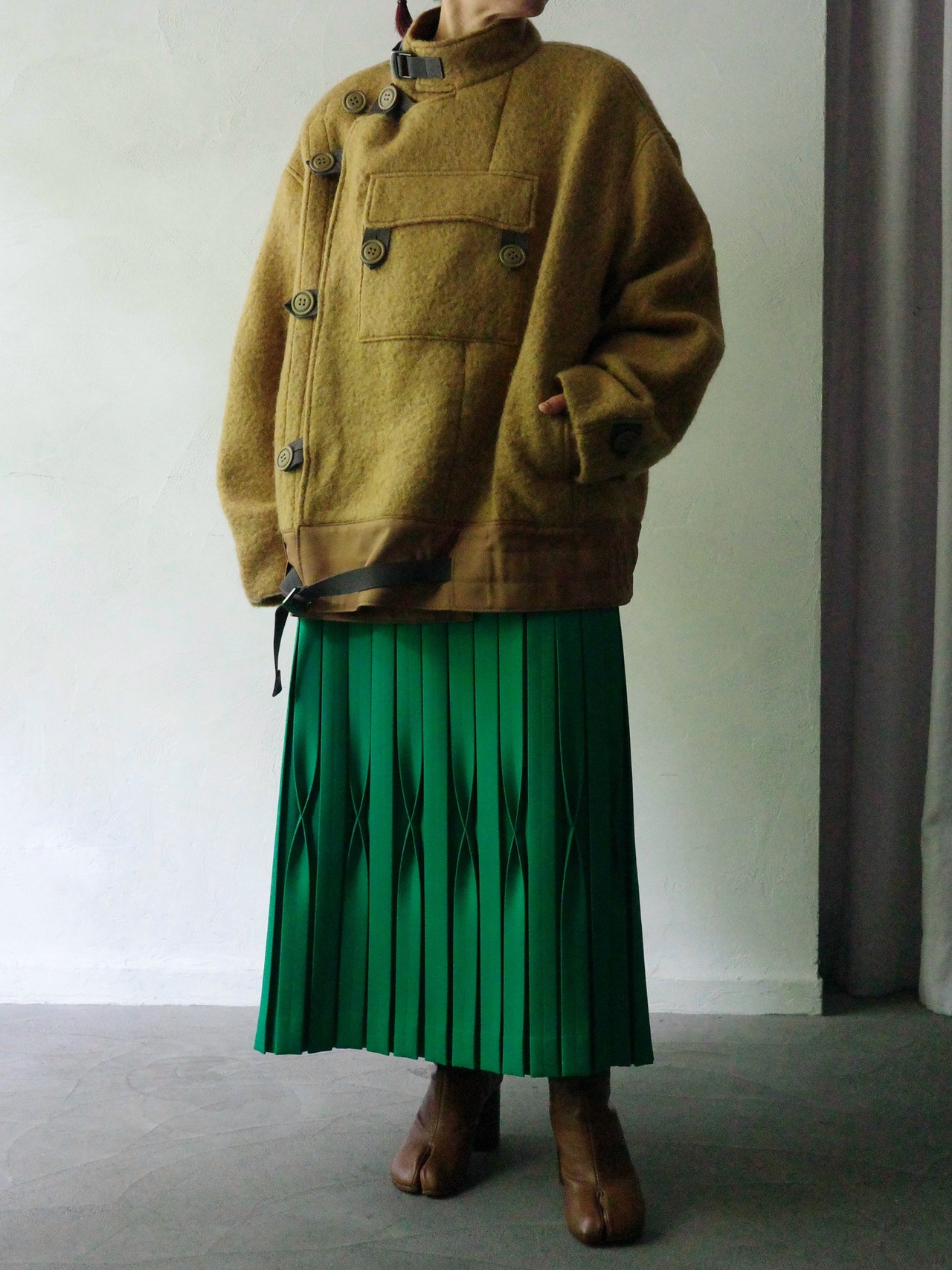 アシンメトリーなフロントスタイルや大きめなポケットが印象的です。
