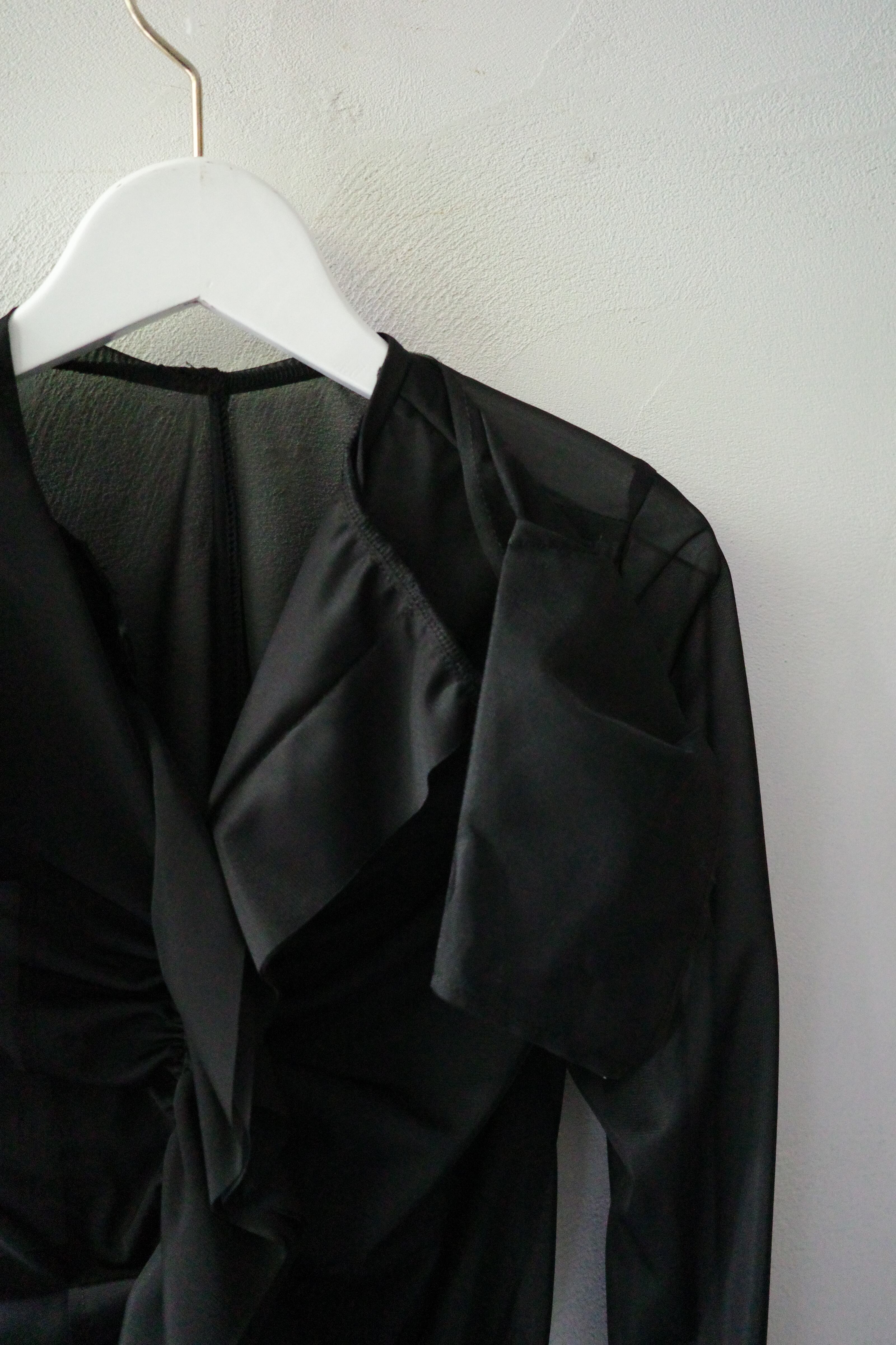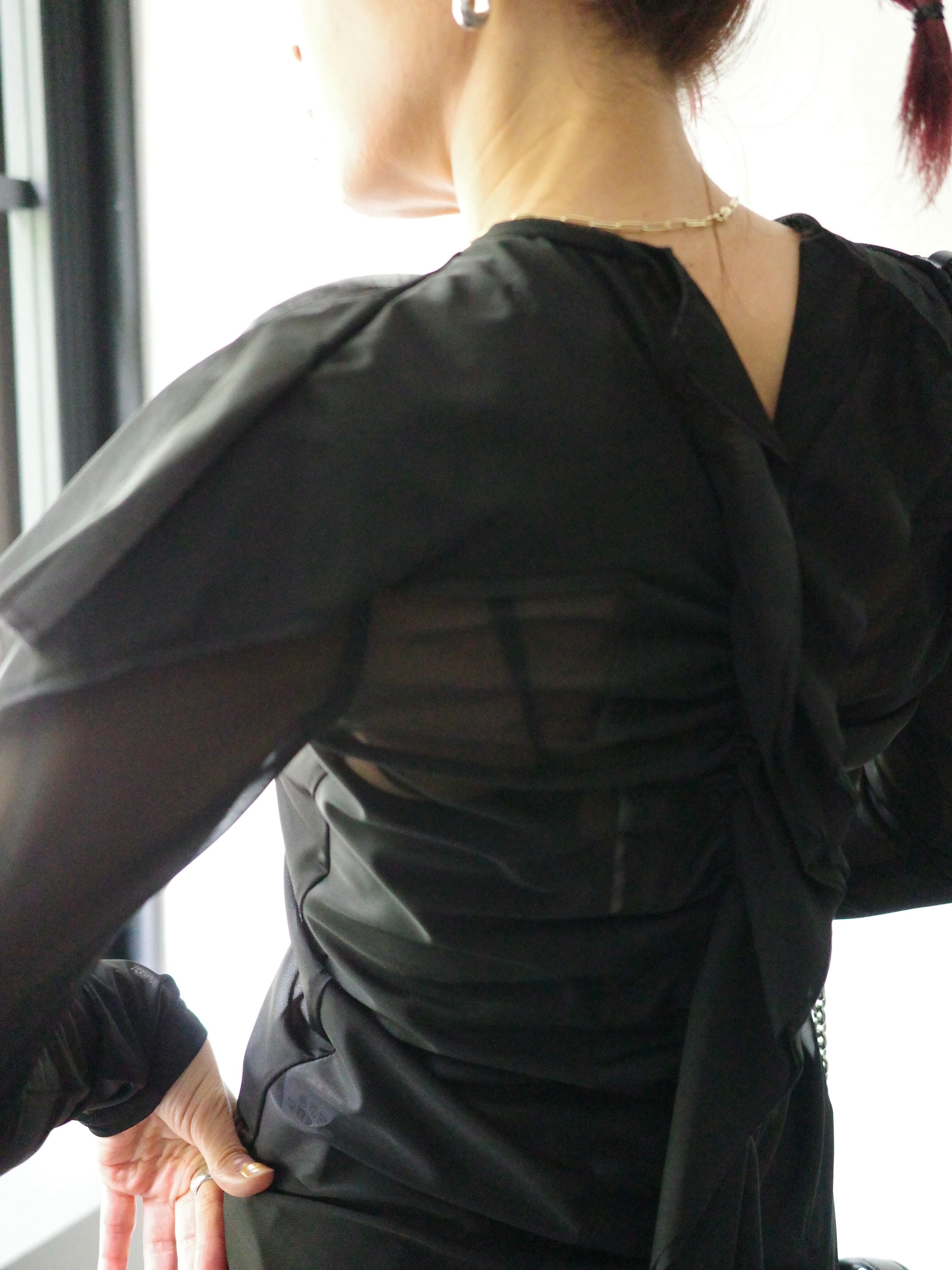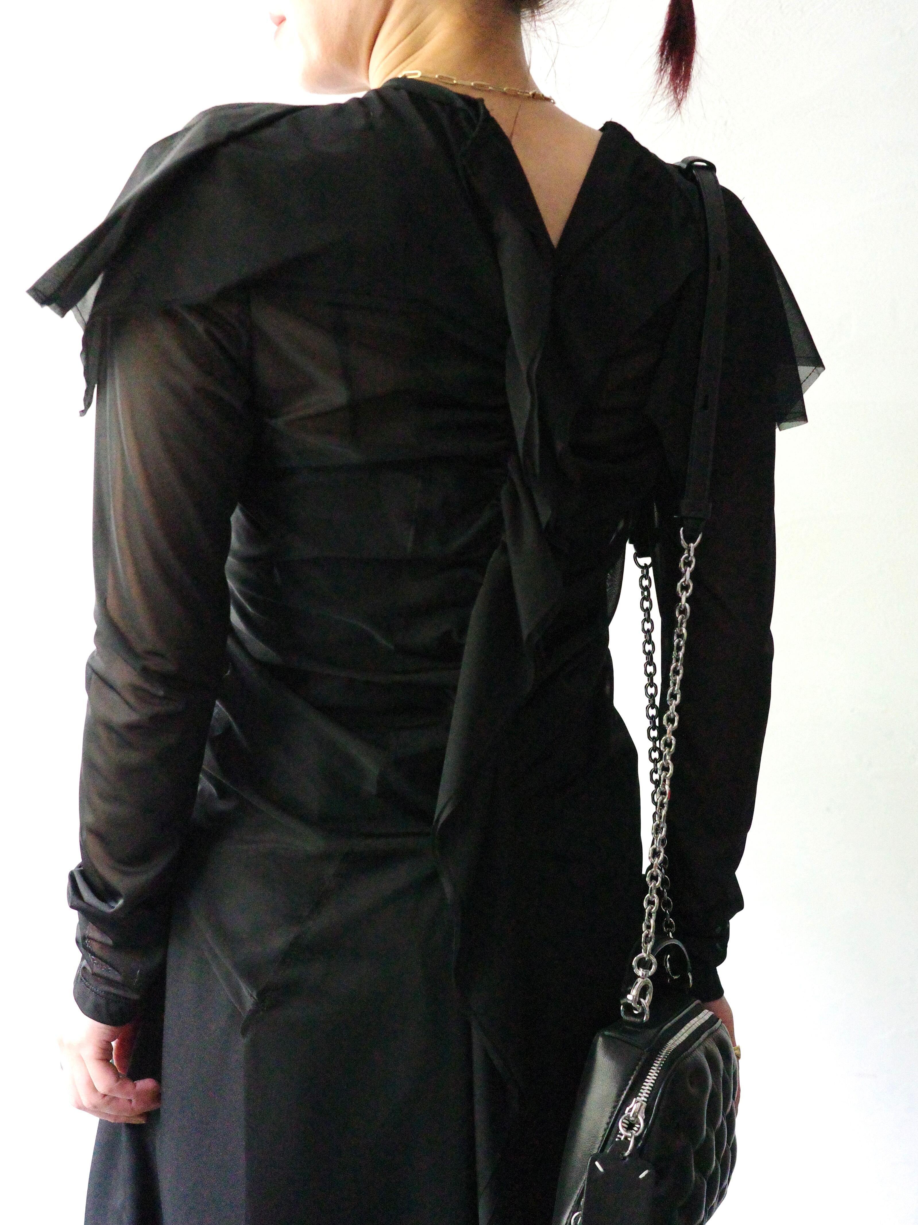魚の尾びれのような背中や外側に跳ねた肩布の造形が特徴の、チュール素材のトップス。