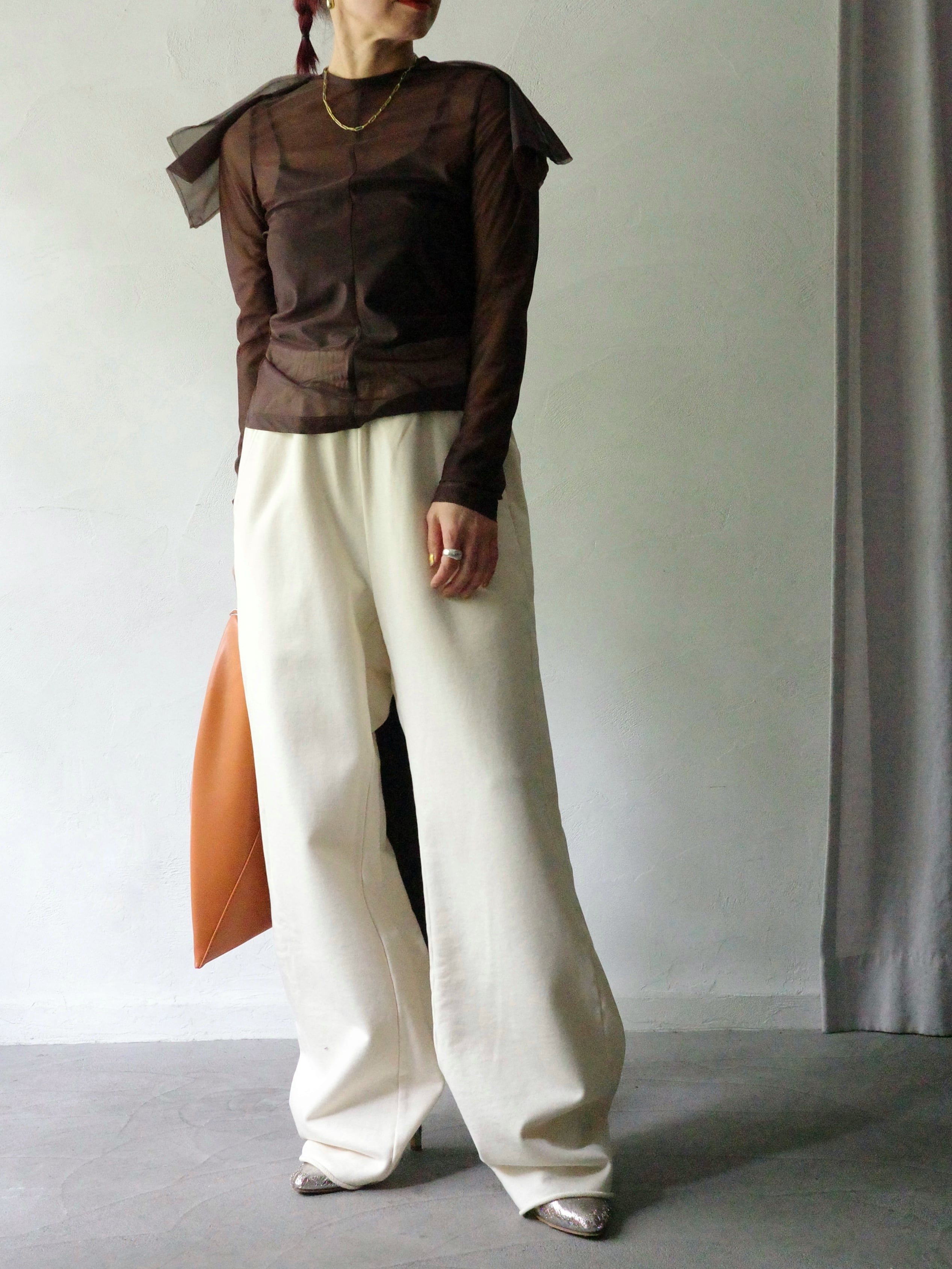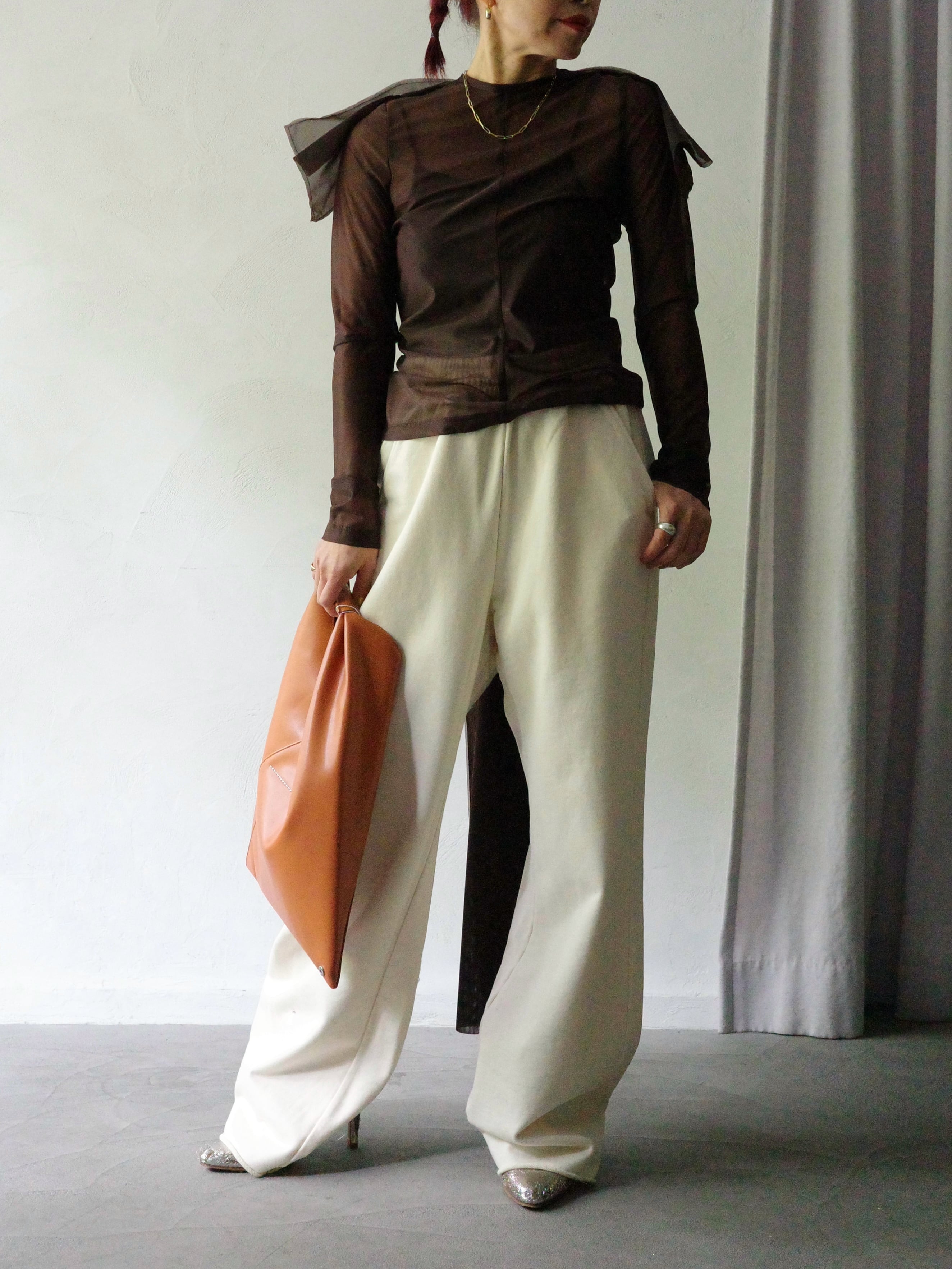 ドレスを着る機会はあまりないが、ドレッシーな服をパンツと合わせて街中で着るのは良しとする東京の女性たちからインスピレーションを得て制作された一枚。