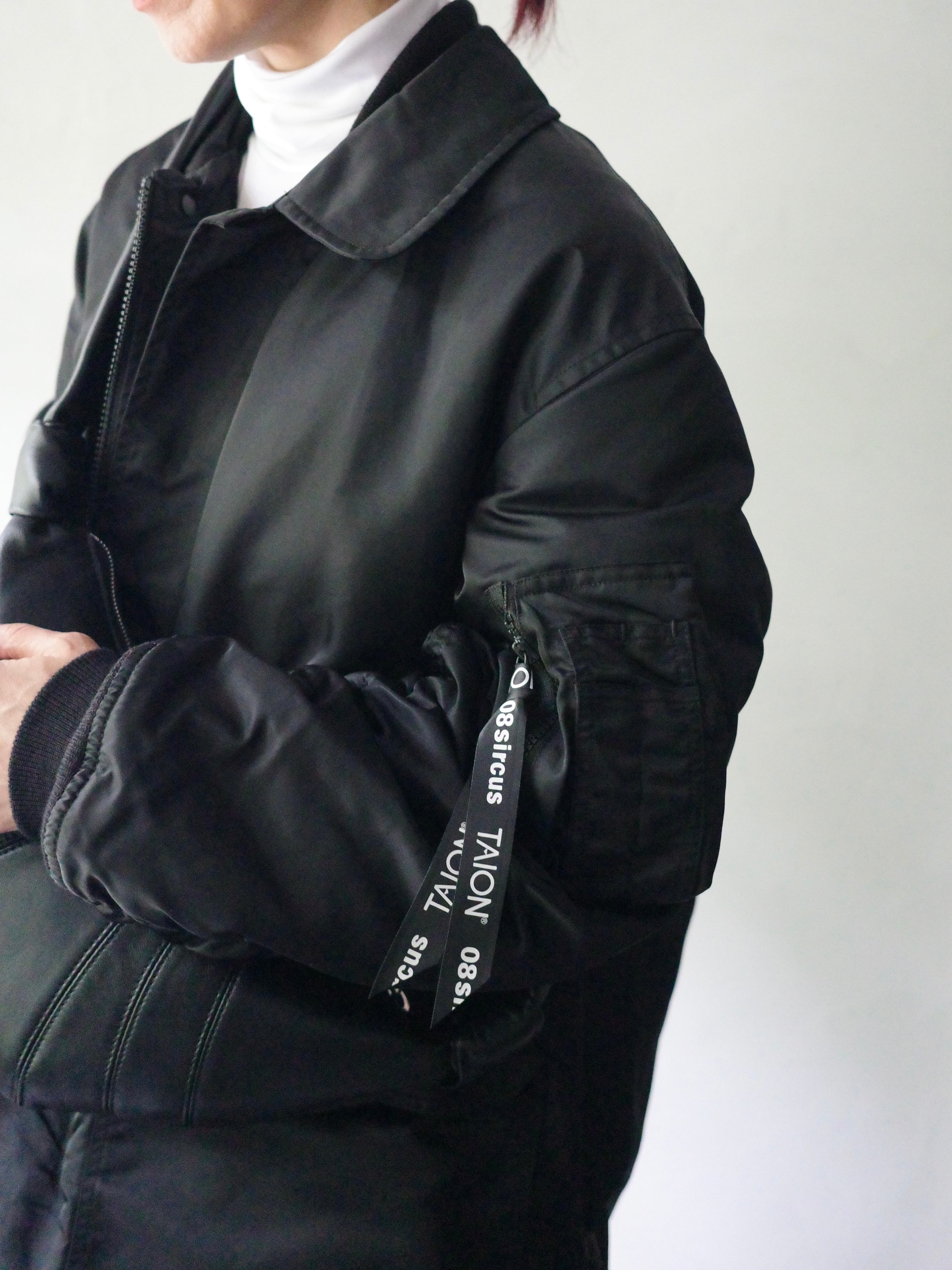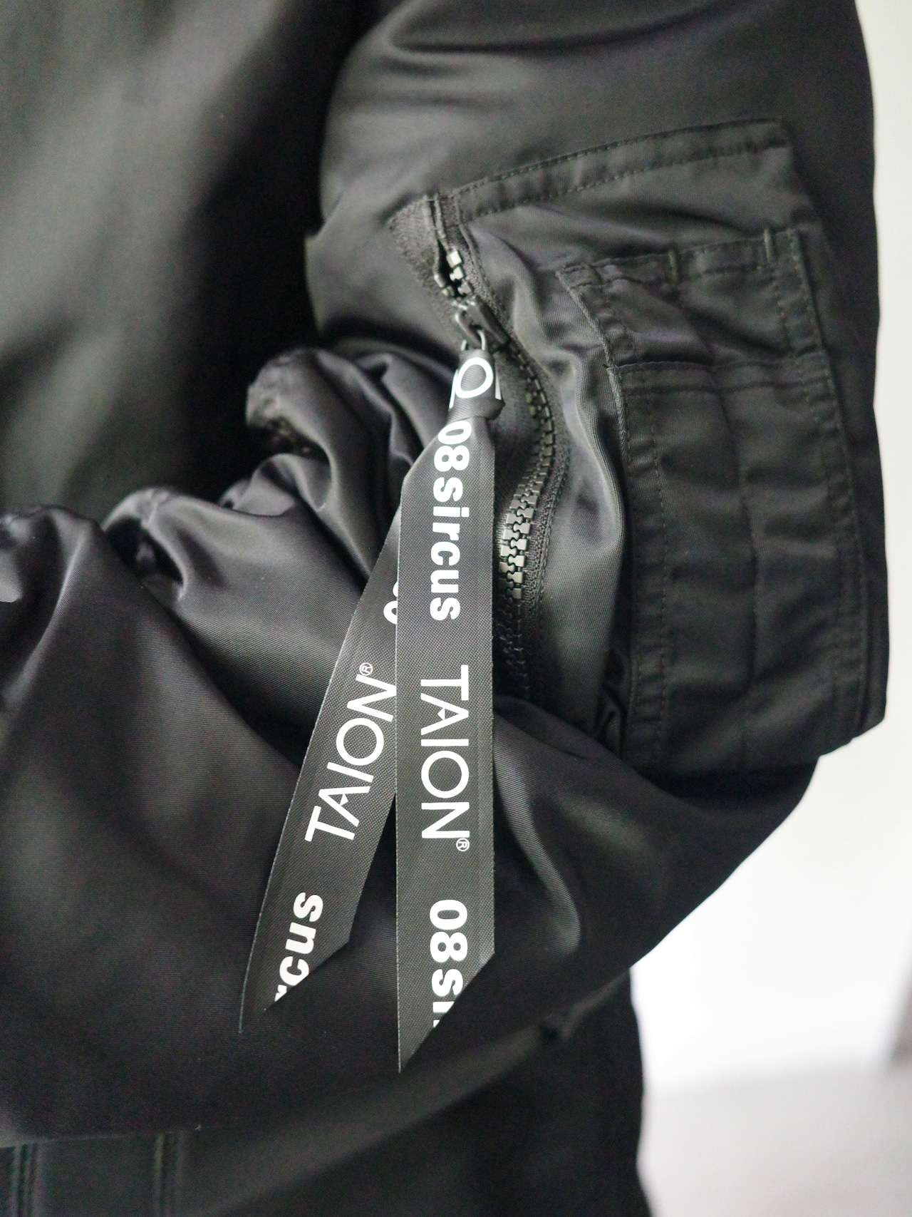 08sircusのアイコニックなアイテムにTAIONの高機能なダウンを内包することで、モードな表情と軽やかな防寒性を両立させたデザインにアップデート。