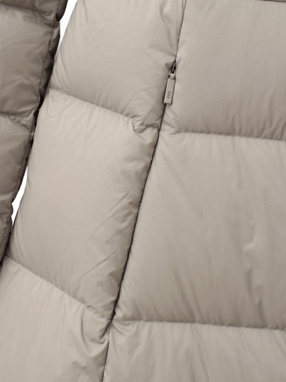 ナイロン100%の生地に軽く撥水加工を施した生地で仕上げたダウンジャケット。膝下丈の少し長めのロング丈が採用され、フロントはダブルジッパーで上下から開閉できる作りになっています。