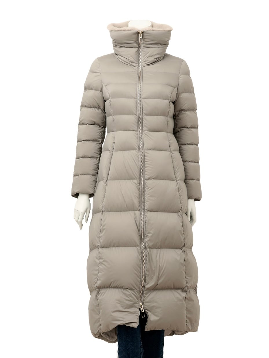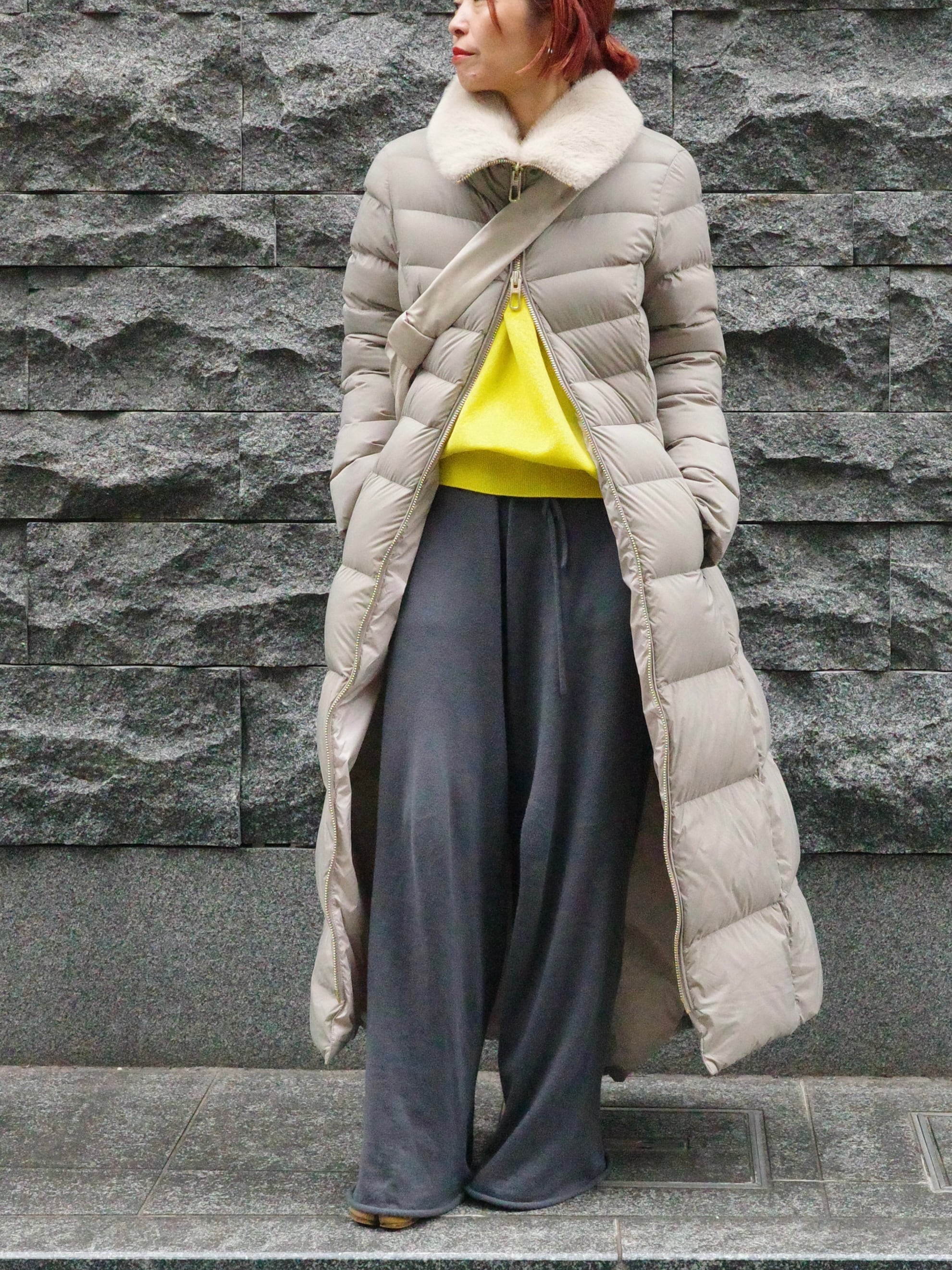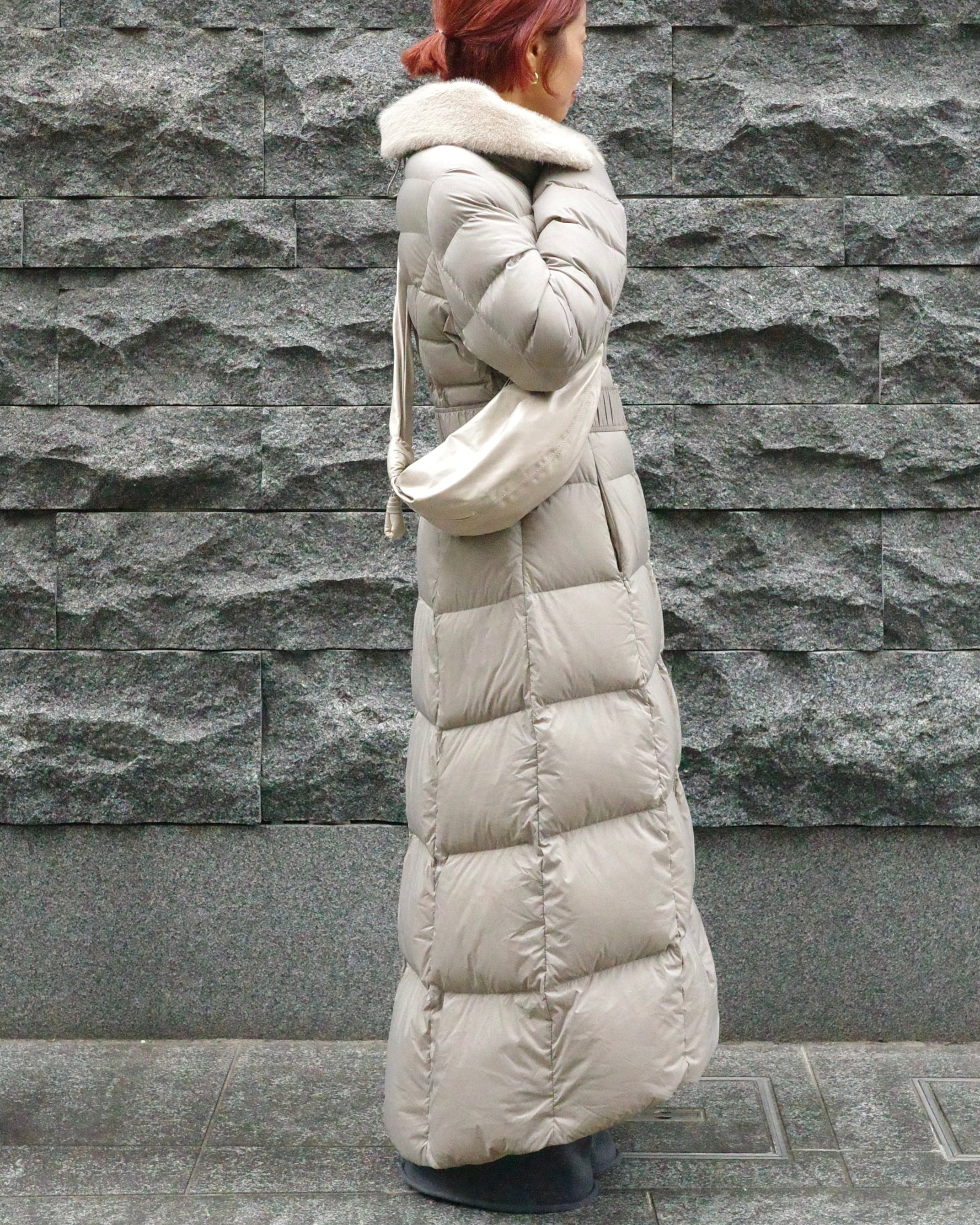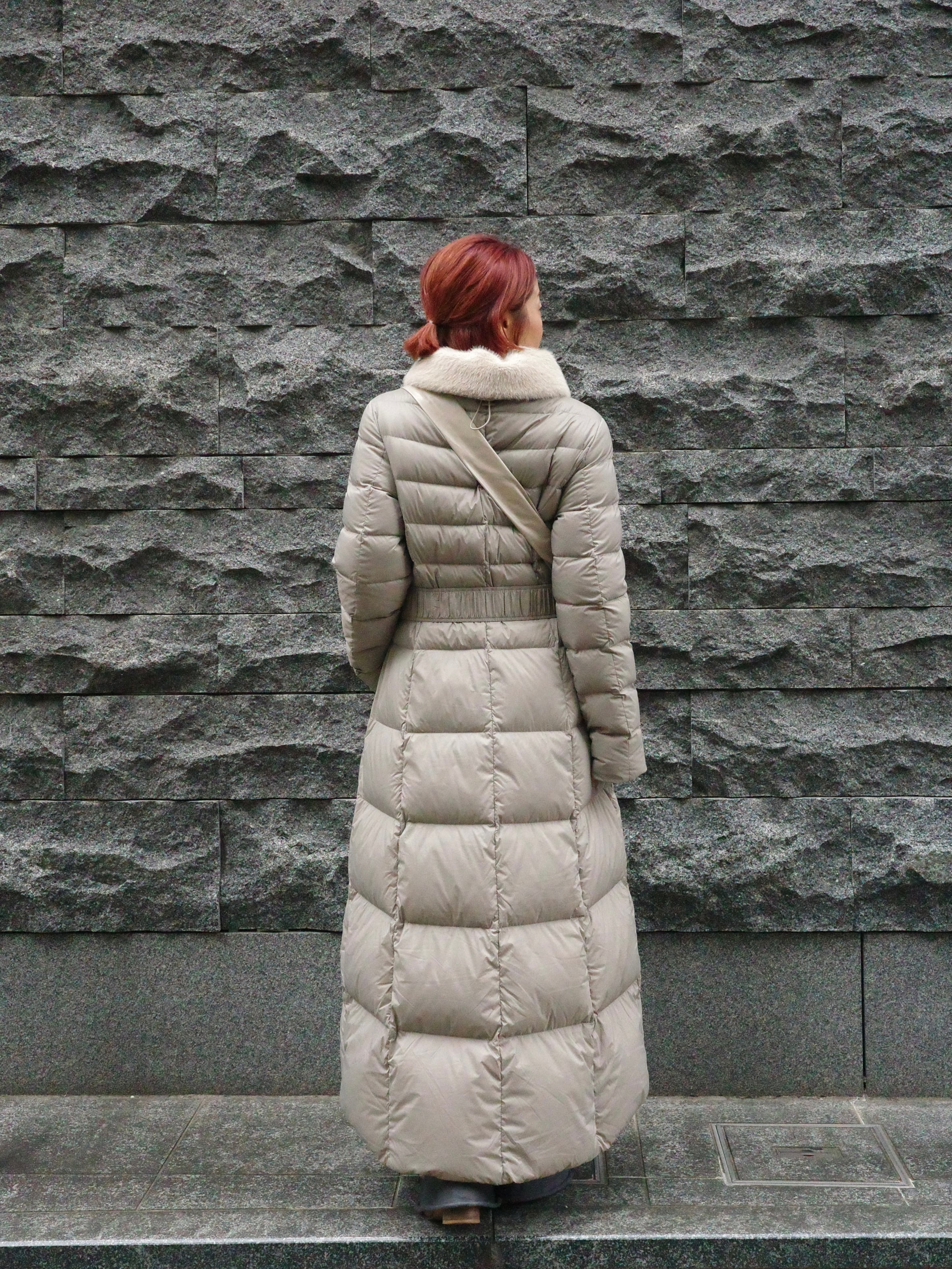 女性らしいウエストラインが美しい暖かなロング丈のダウンジャケット。