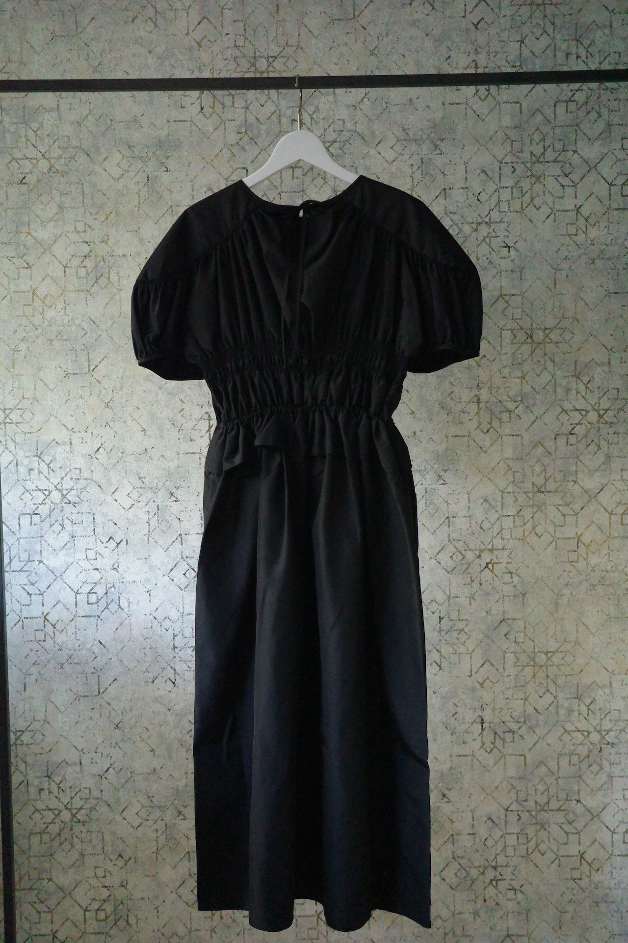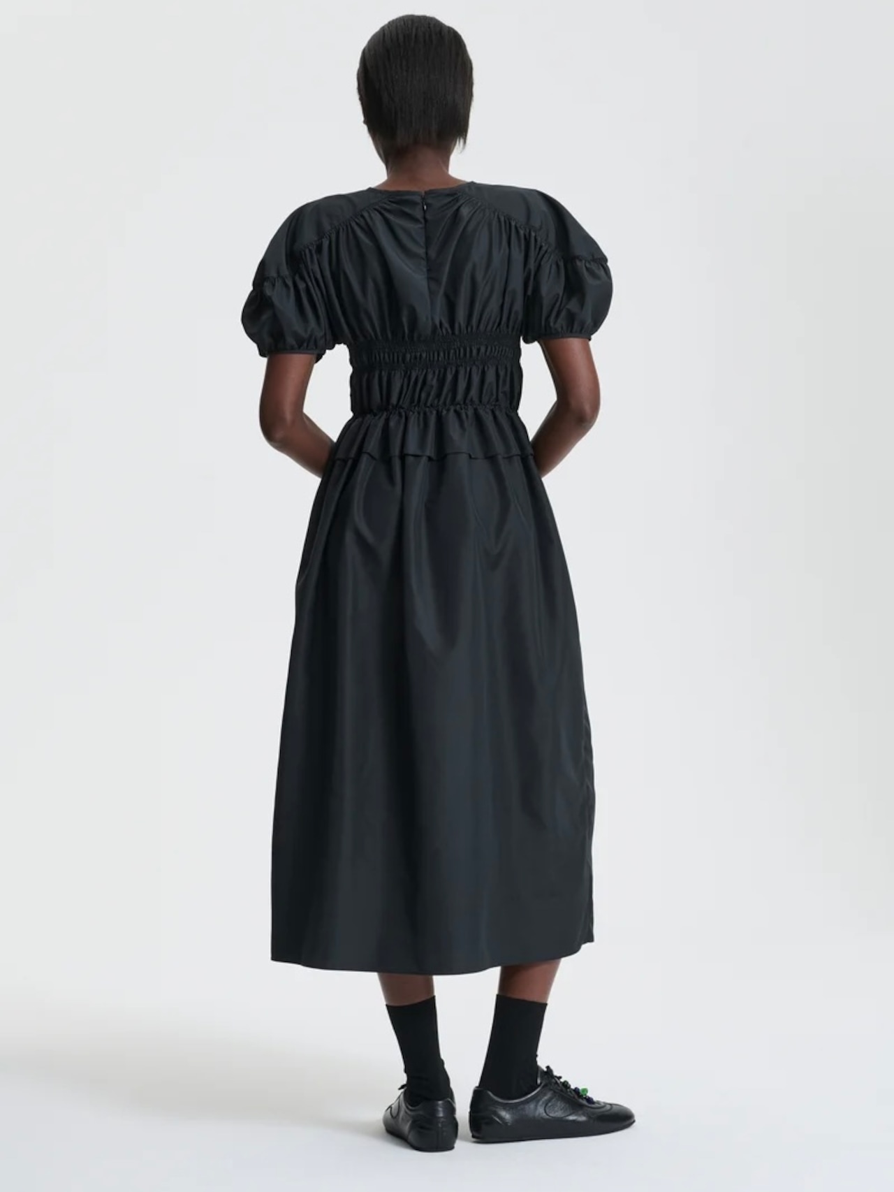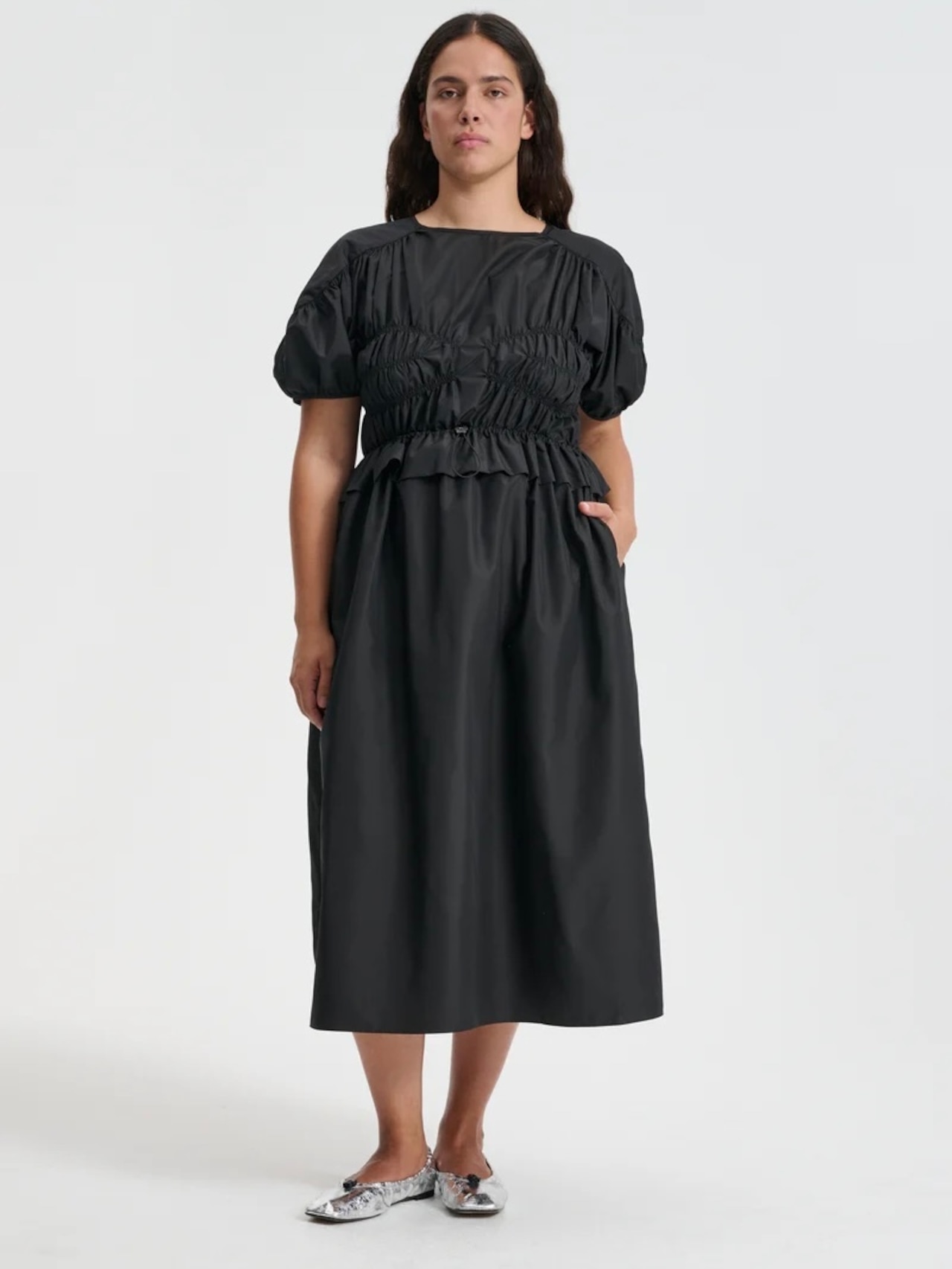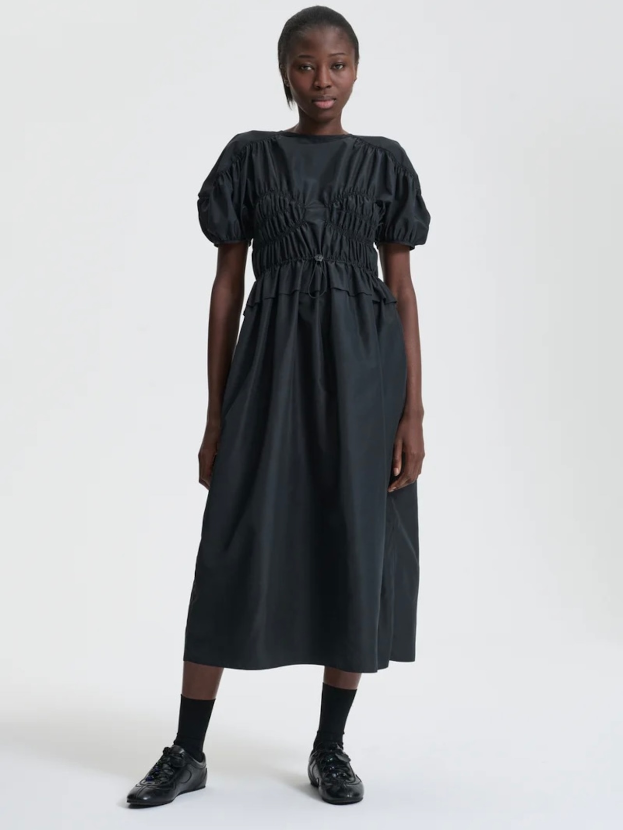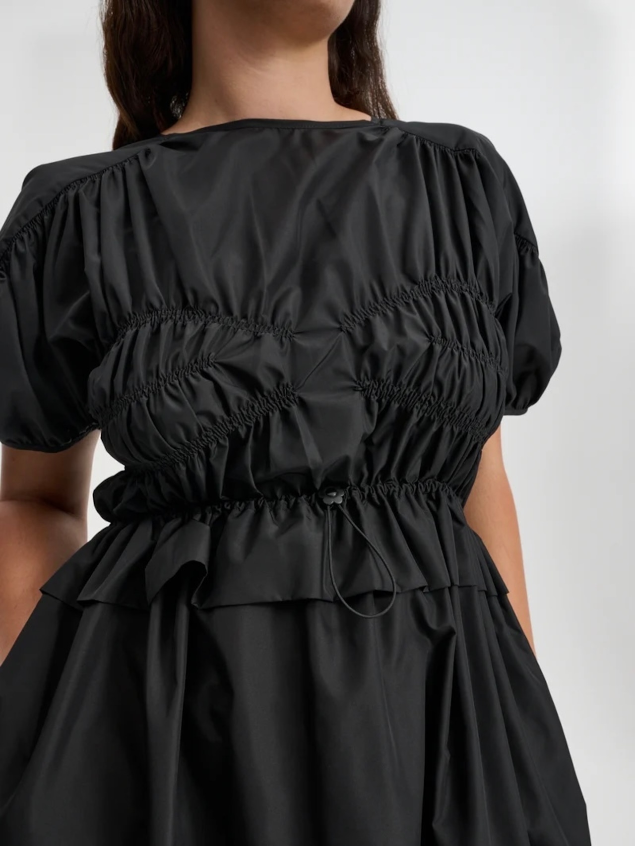 胸元とウエストのゴムシャーリングで緩急のあるシルエットに仕上げた<セシリー バンセン>のドレス。