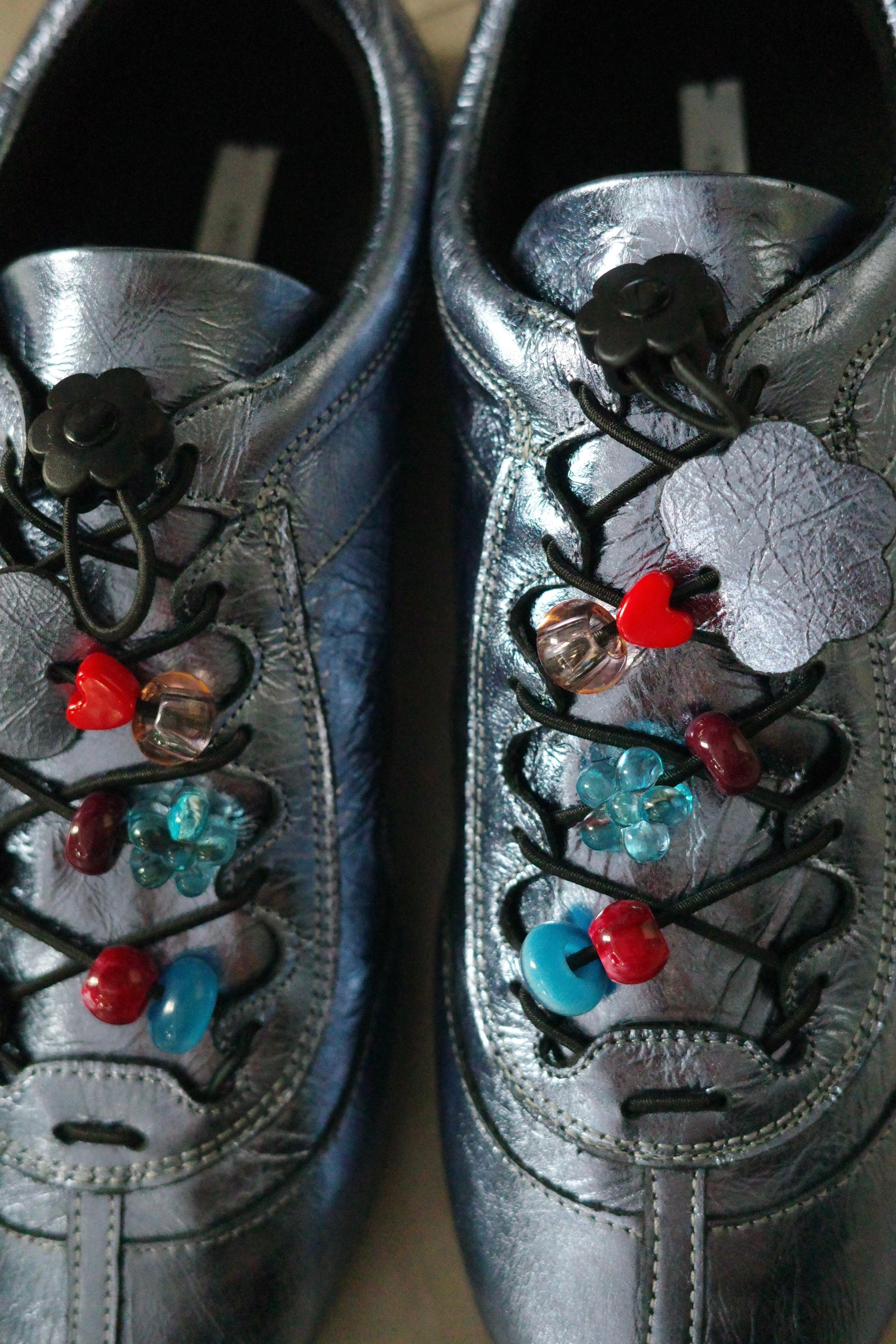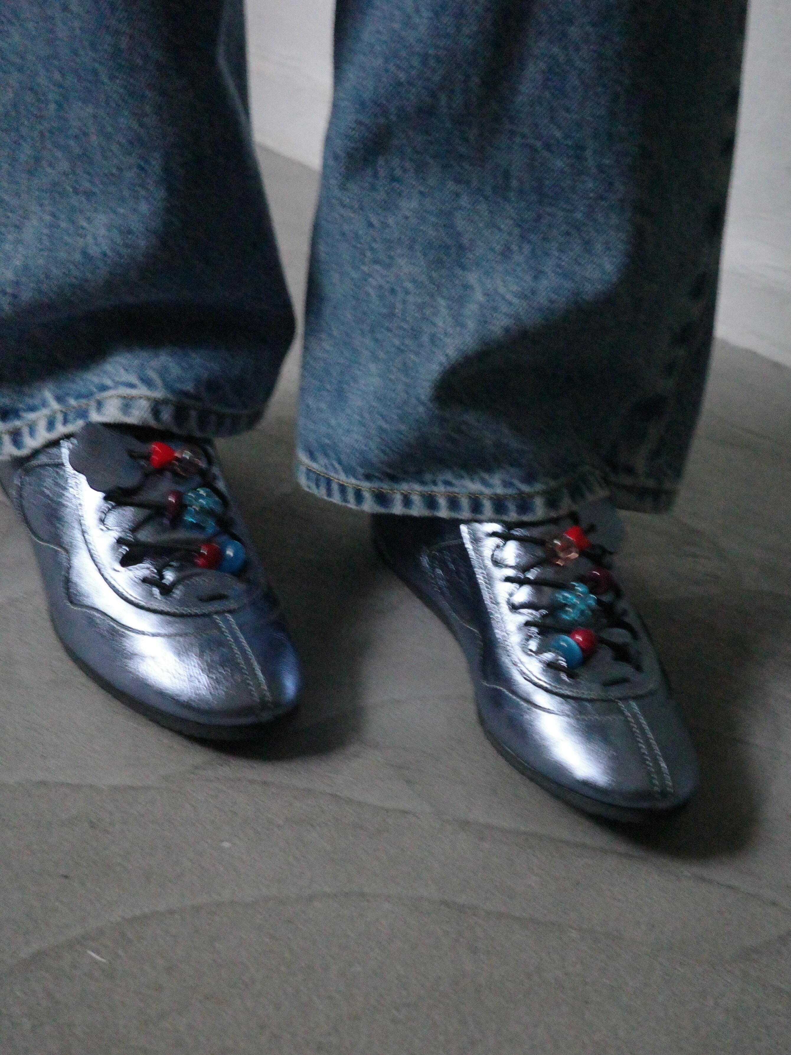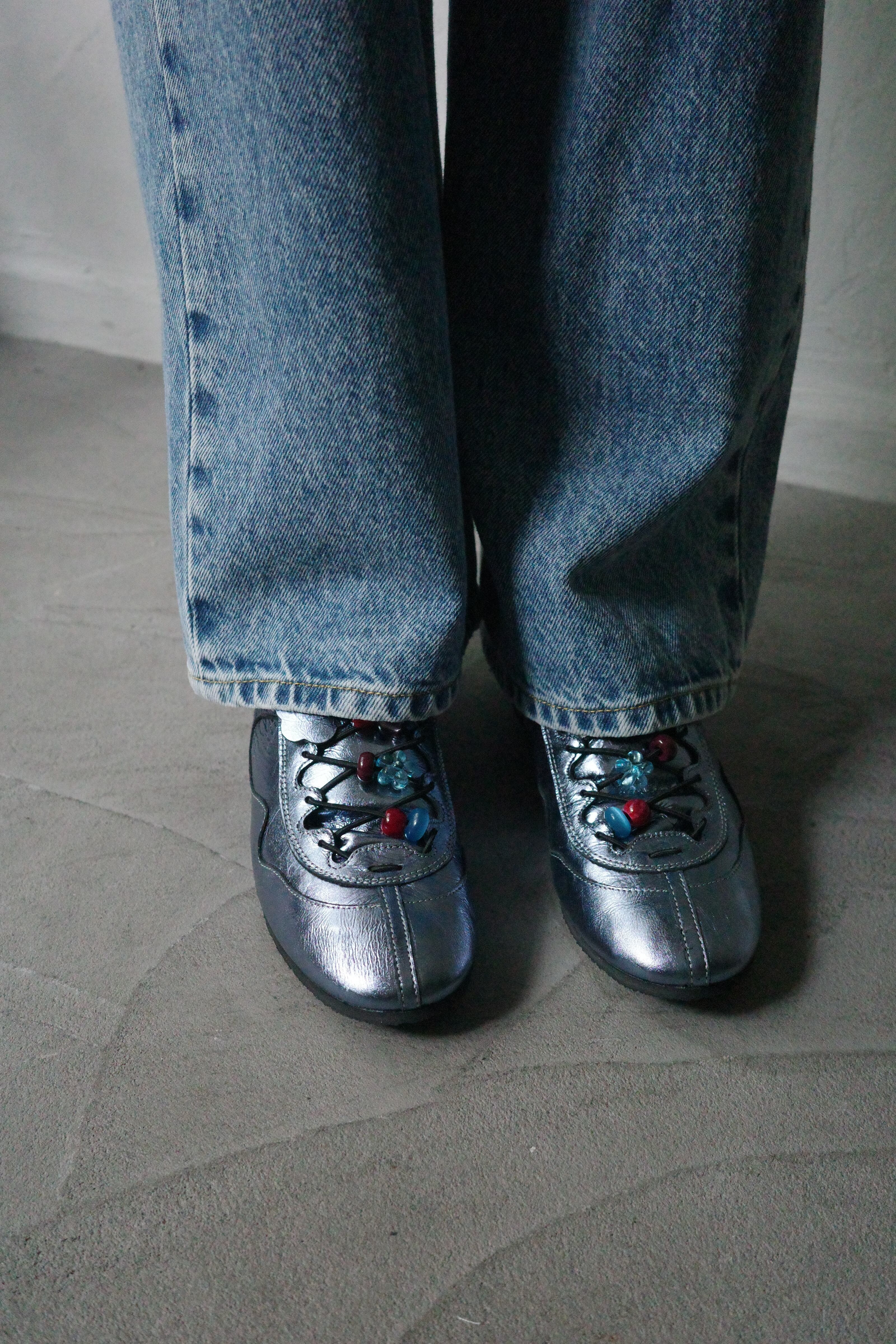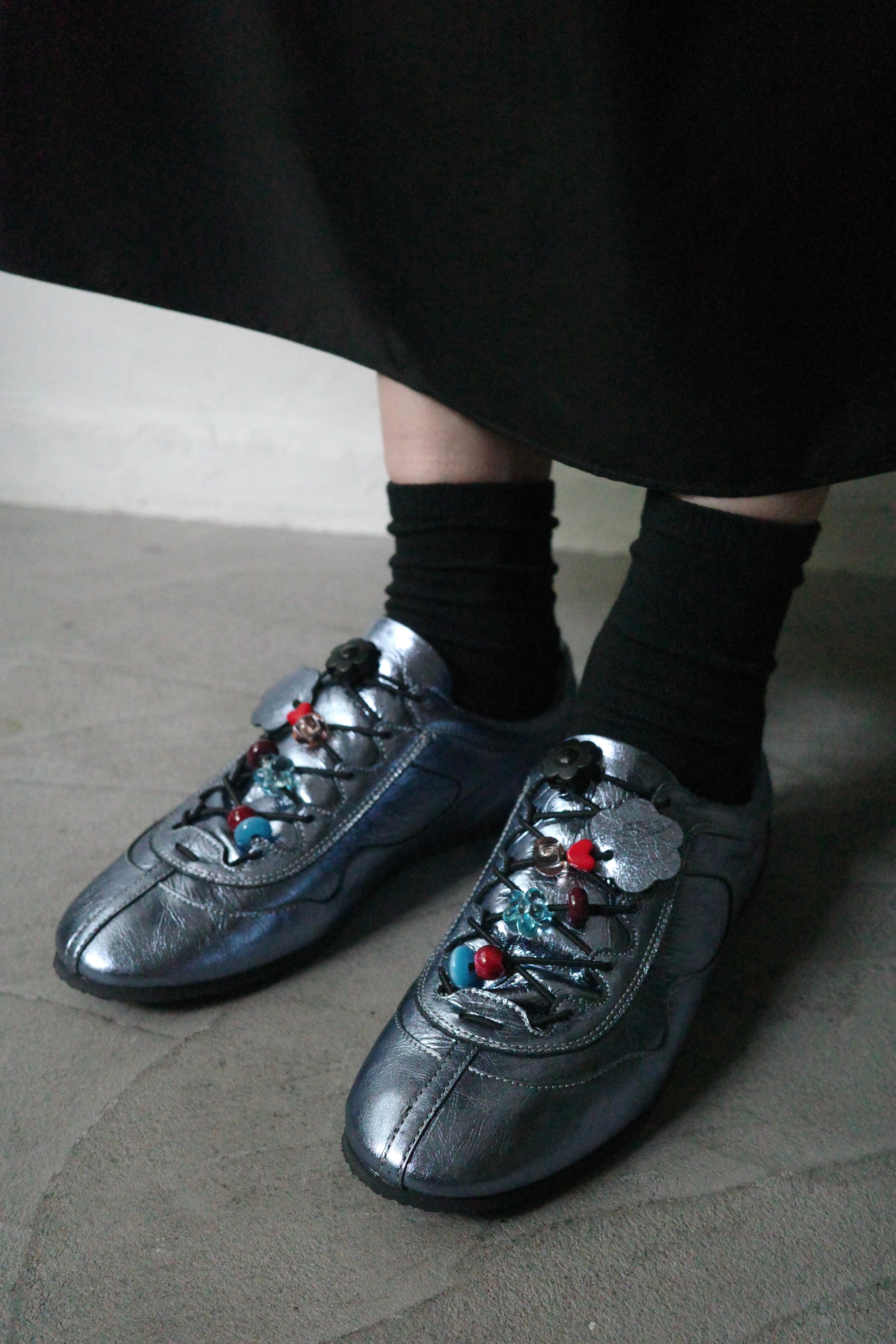 シューレースのフラワー型ストッパーに加え、甲部分をポップに彩る愛らしいビーズパーツがノスタルジーなアクセントを利かせます。
