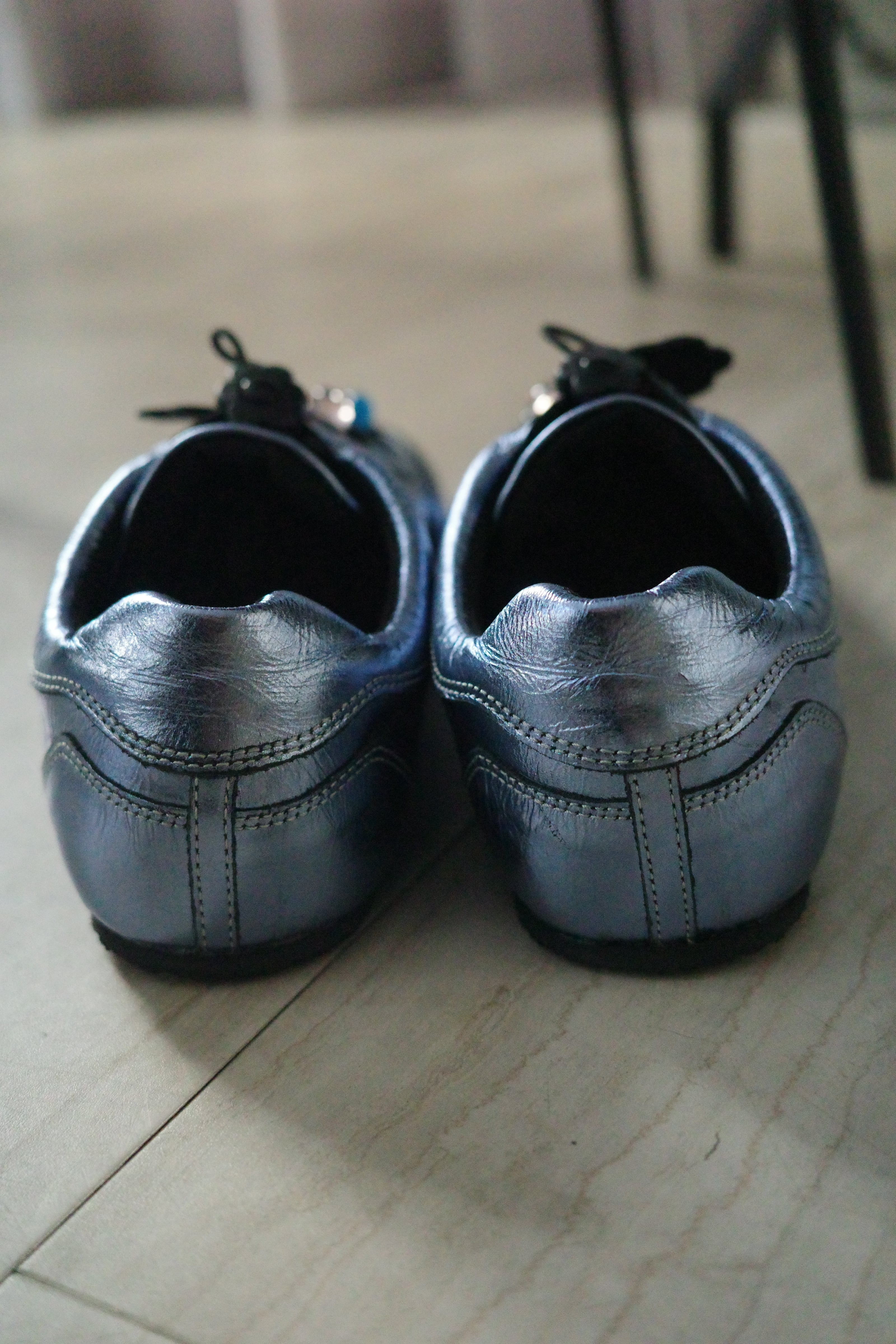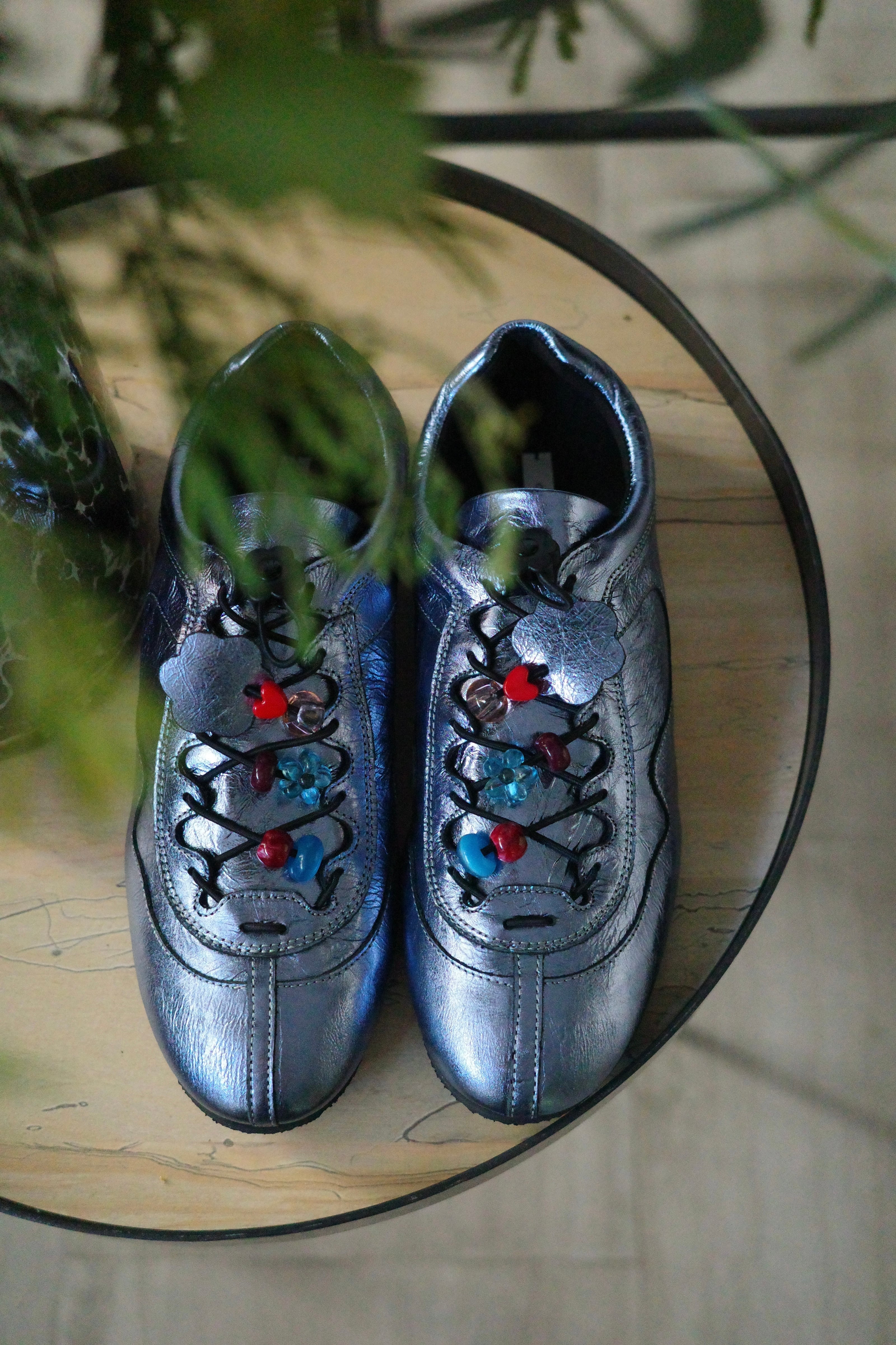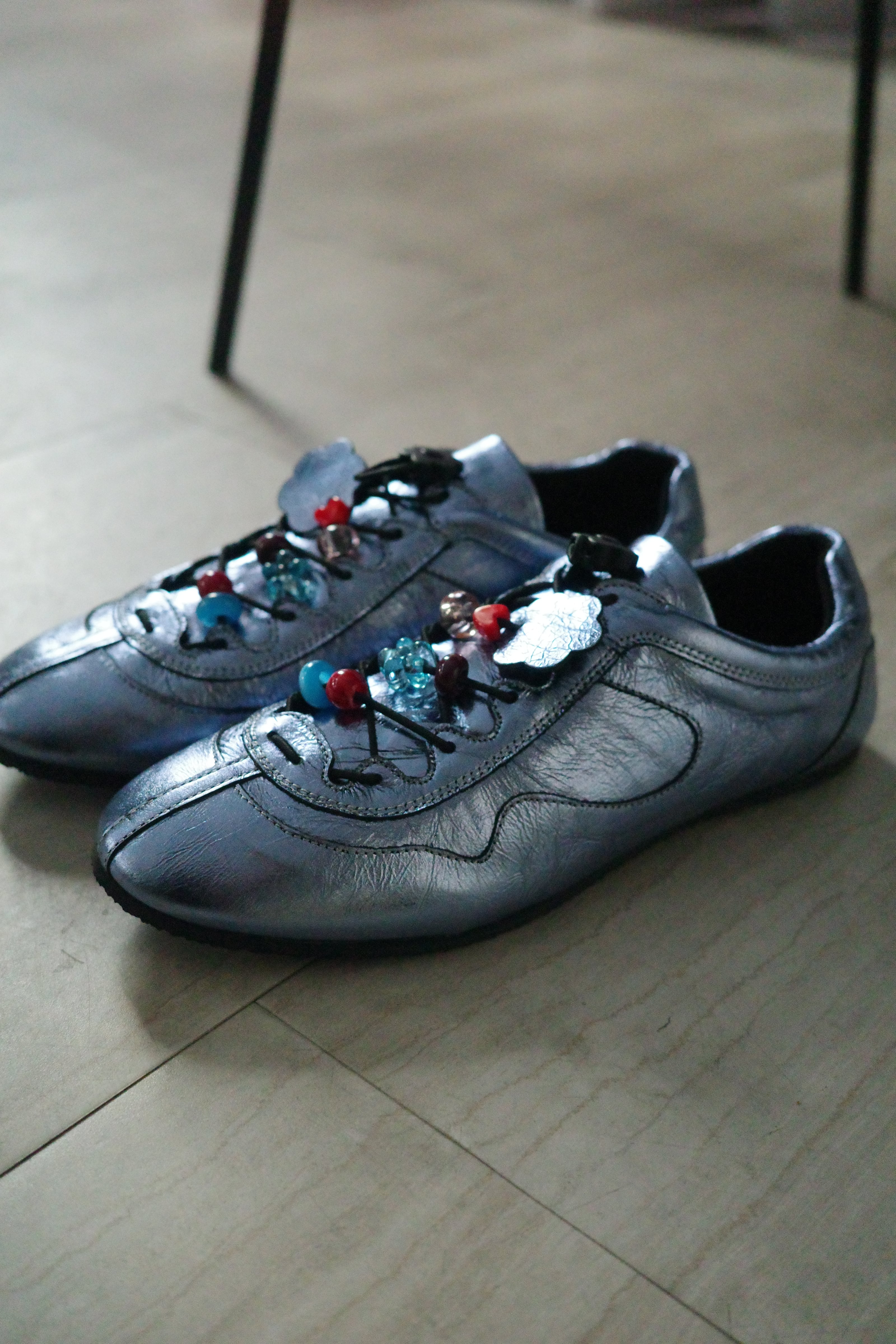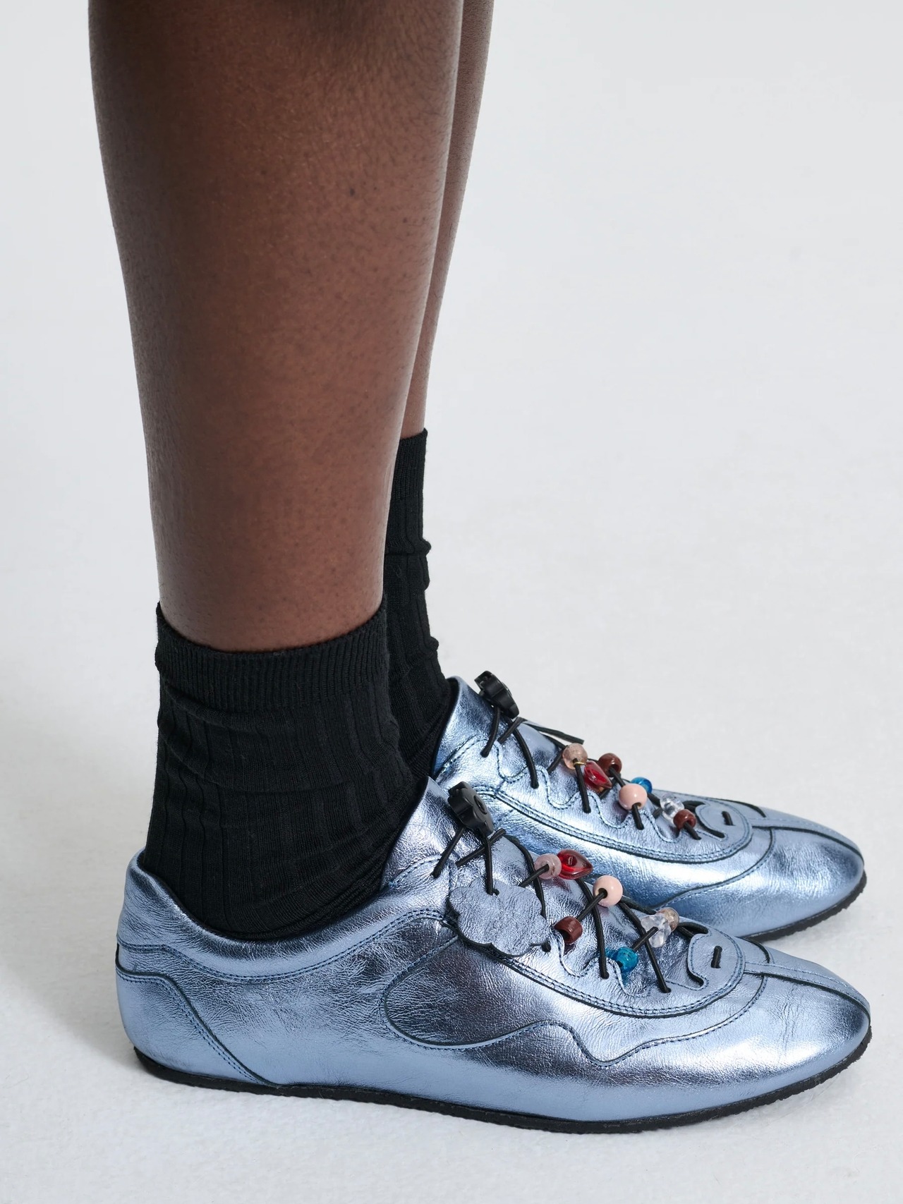 シューレースのフラワー型ストッパーに加え、甲部分をポップに彩る愛らしいビーズパーツがノスタルジーなアクセントを利かせます。
