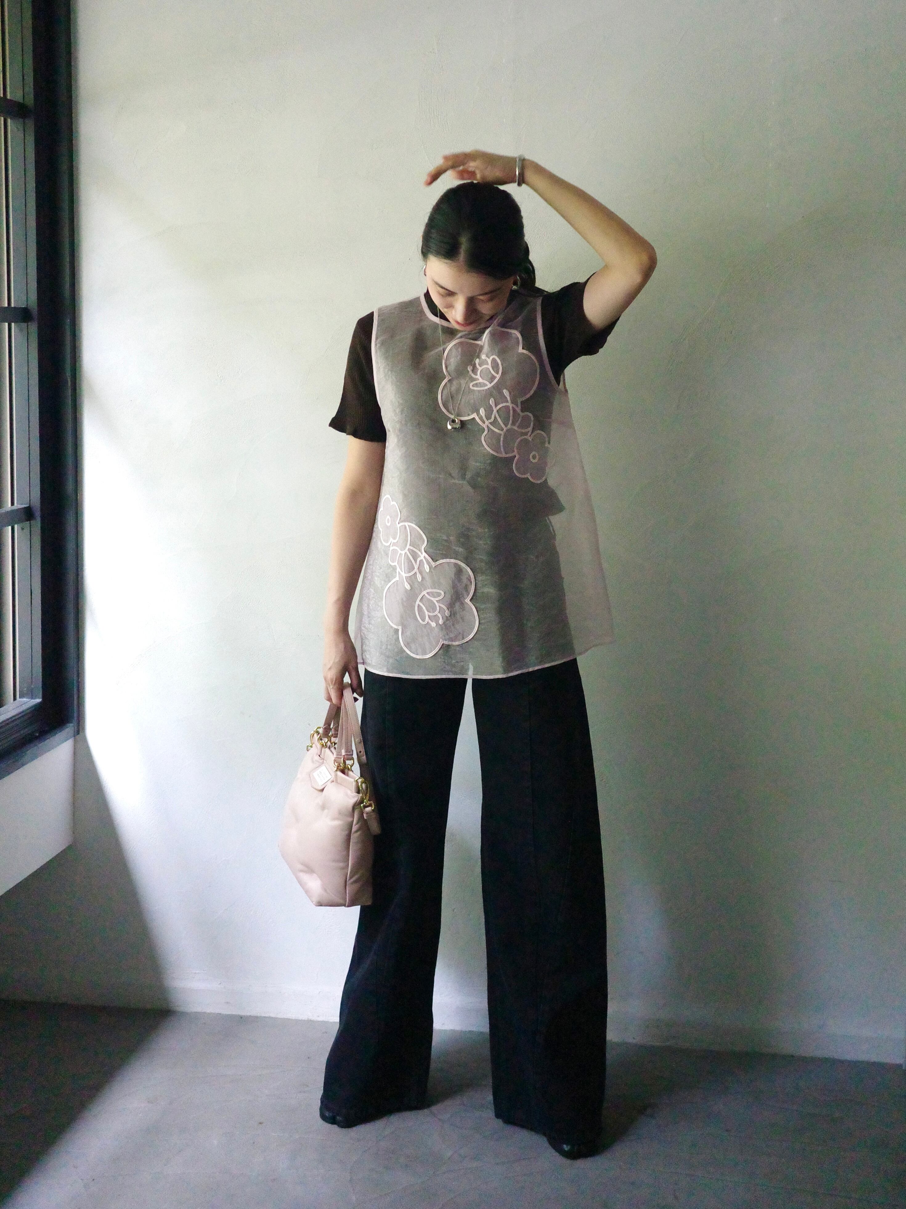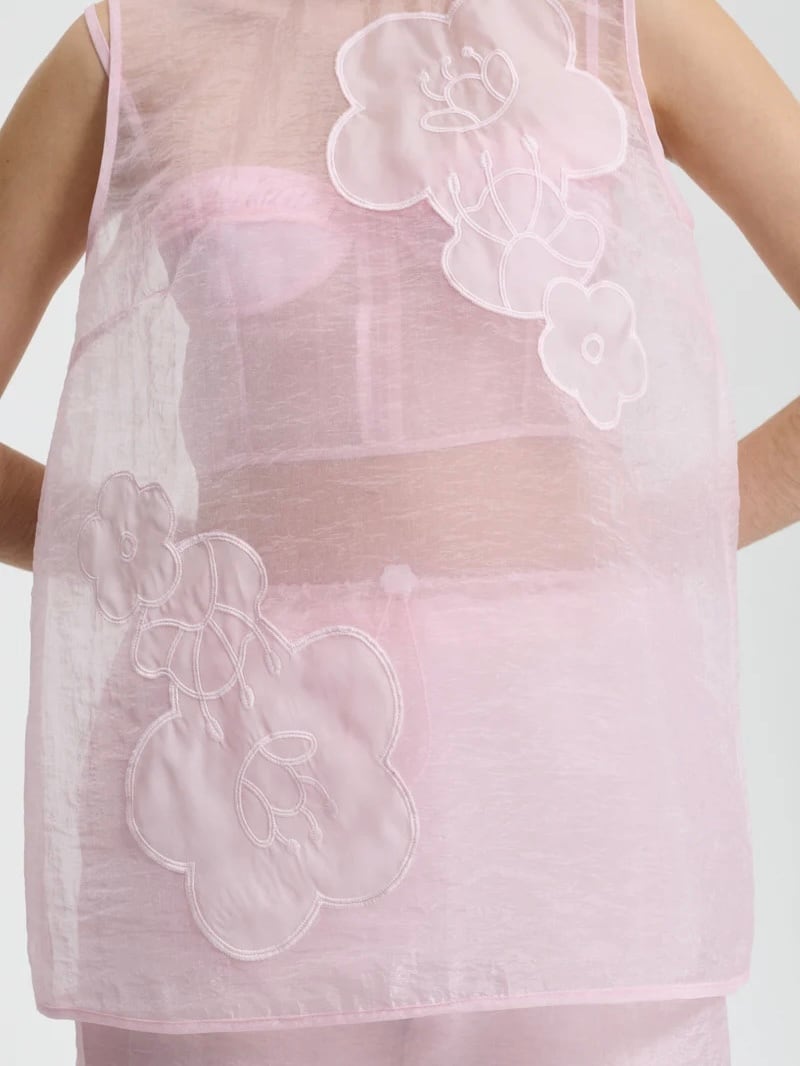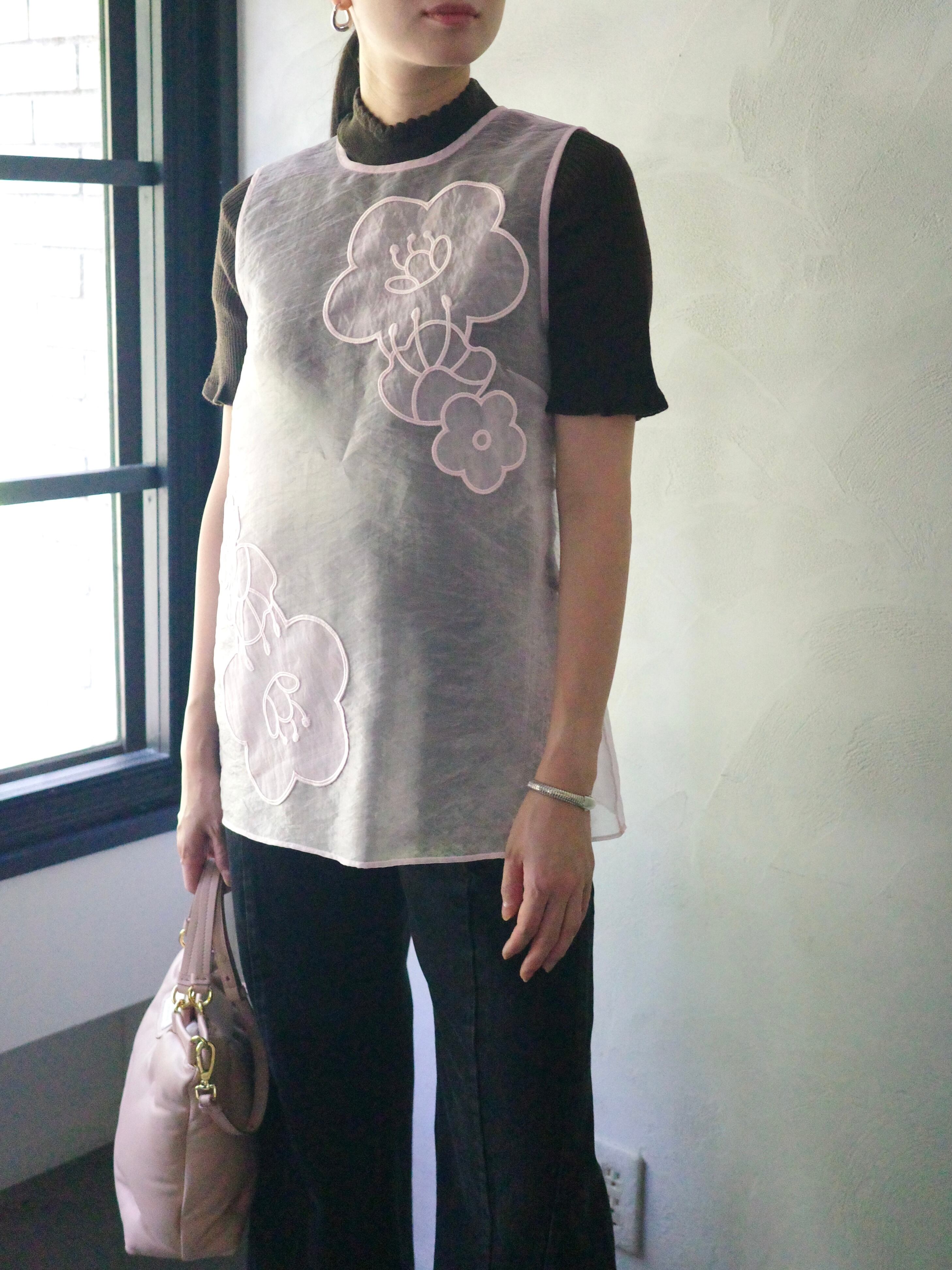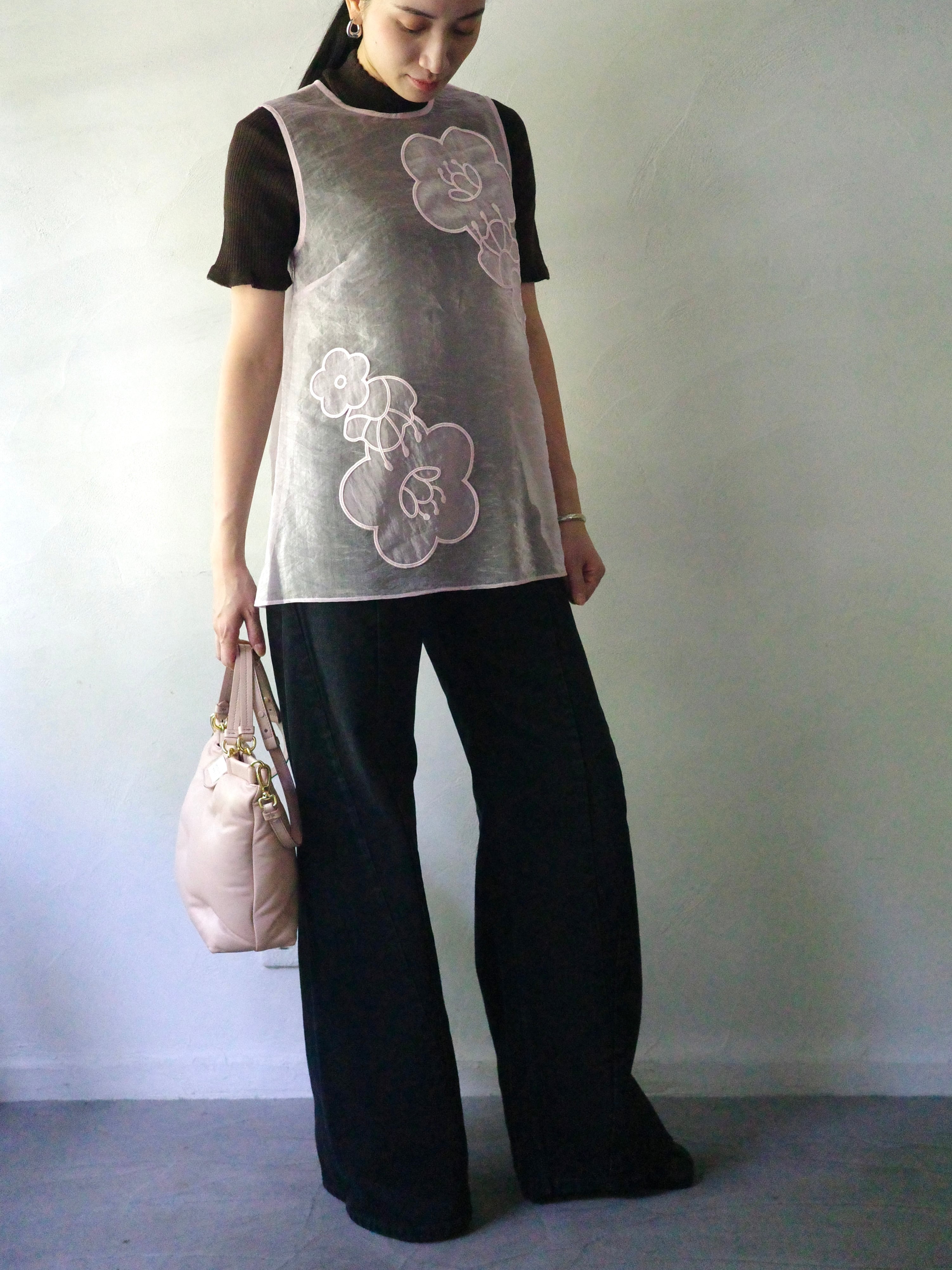 大きなフラワーモチーフのパッチが視線を集める<セシリー バンセン>のノースリーブトップス。ハリのある軽やかなシアー生地にセンシュアルなムードが漂う一枚です。