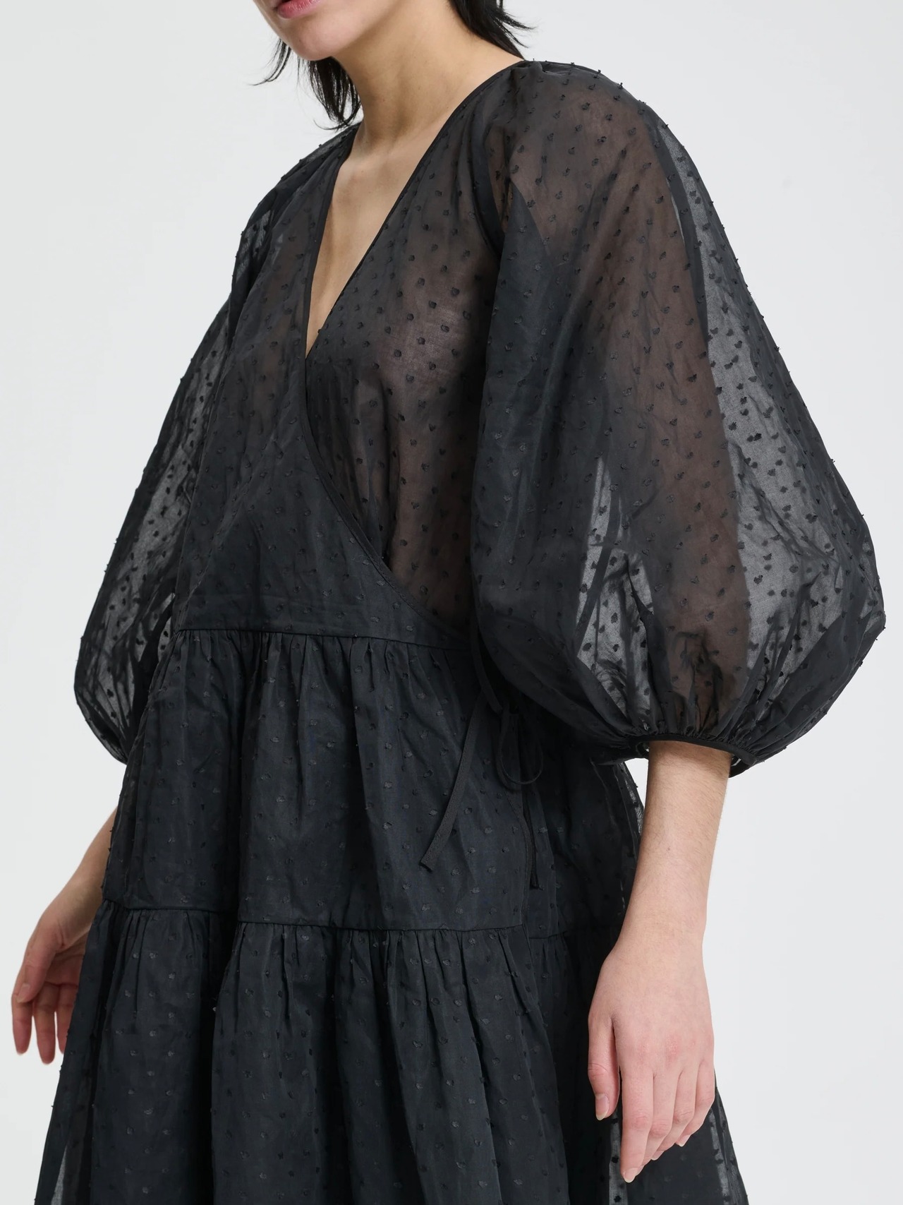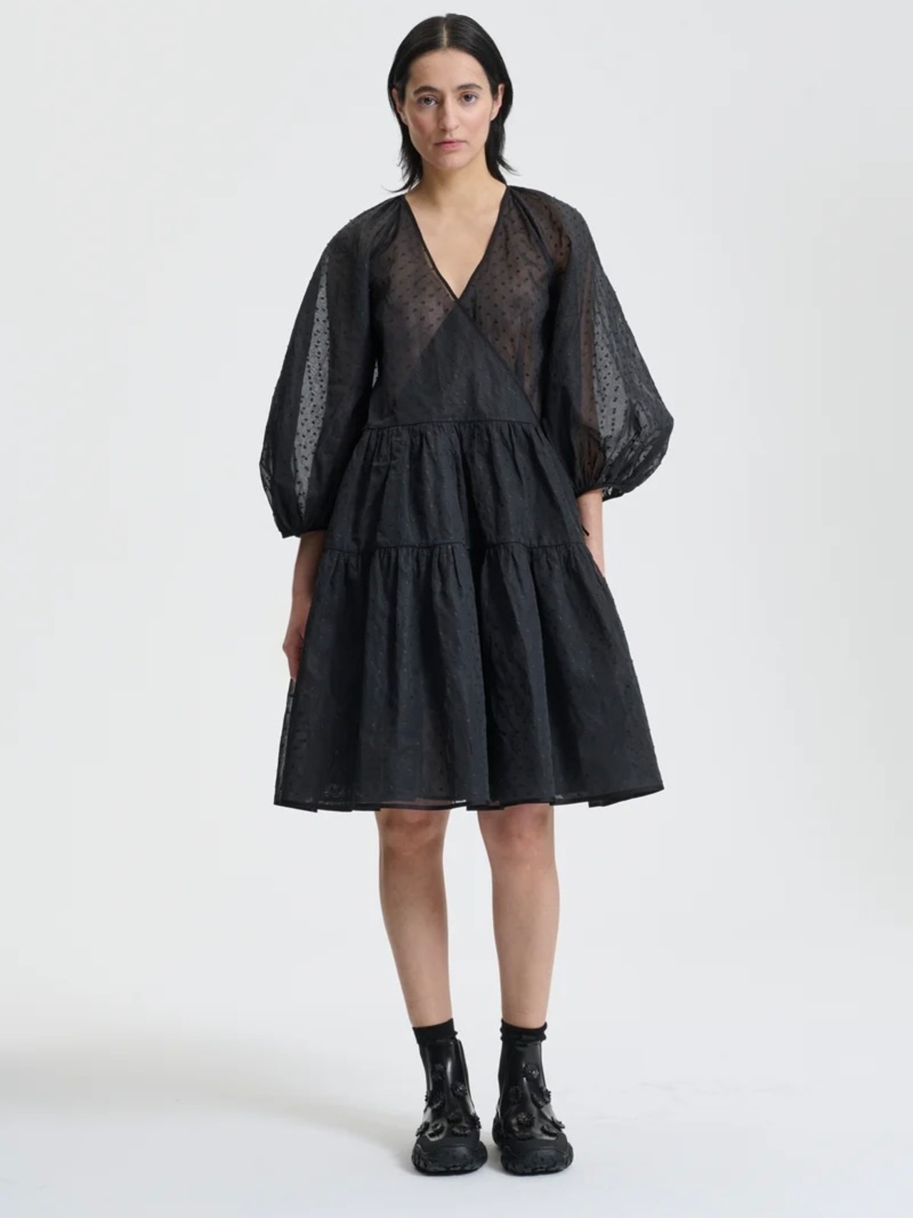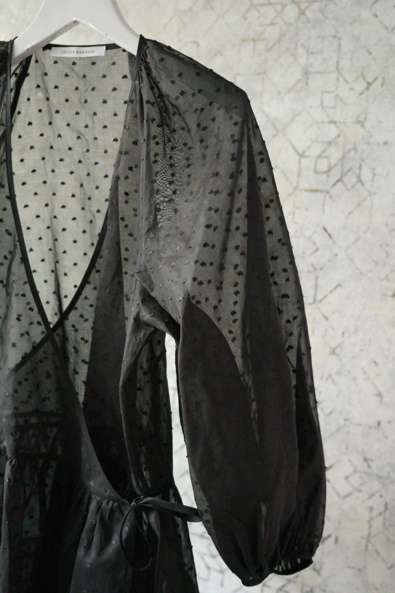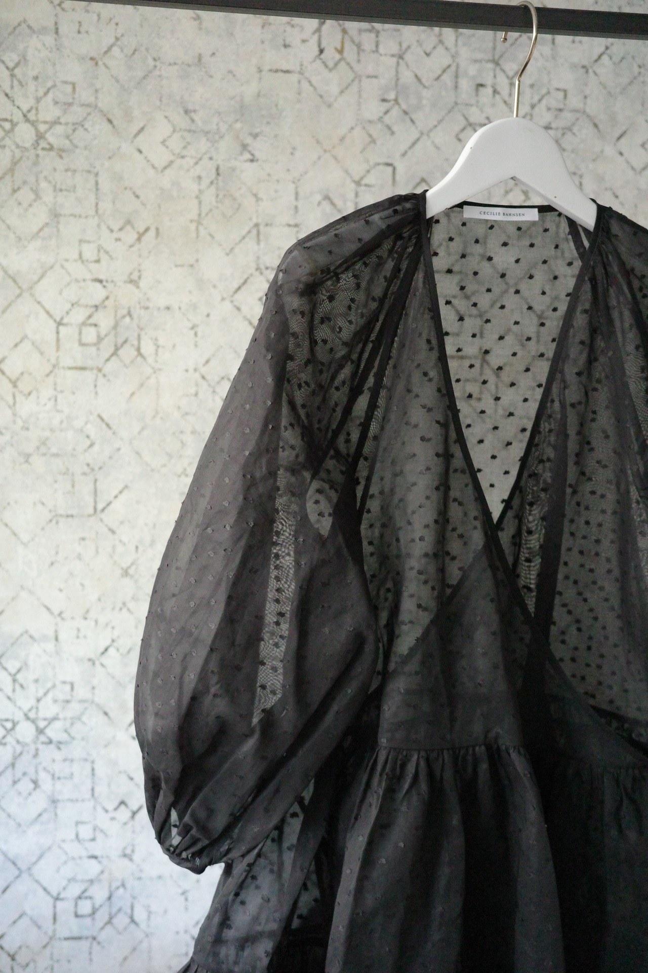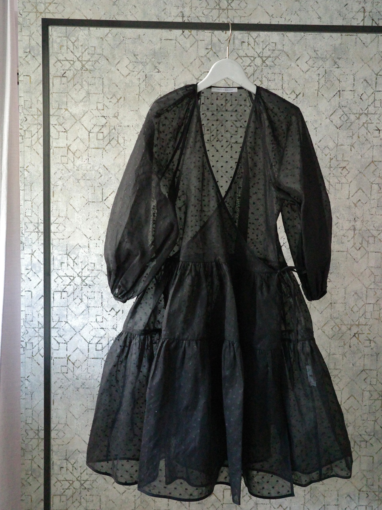 セシリー・バンセンの繊細な美学を体現したミラベルドレス。エアリーなプリュムオーガンジーのラップアラウンドシルエットは、彫刻的なボリューム感を放ちます。ウエストサイドのシグネチャーリボンで留められています。
