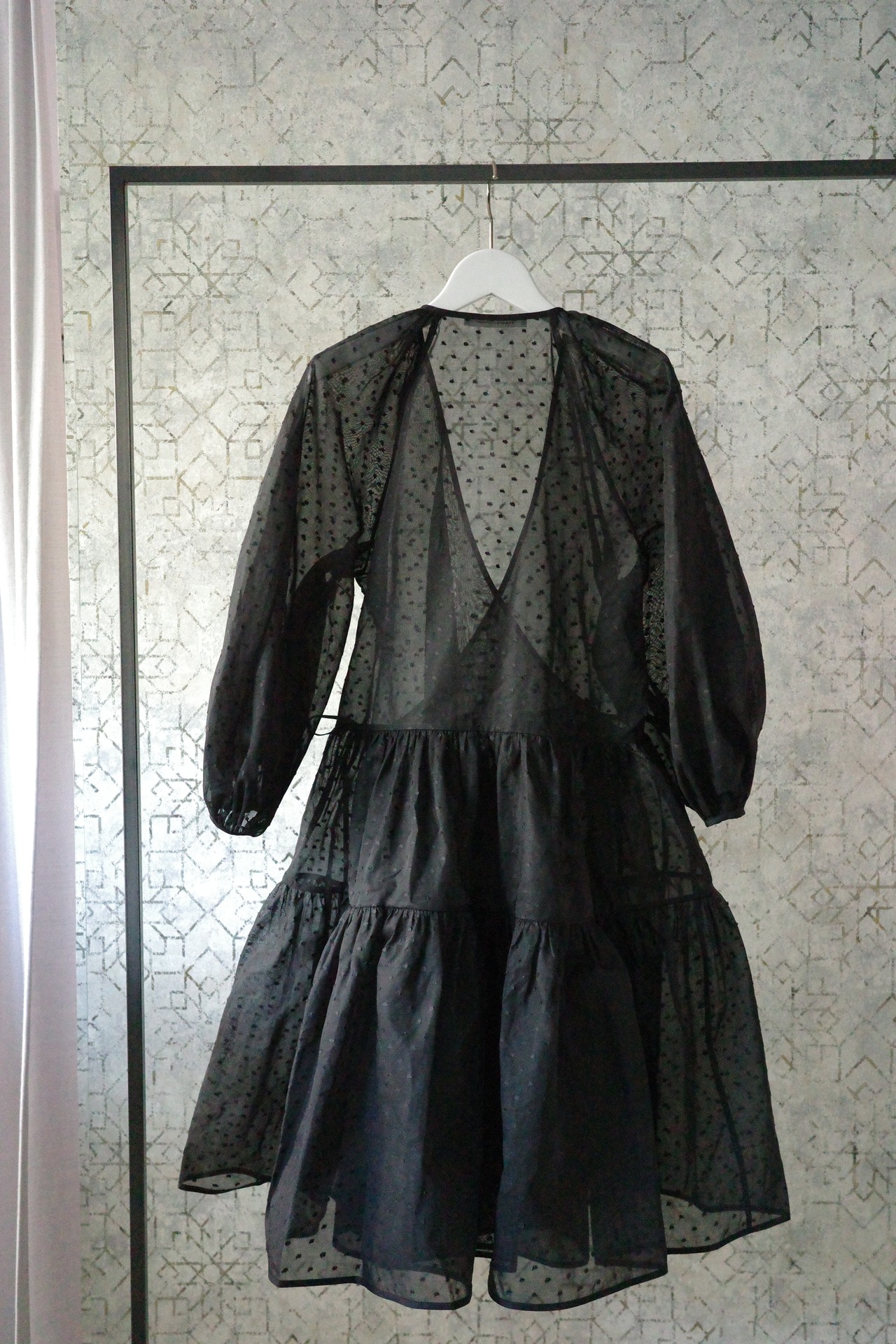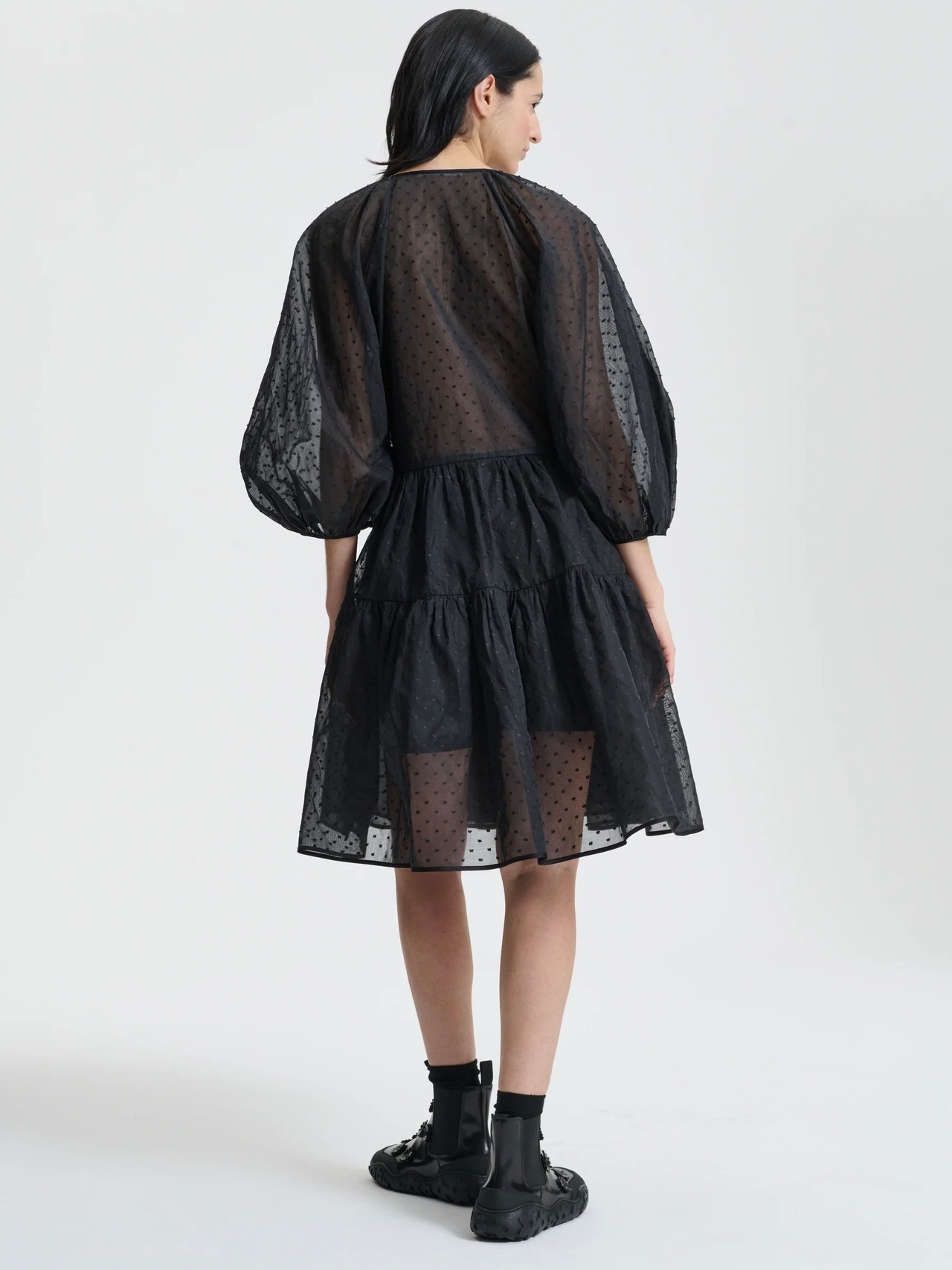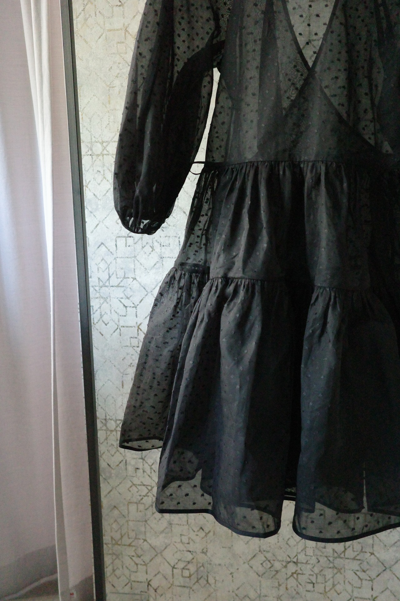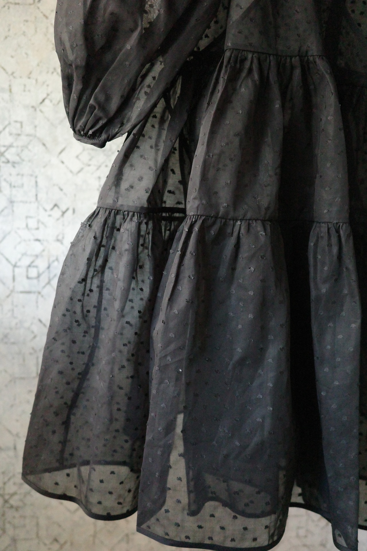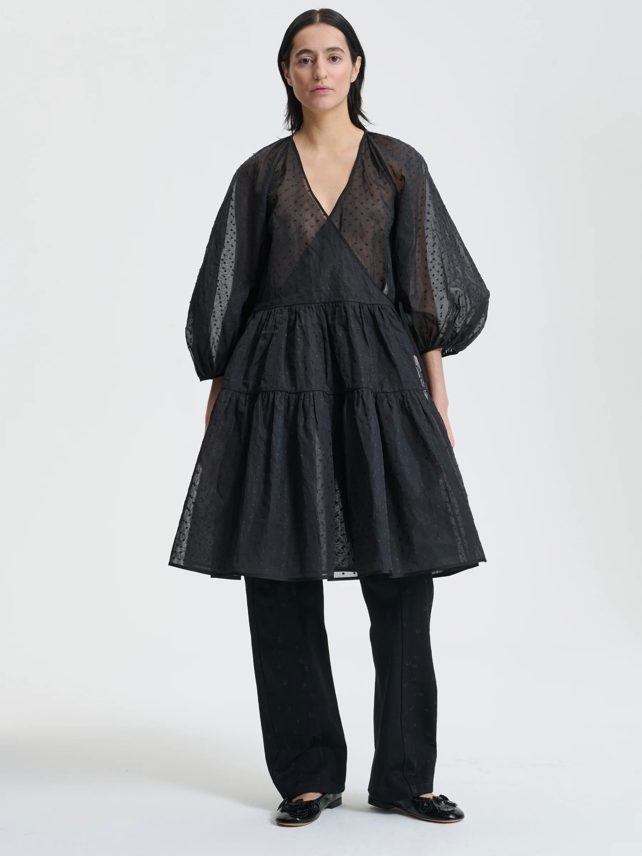 セシリー・バンセンの繊細な美学を体現したミラベルドレス。エアリーなプリュムオーガンジーのラップアラウンドシルエットは、彫刻的なボリューム感を放ちます。ウエストサイドのシグネチャーリボンで留められています。