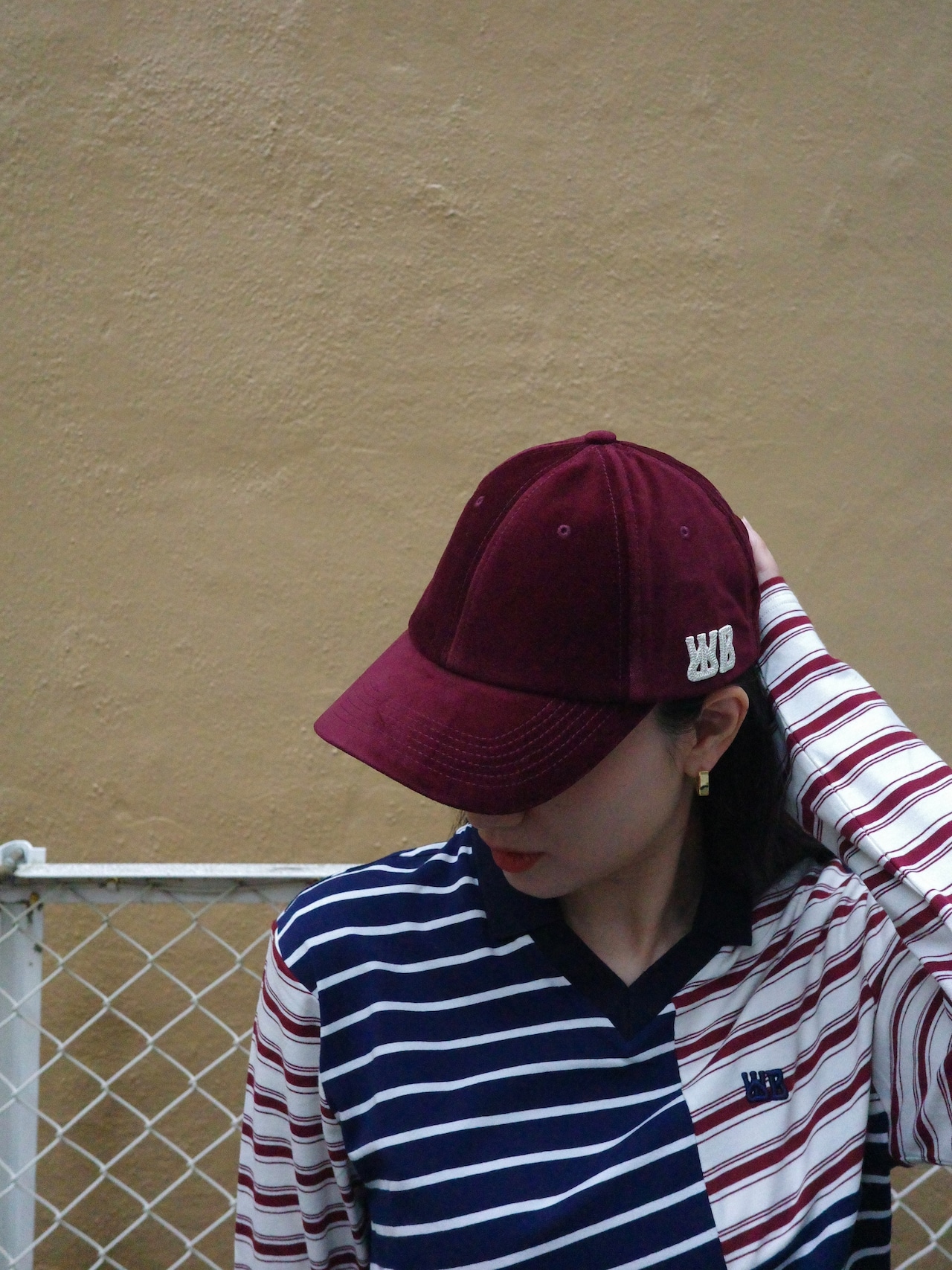 コットンベルベットの素材感が映えるボルドーが印象的なベースボールキャップ。