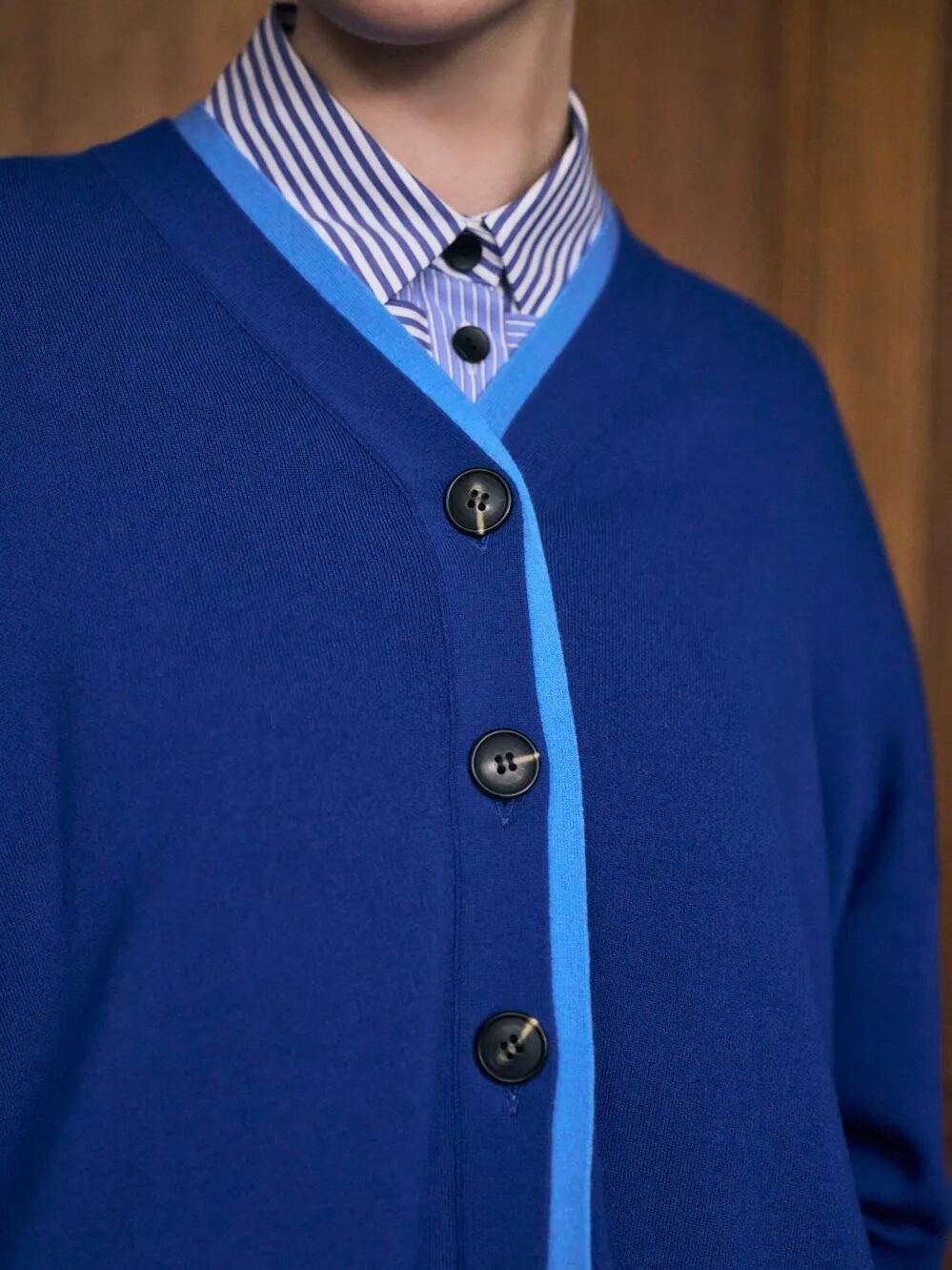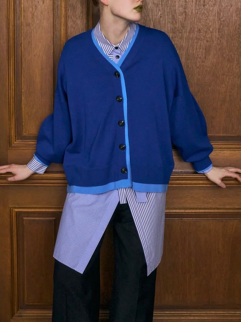 あたかもカーディガンを2枚重ね着しているかのようなありそうでなかった配色ディティールがスタイリングにさりげなく彩りをプラスしてくれます。