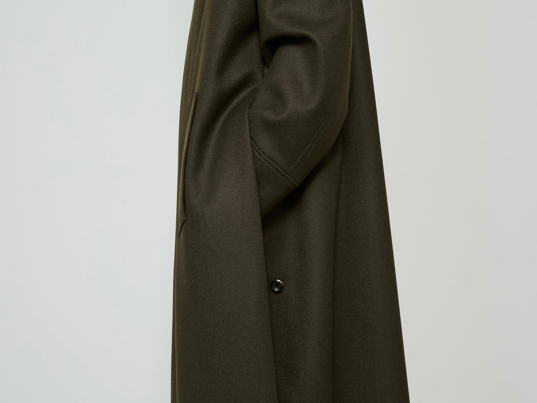 フロントのボタンは表から見えないように比翼仕立てになっており、極力デザインをそぎ落としたミニマルな印象に仕上げています。