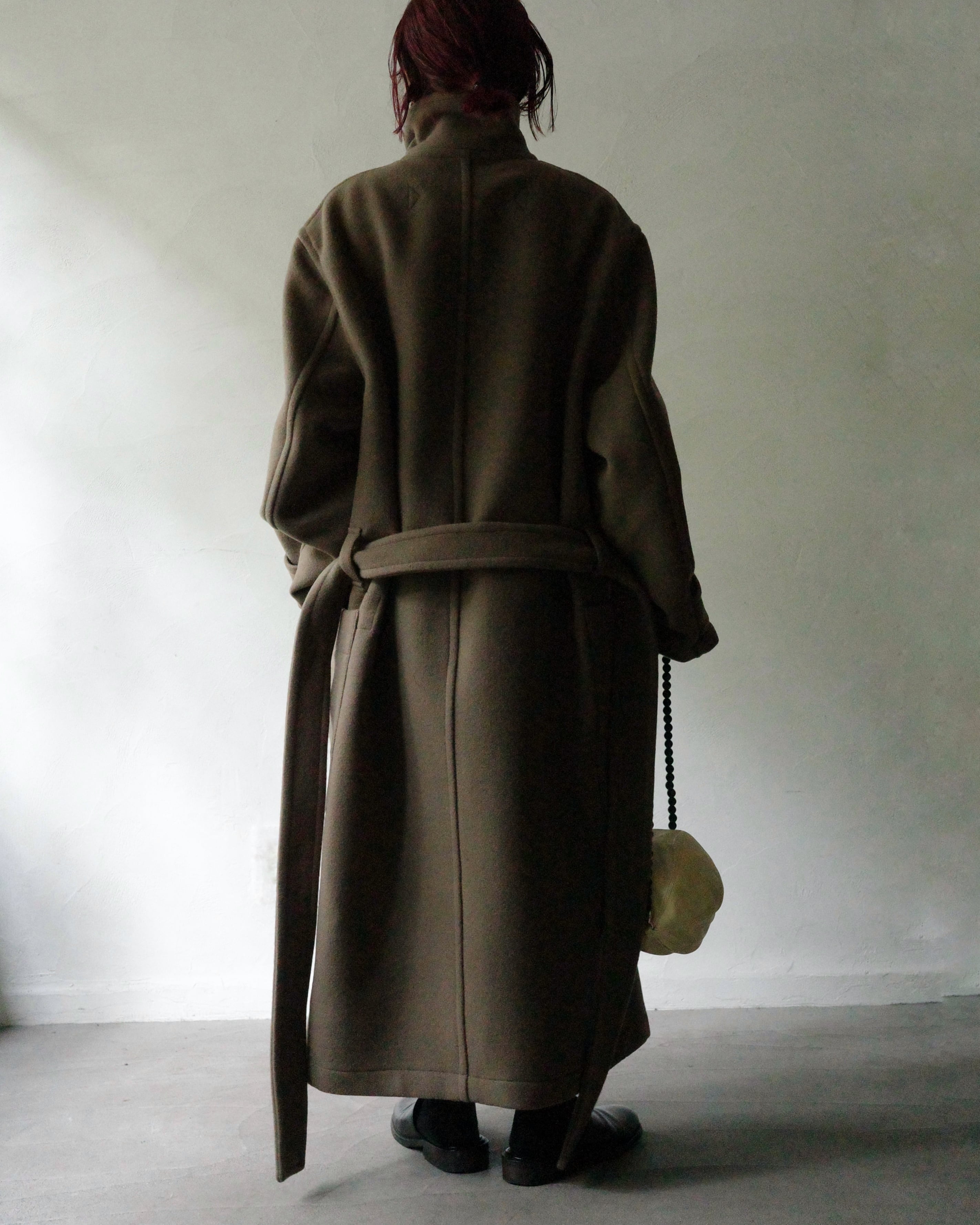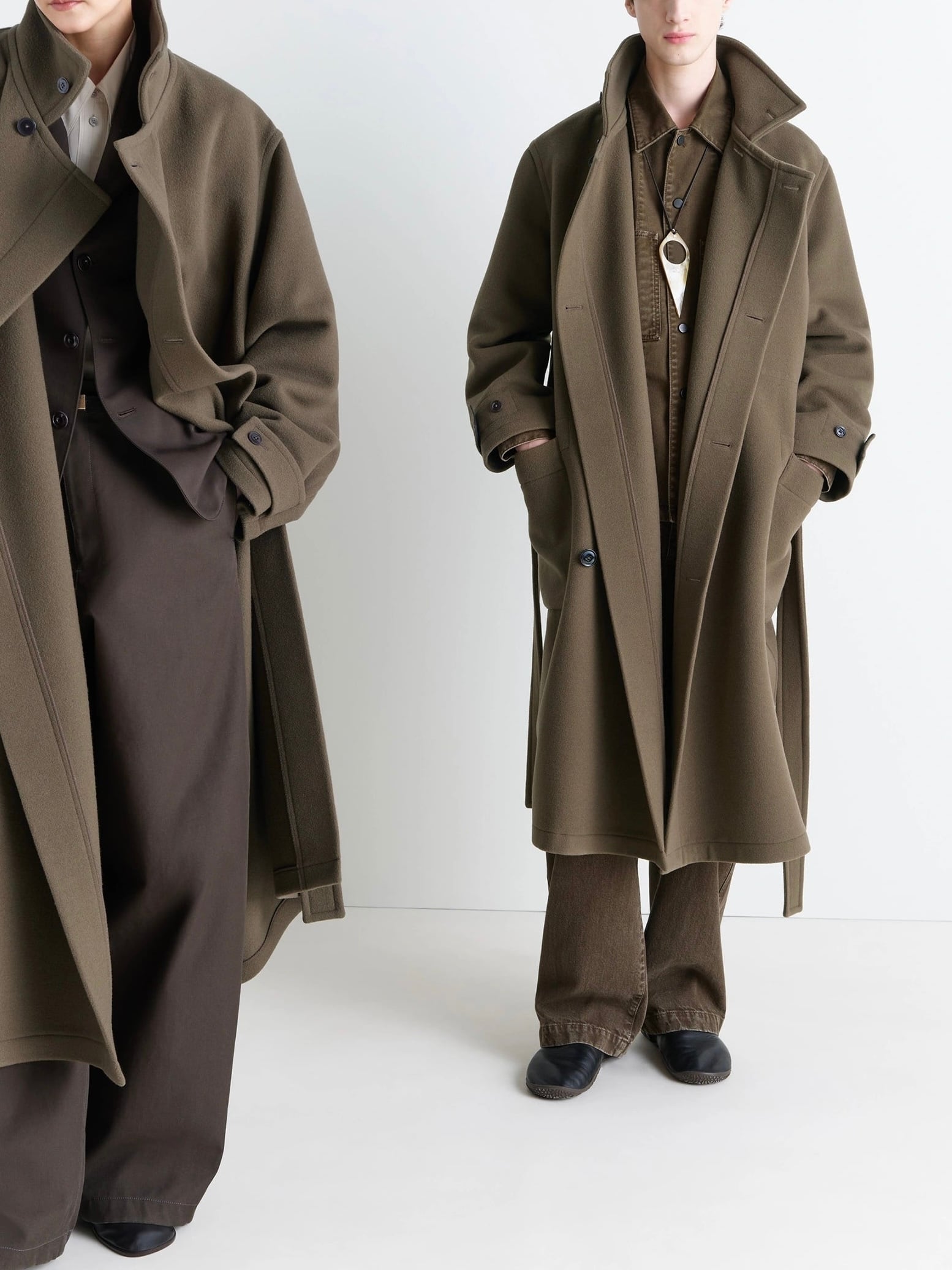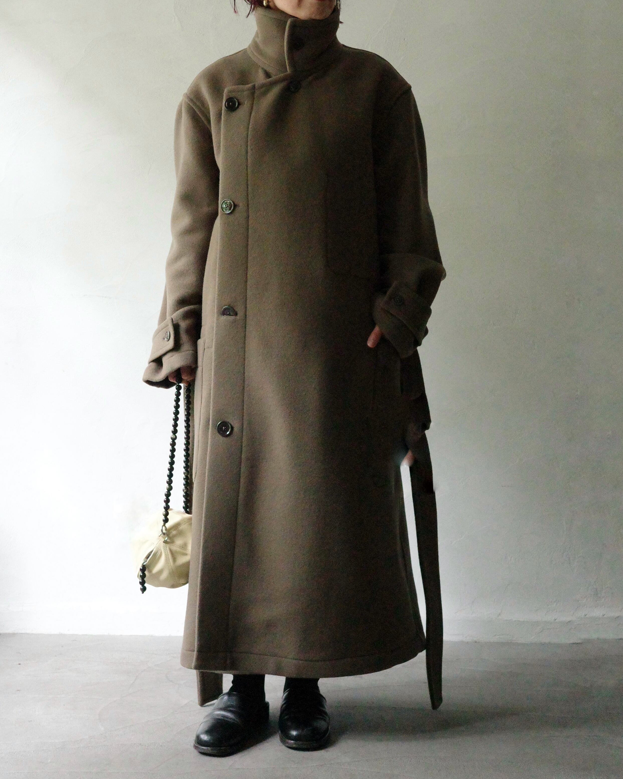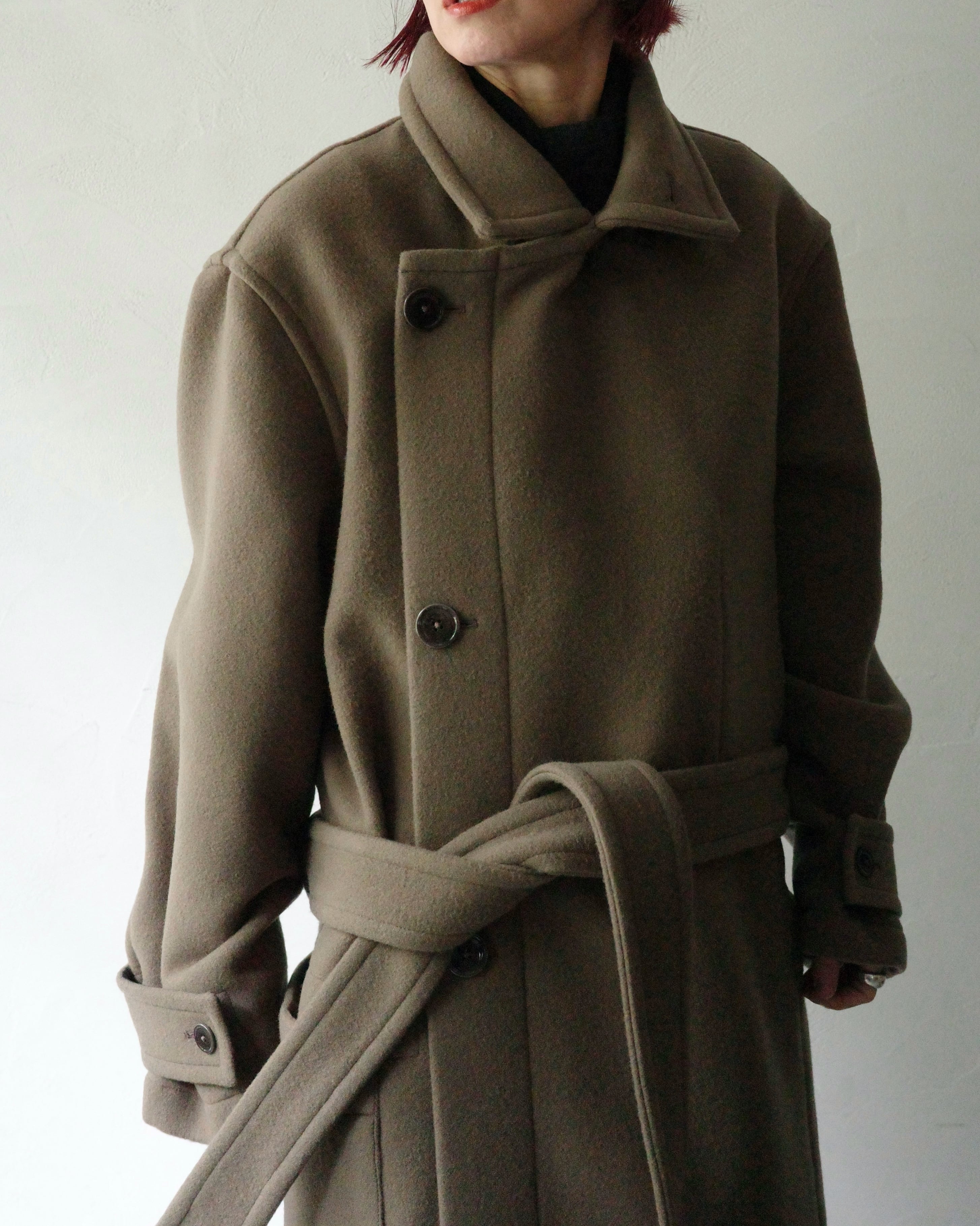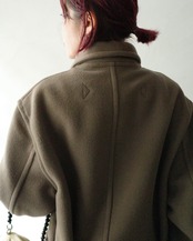 ウール素材を用いた一着ですがダブルのような前立てデザインに丸みを持たせたドロップショルダー、着丈はロングコートらしく非常に長めの設定。