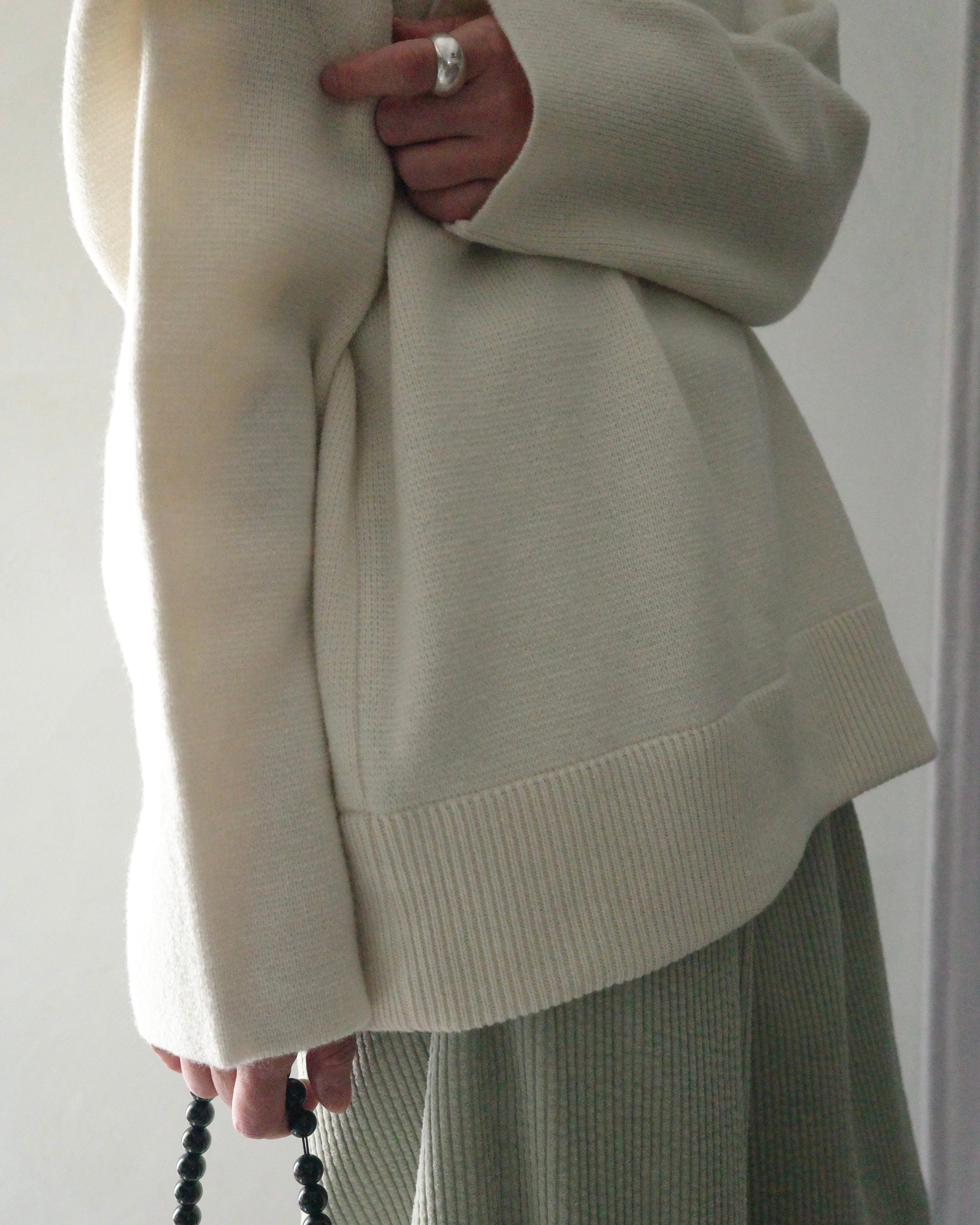 カシミヤ/ウールのブレンド糸を使用した、Vネックプルオーバーニット。深めのVネック仕様で、ミラノリブ生地にすることで全体の形状にハリと厚みを生み出しシャープな印象を与えます。袖丈は長めで、前後の身頃に細く少し厚みをもたせたラグラン線を配置し、デザインに立体感を加え、肩回りをすっきりとさせコンパクトでミニマルなカットソーに近いニット。アウターとのレイヤードをしやすい設計となり厚手のコートからジャケットまで幅広くコーディネートしやすいデザインに仕上がっています。