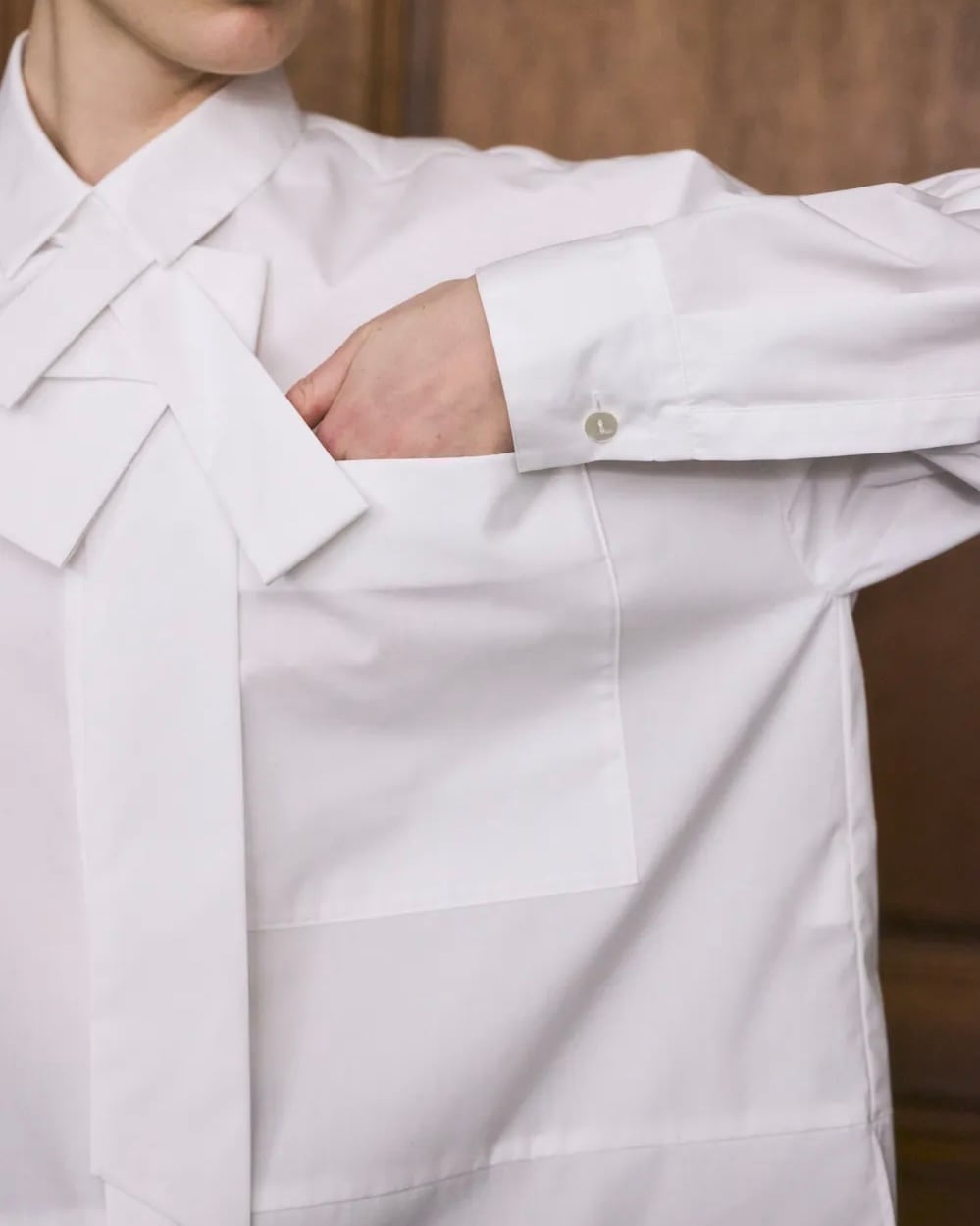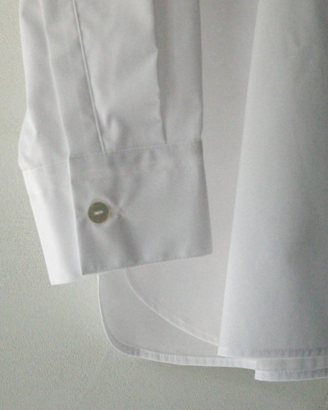 使い勝手の良いサイズ感のシャツに、ボタンで着脱ができるユーモアの効いたアシンメトリーのボウタイがセットになったアイテム。