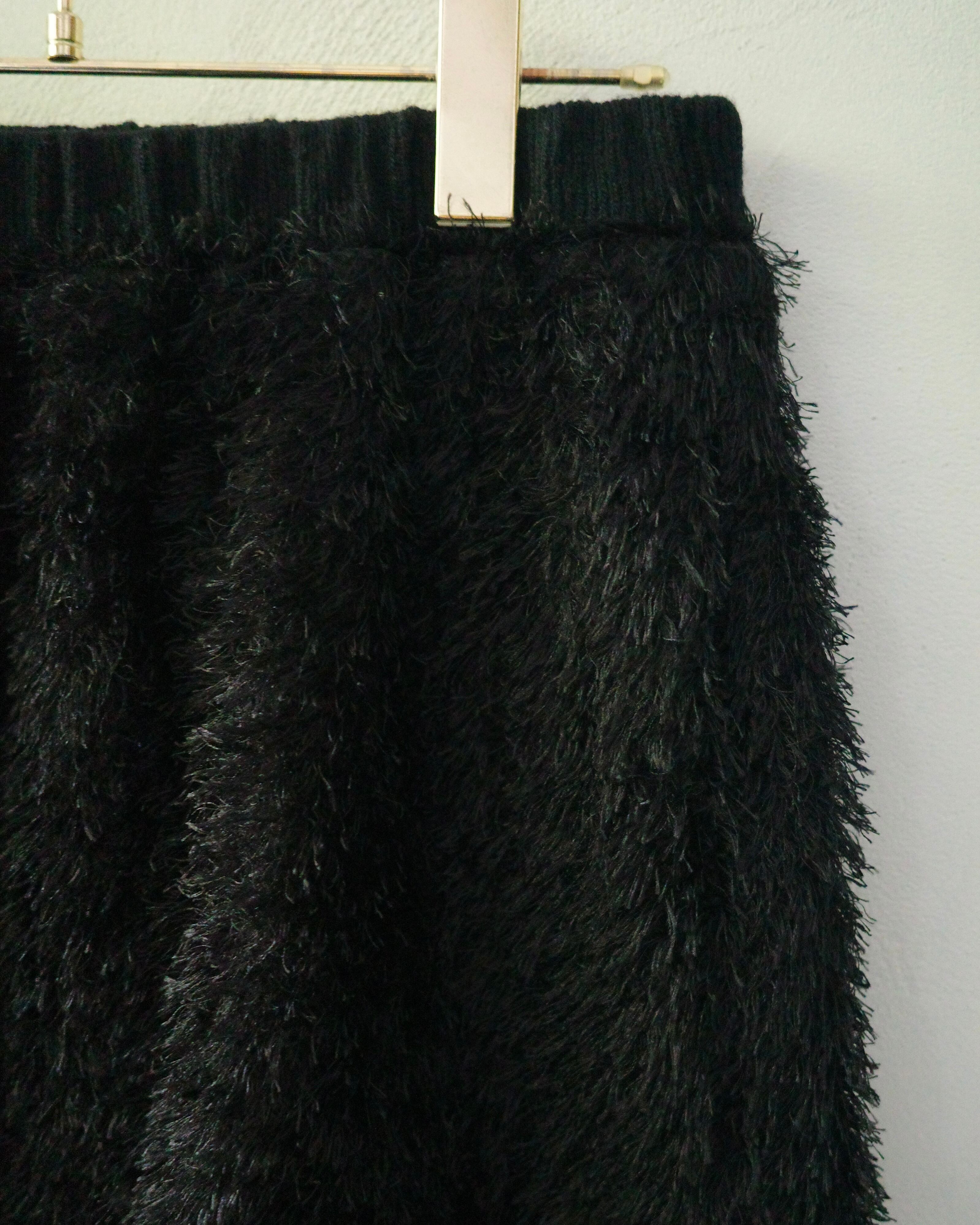トップはファーのようなもしゃっとしたジャガード、中央は光沢感のあるオーガンジー、下はシワ感のある素材で動くたびに表情が変わる一枚です。