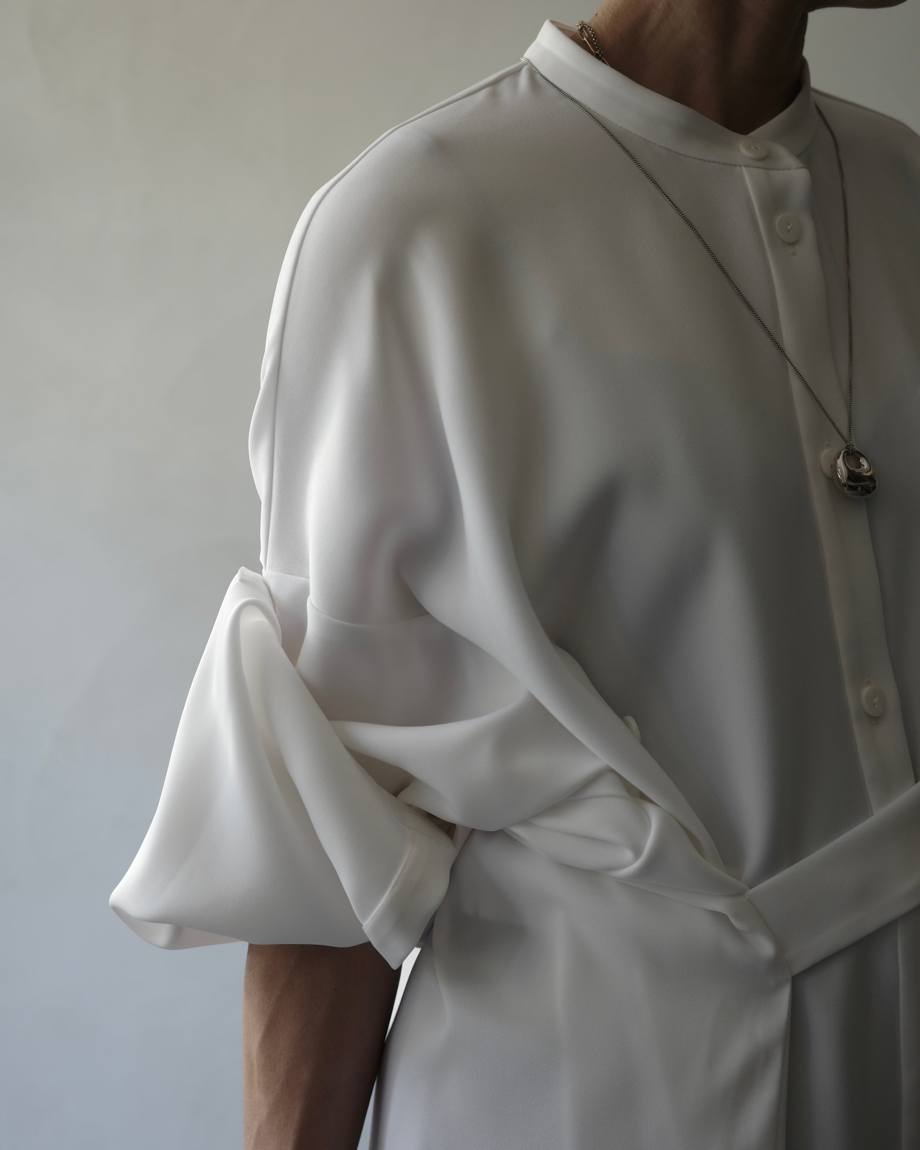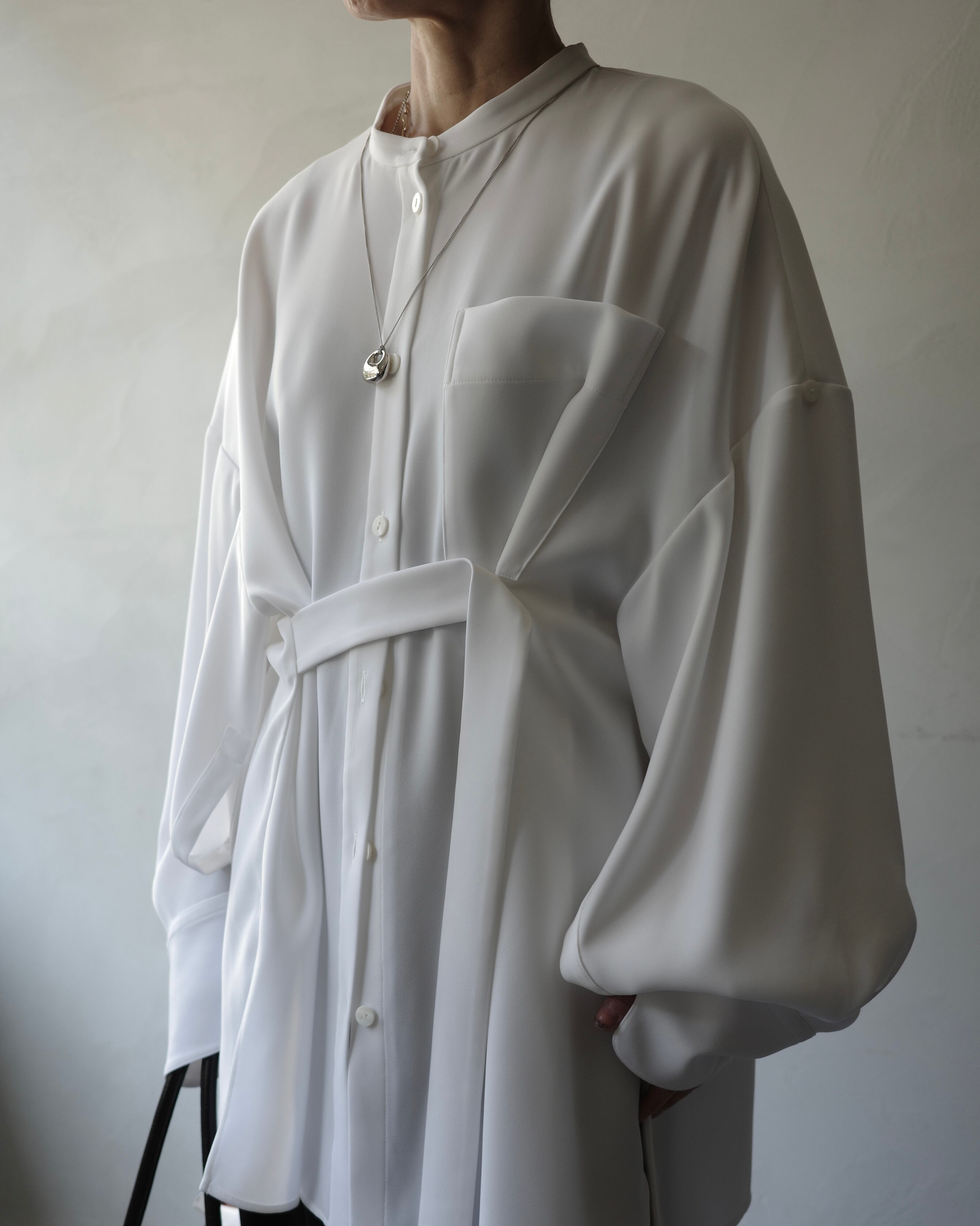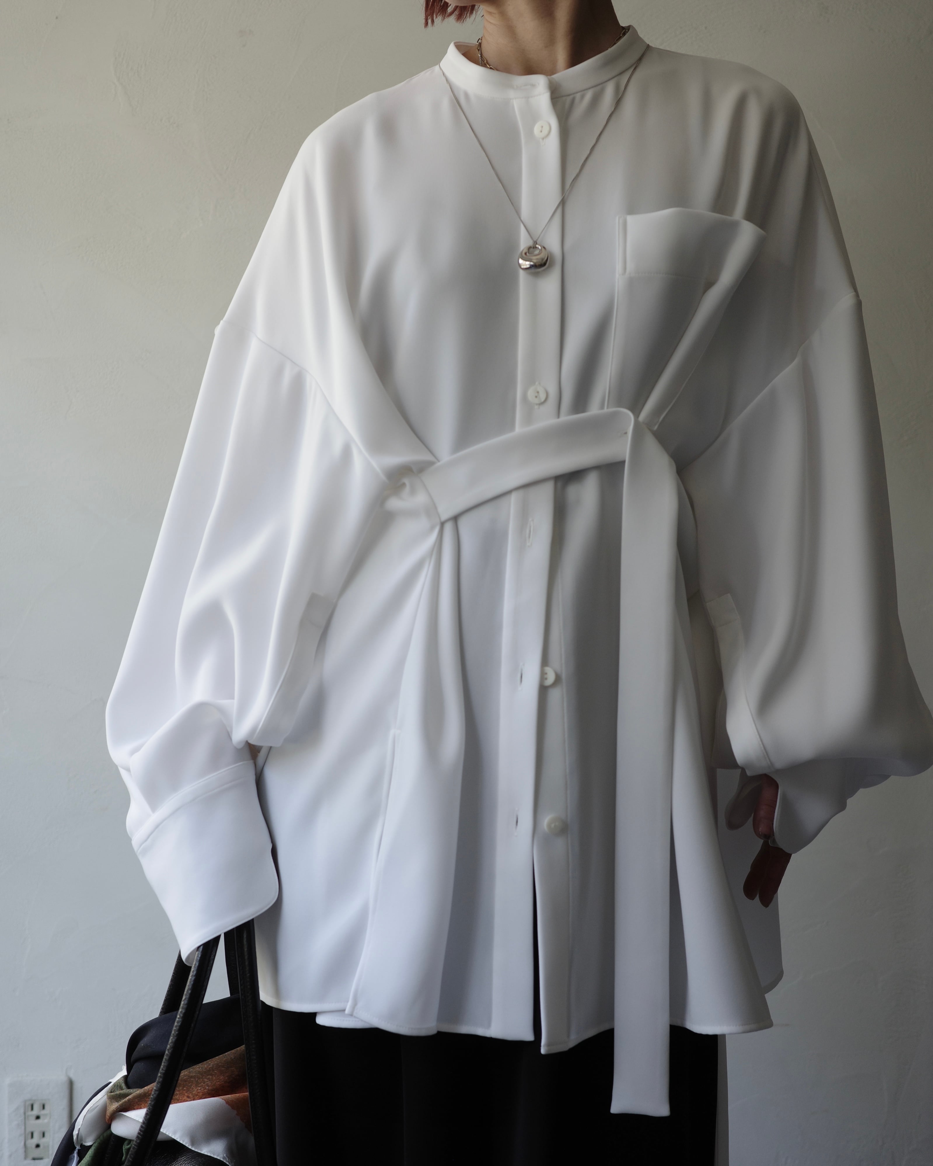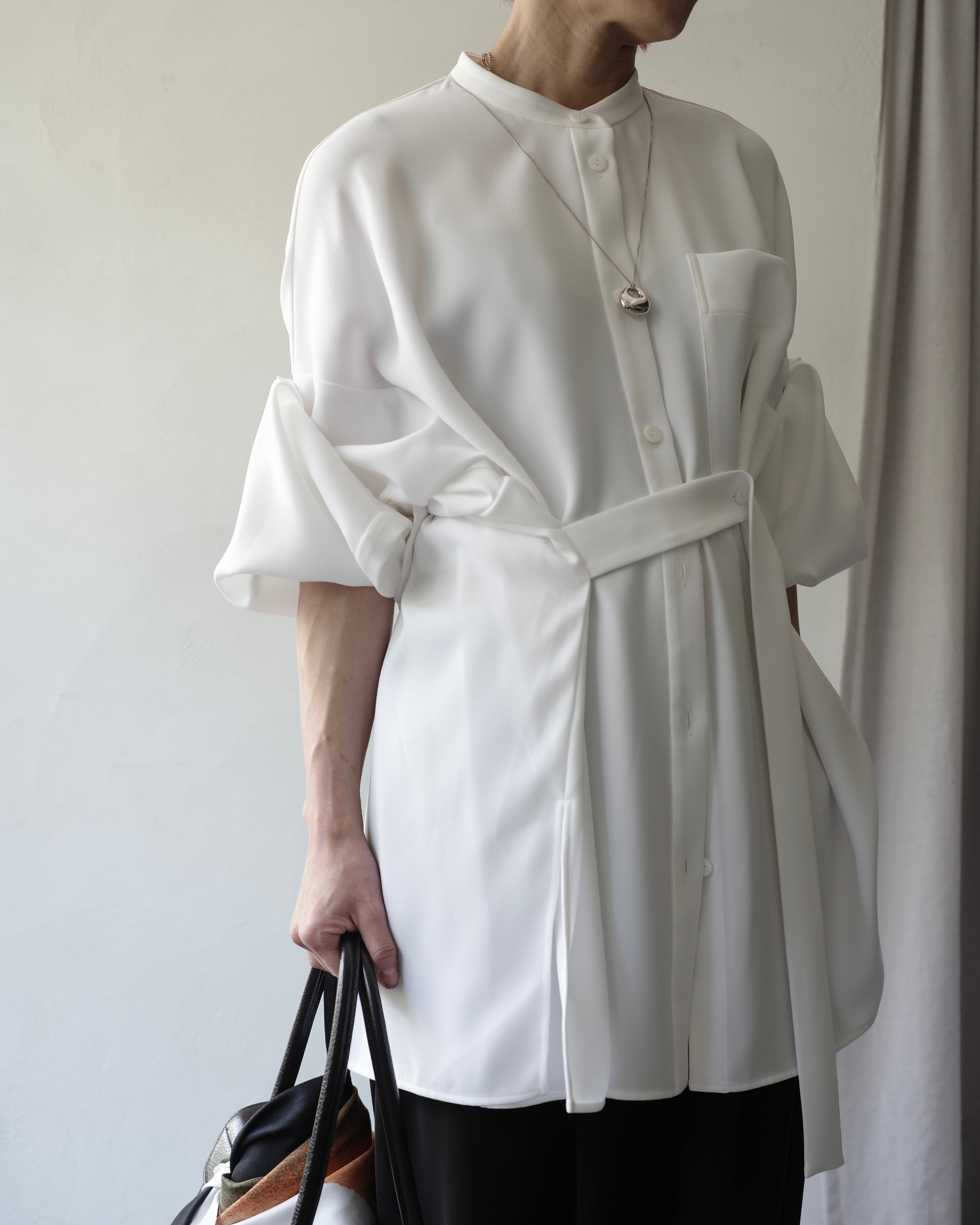 脇テープを釦にとめることで様々なシルエットの着方ができるデザインシャツ。