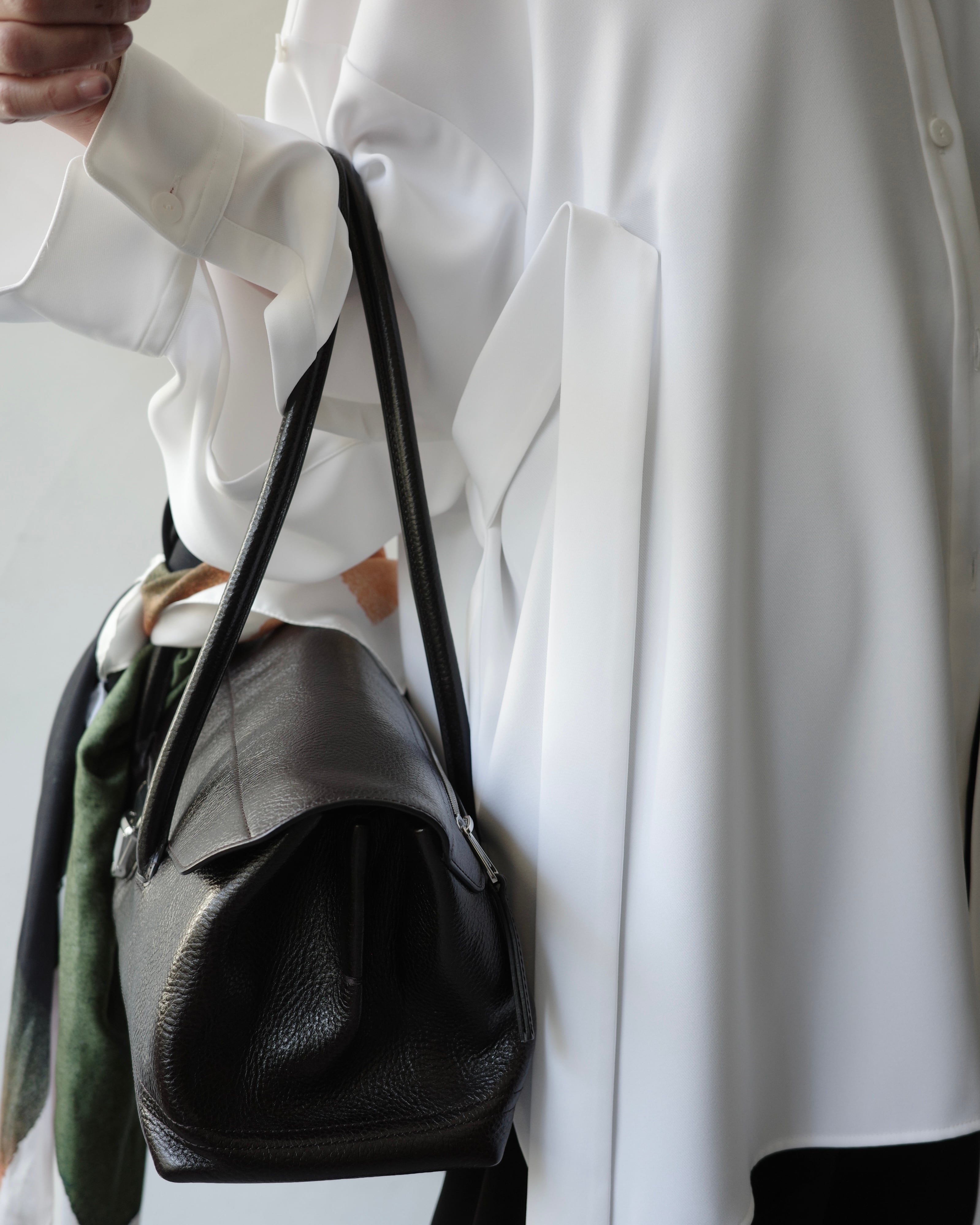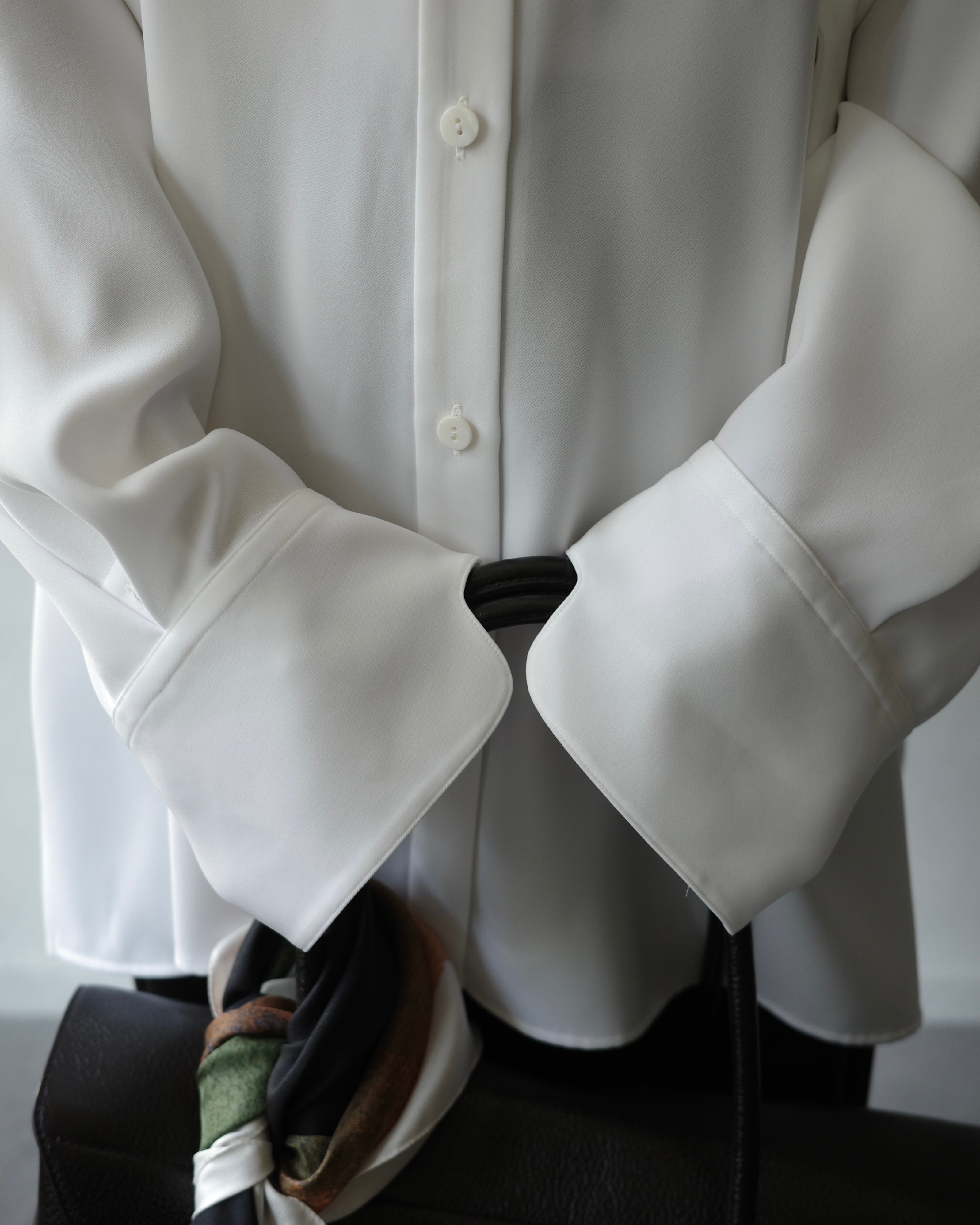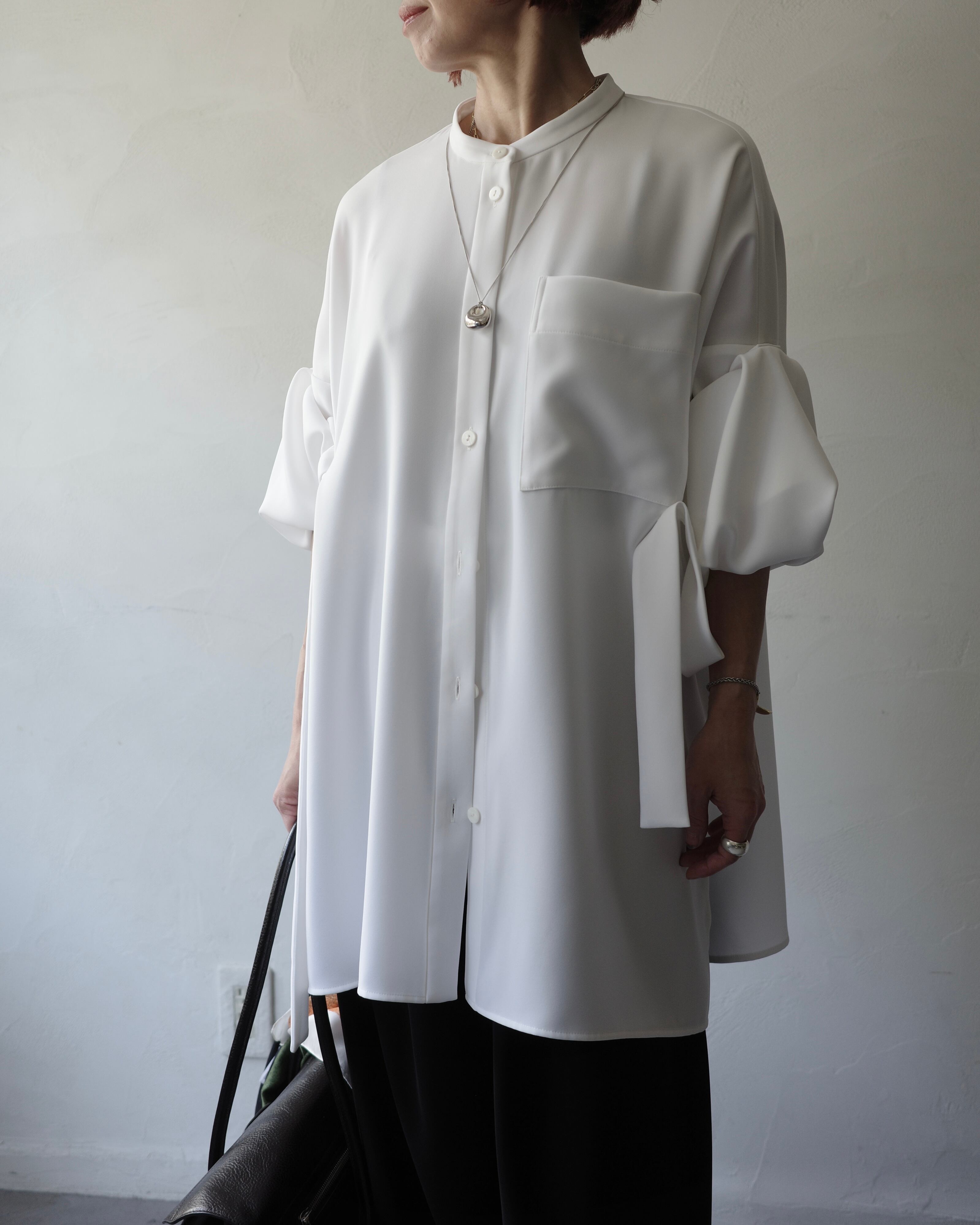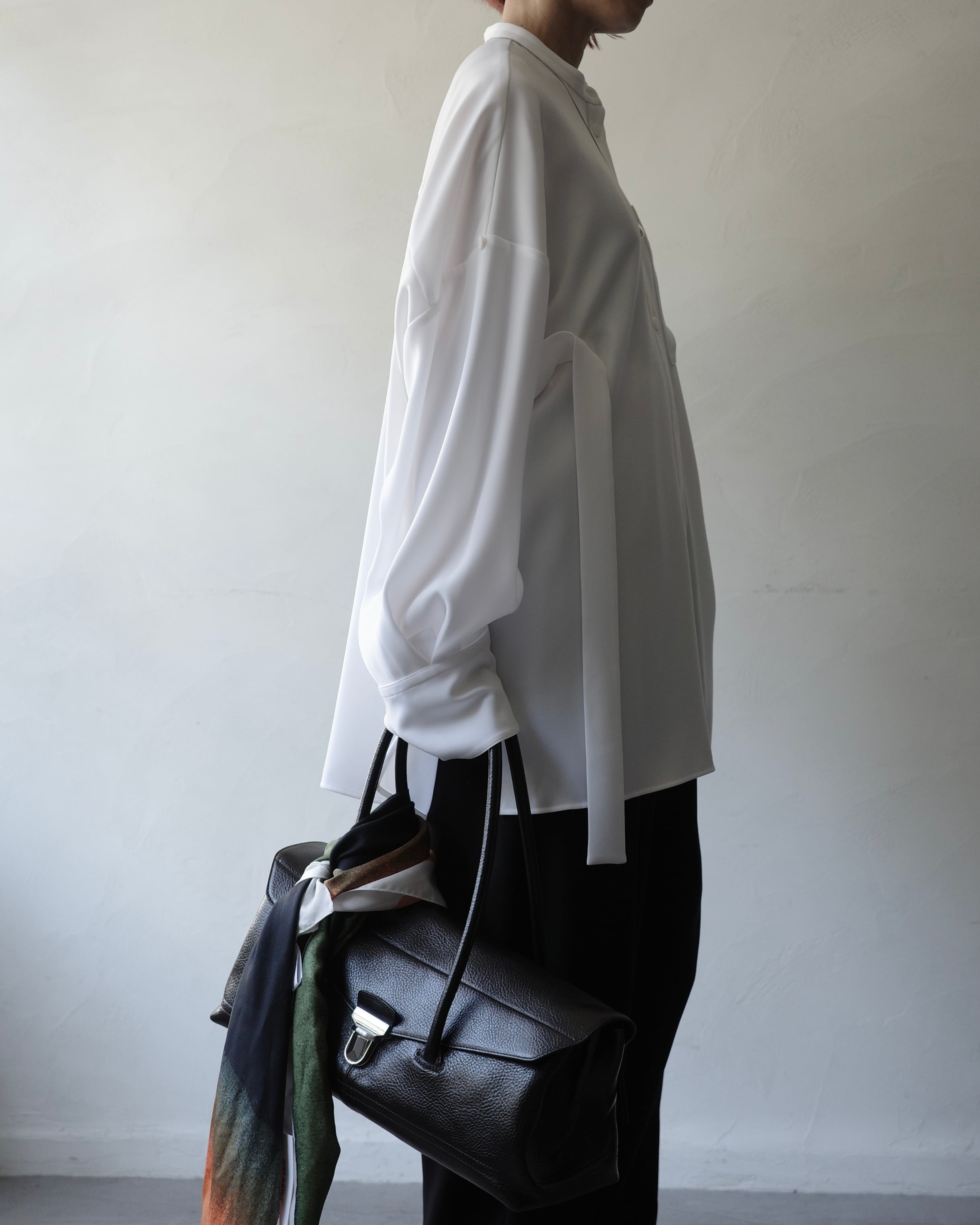 脇テープを釦にとめることで様々なシルエットの着方ができるデザインシャツ。