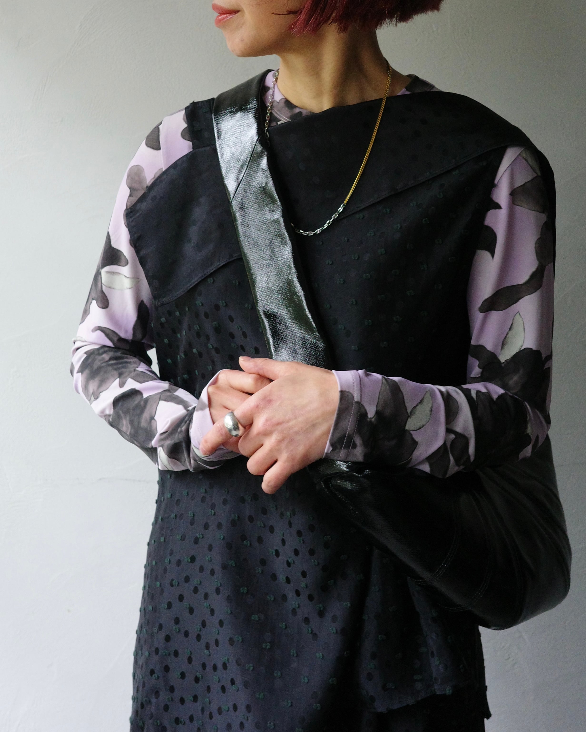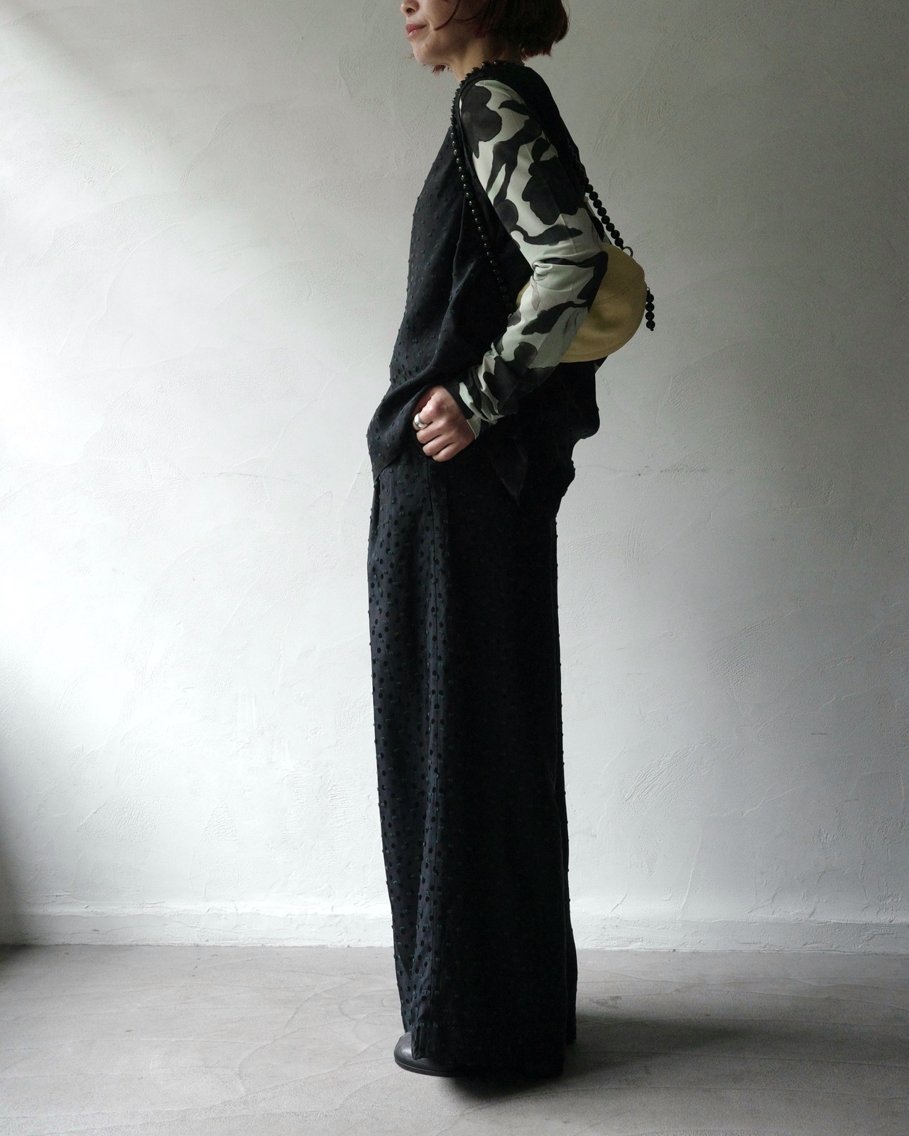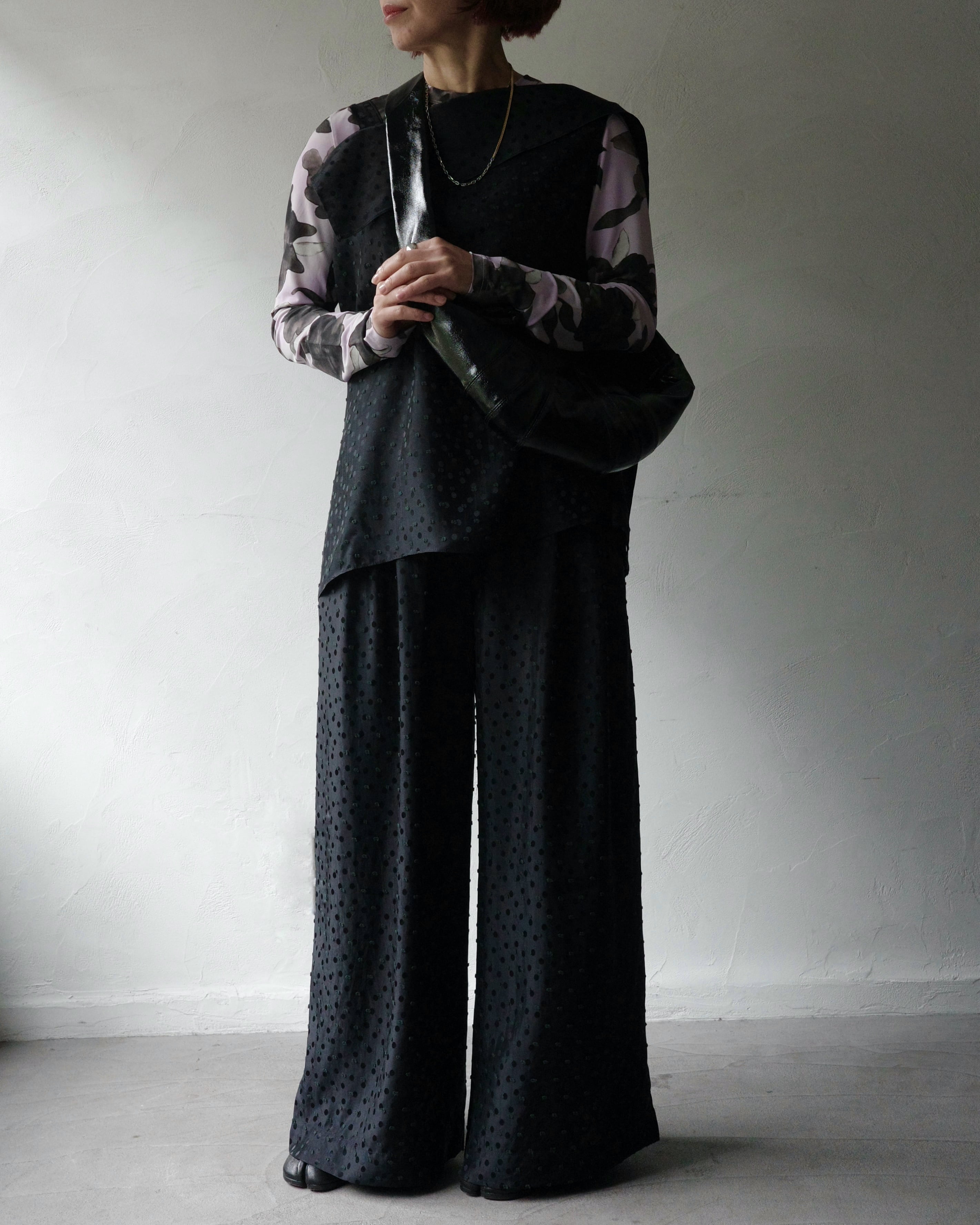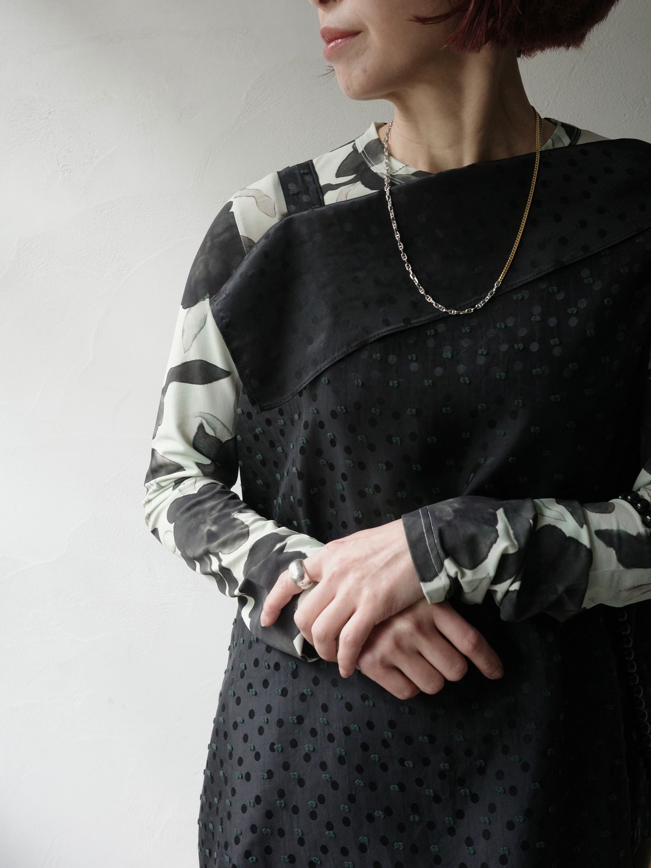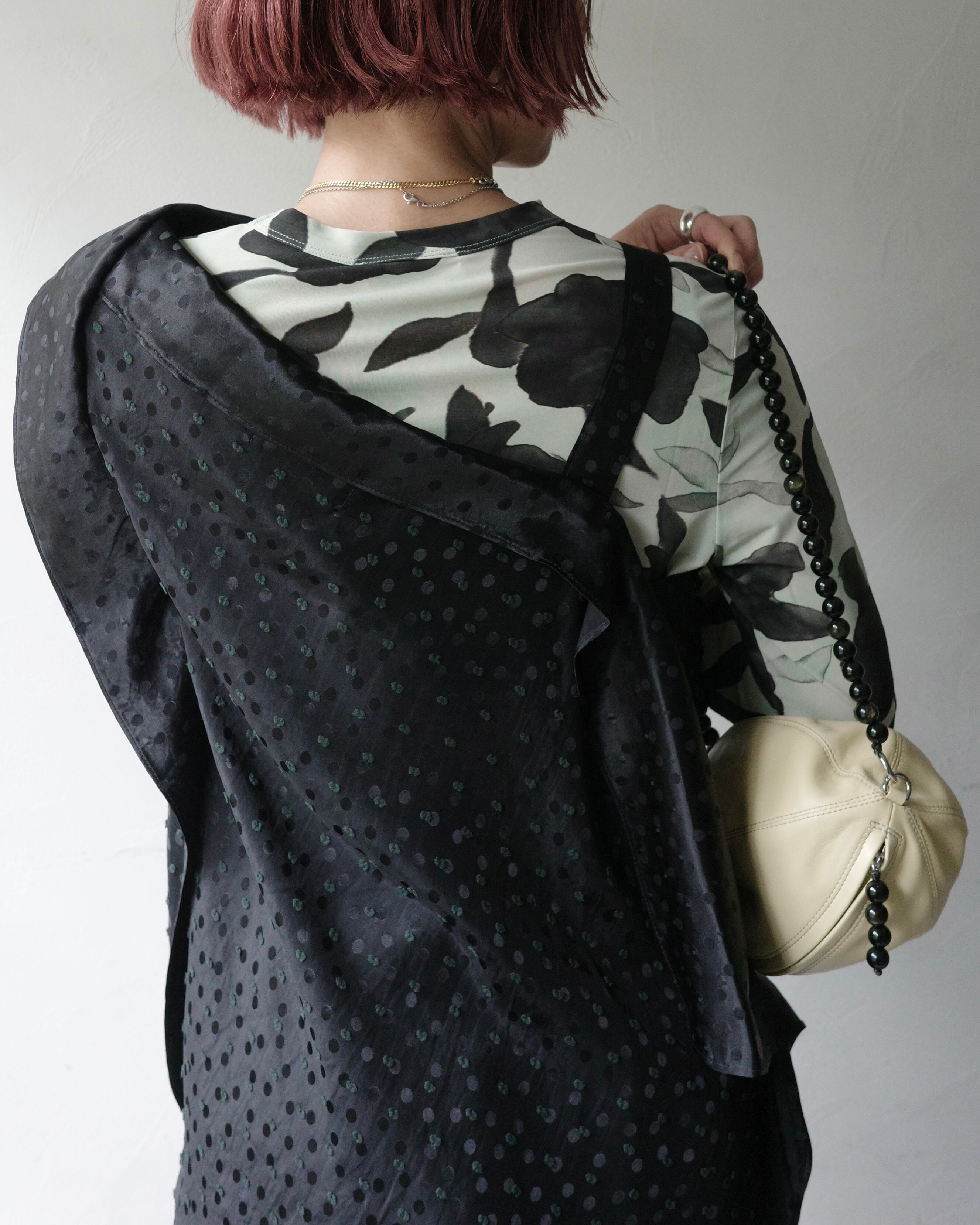 洗練されたドット柄は、重ね着にも一枚での着用にも美しく映えます。
