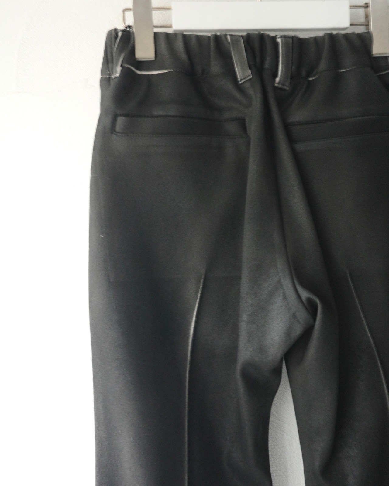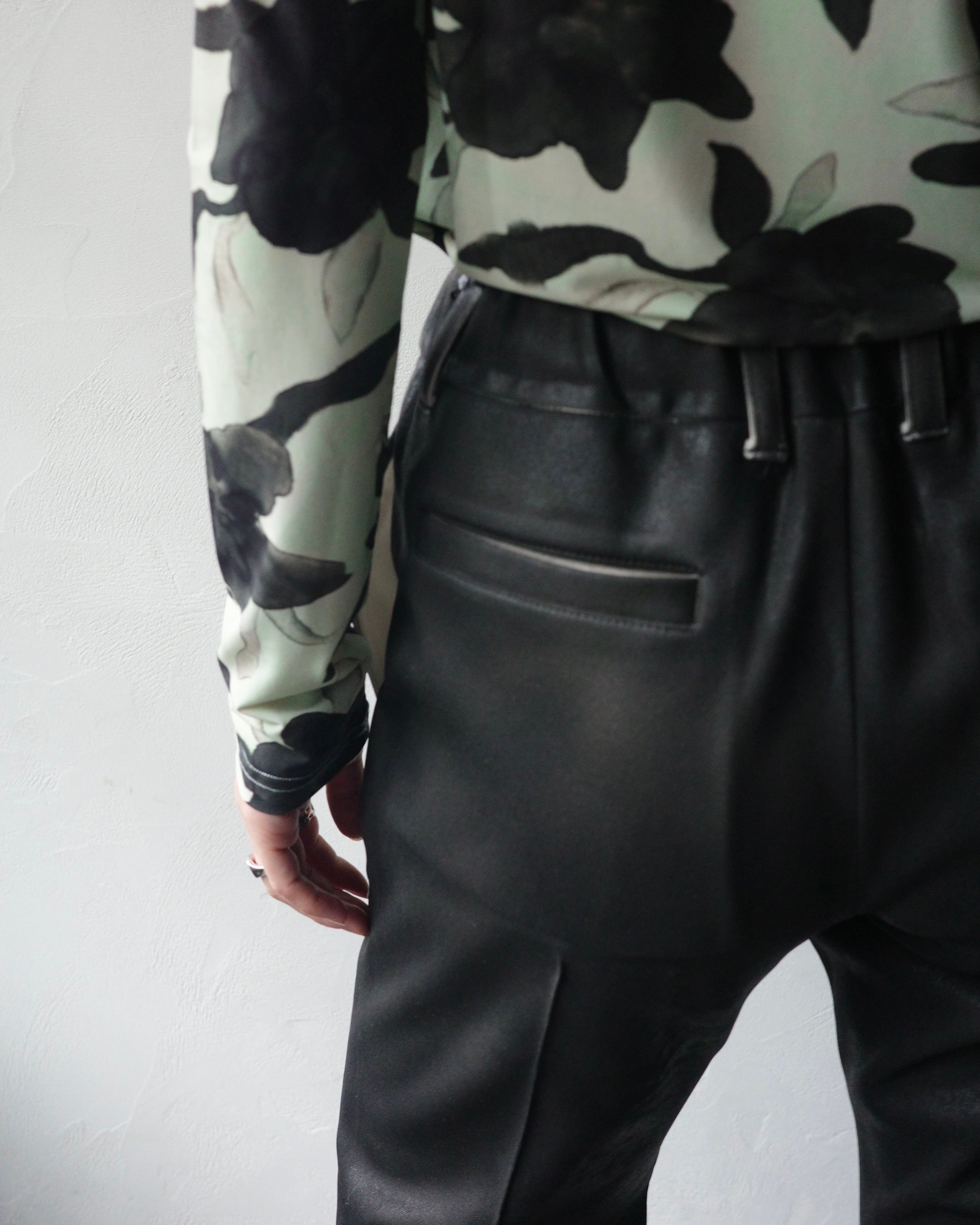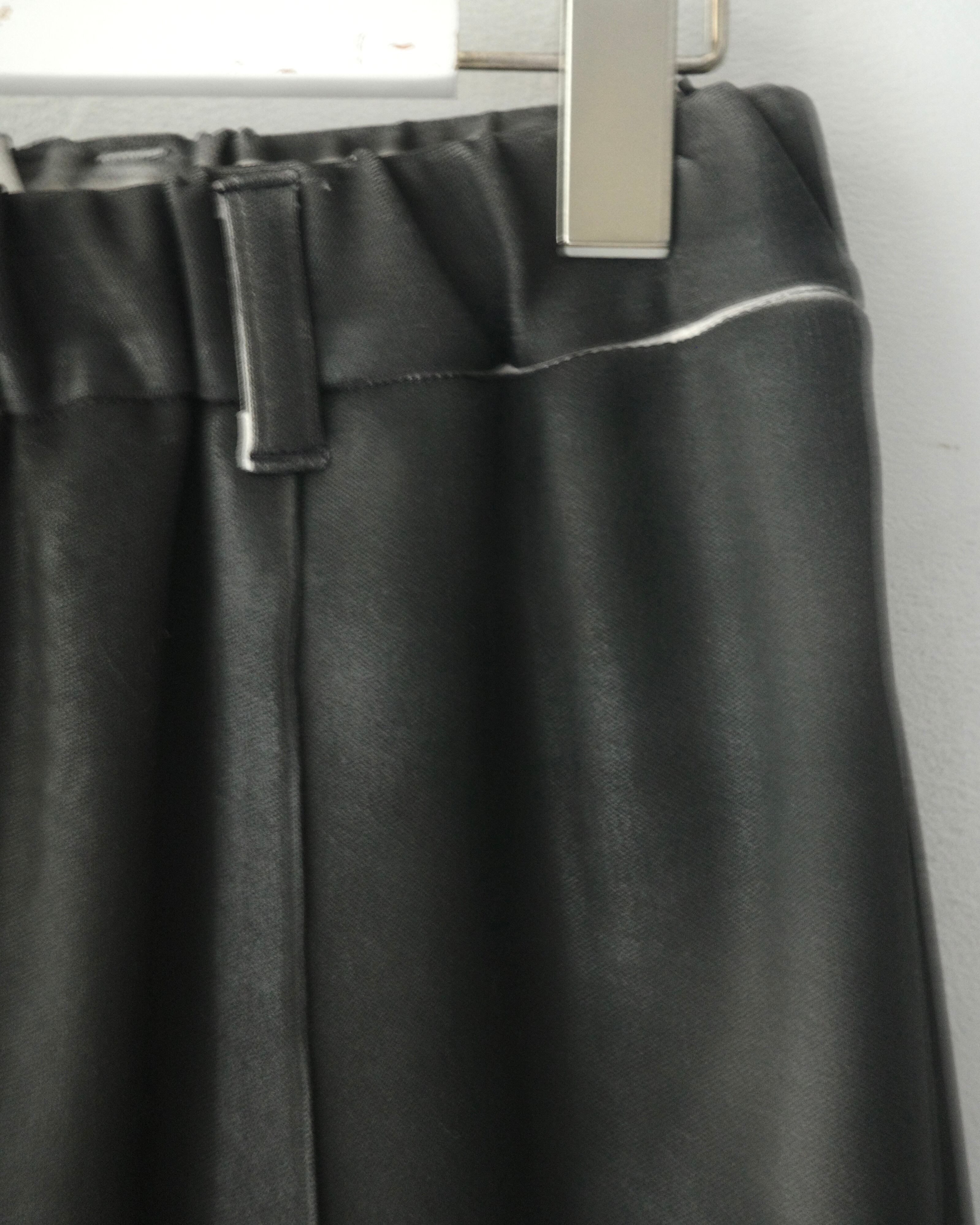 職人の手作業によって一着ずつスプレー加工を施し、レザーのような艶感と奥行きを纏わせたパンツ。