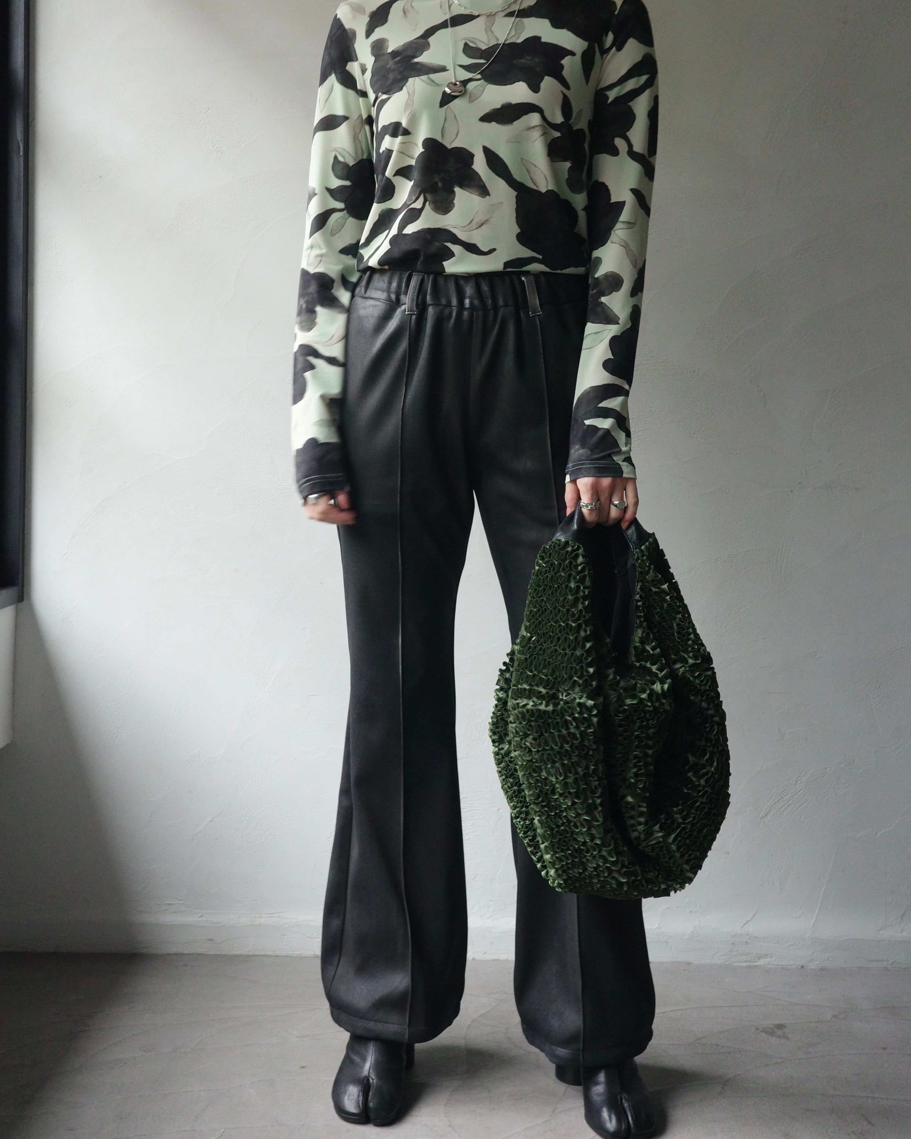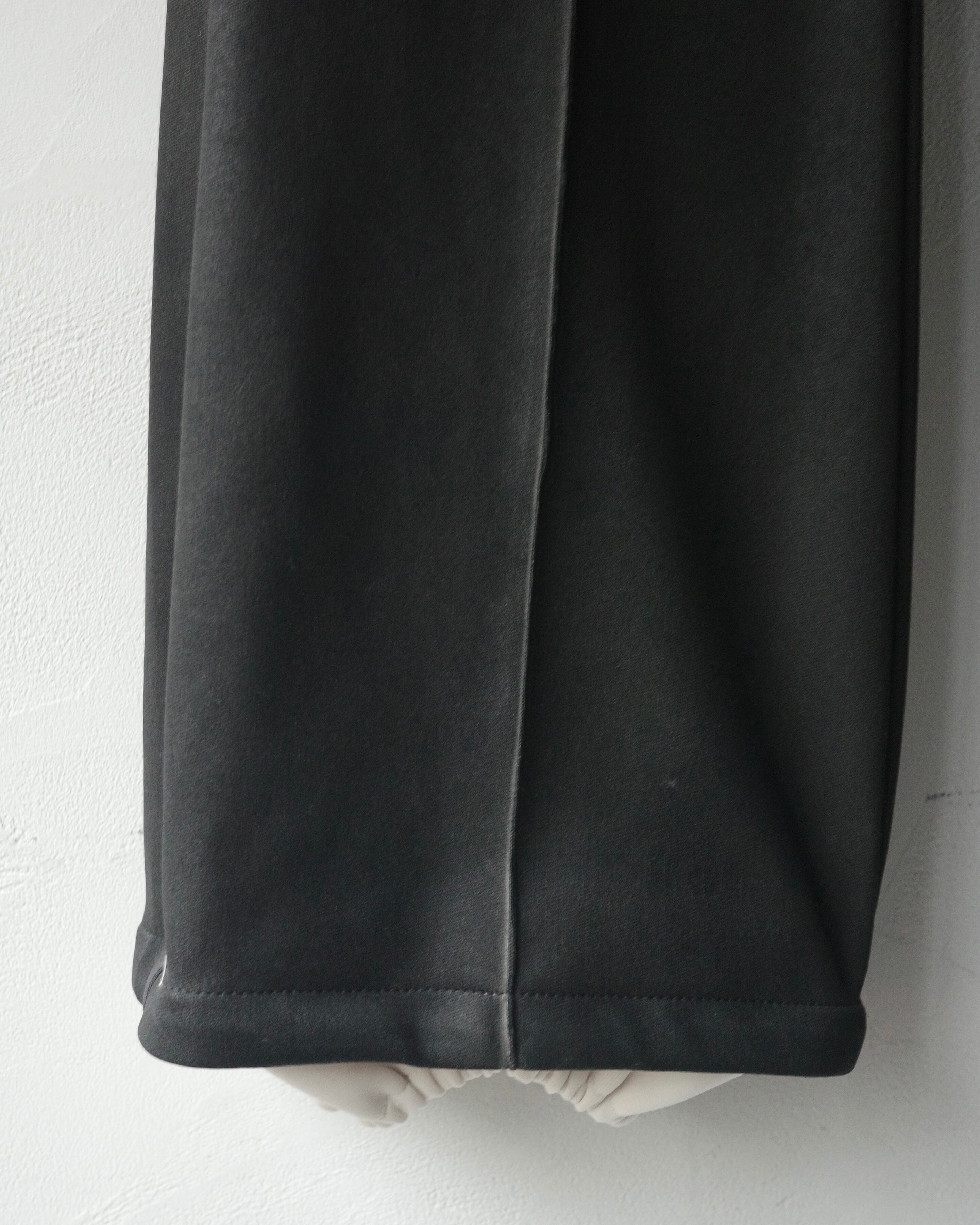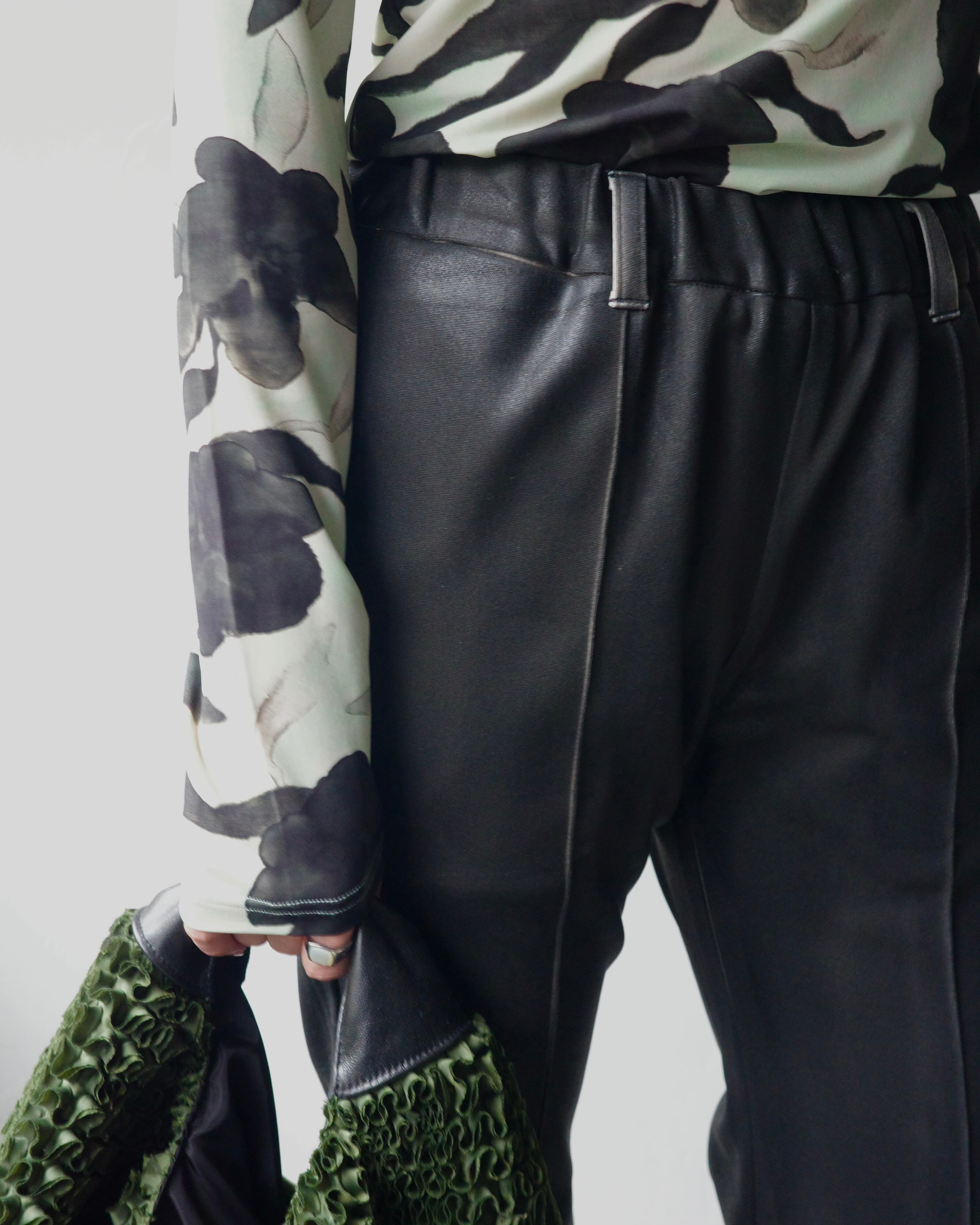 職人の手作業によって一着ずつスプレー加工を施し、レザーのような艶感と奥行きを纏わせたパンツ。