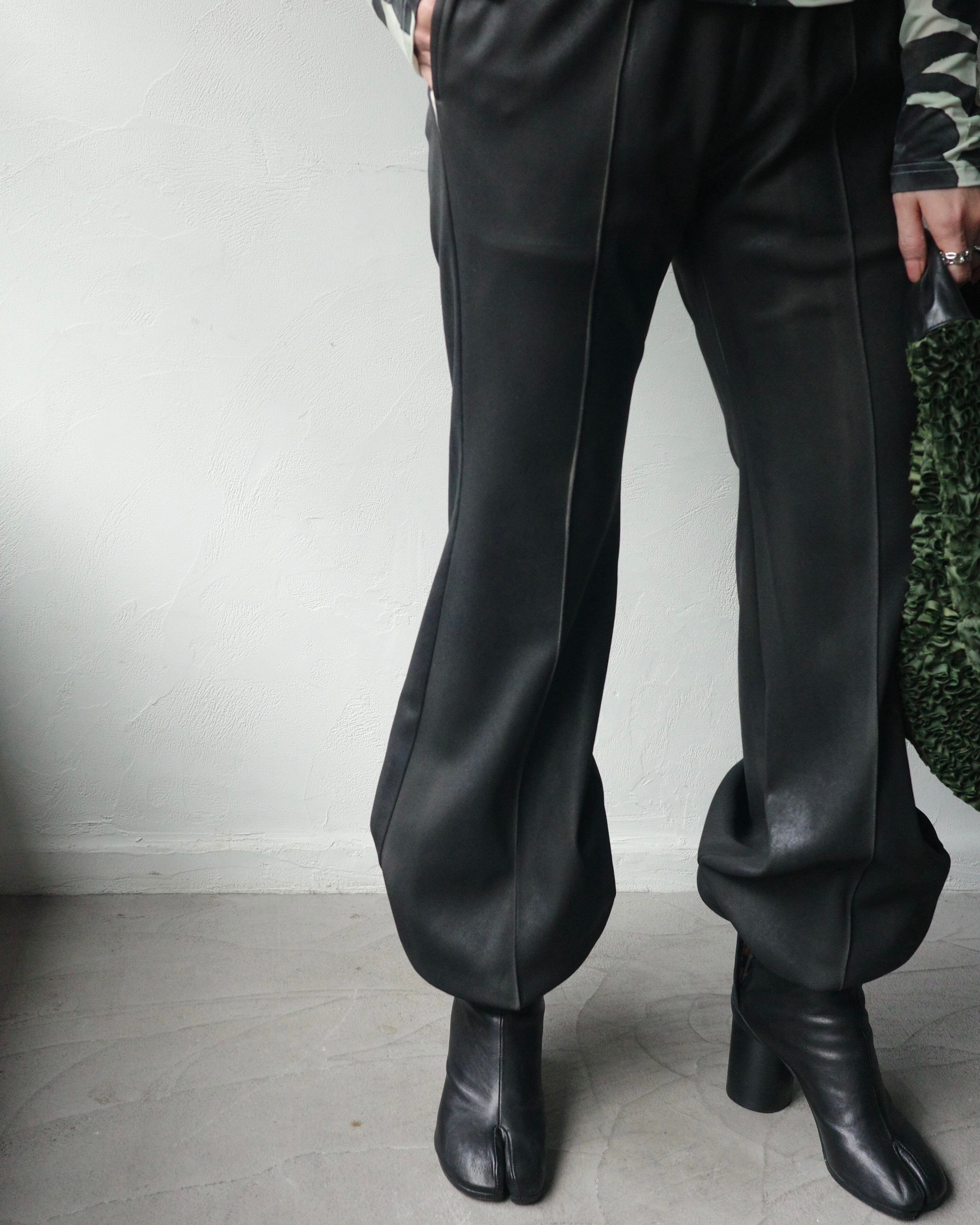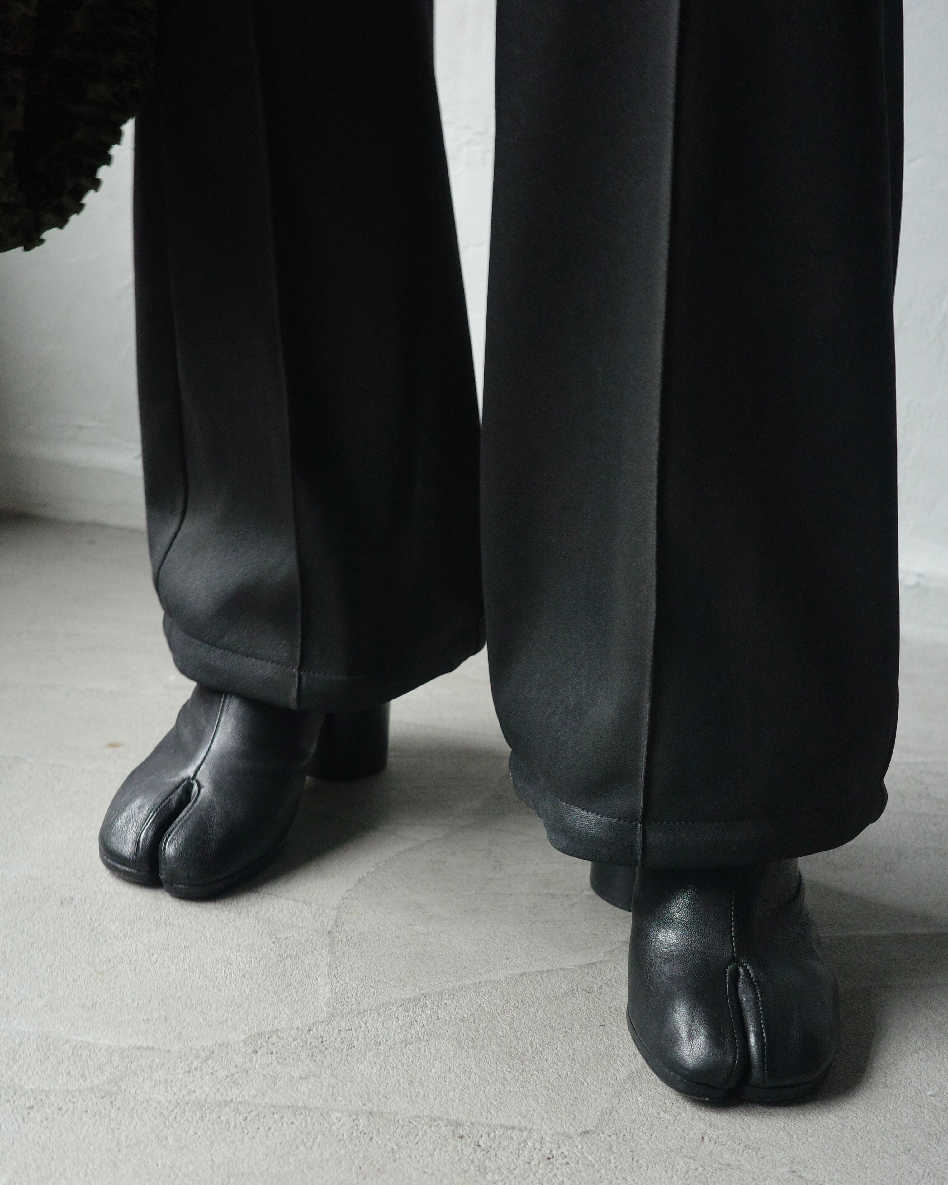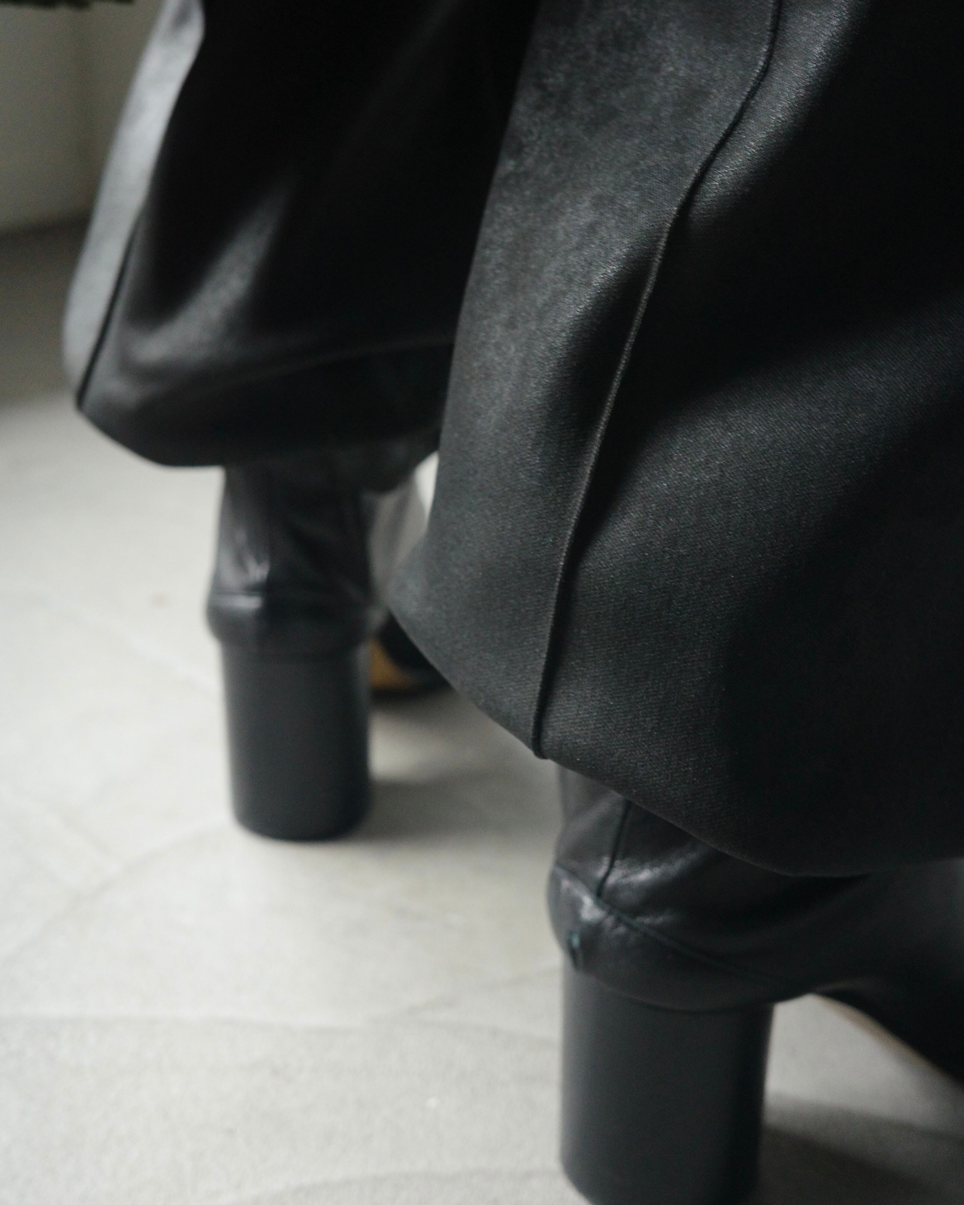 裾のたまりが面白く印象的なデザインで、光の角度によって表情を変える独特な質感が共存する一本。