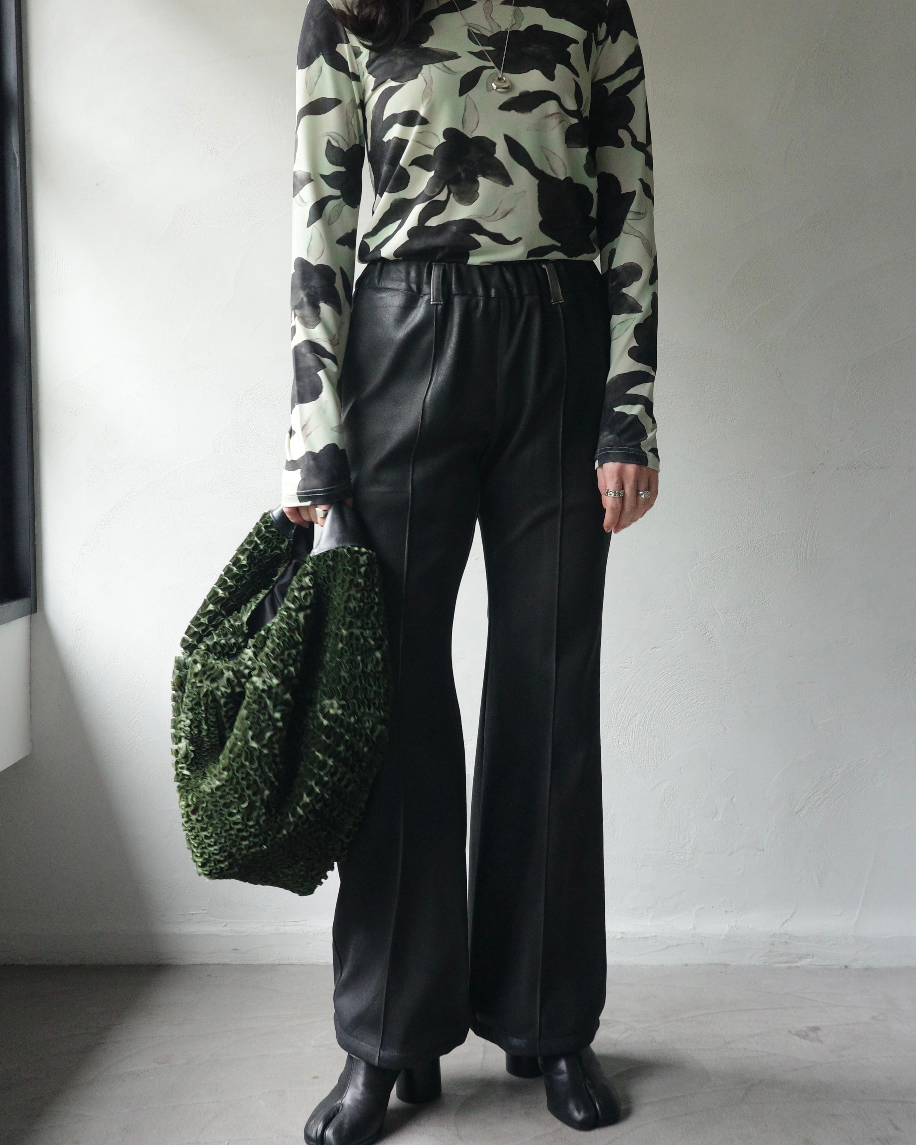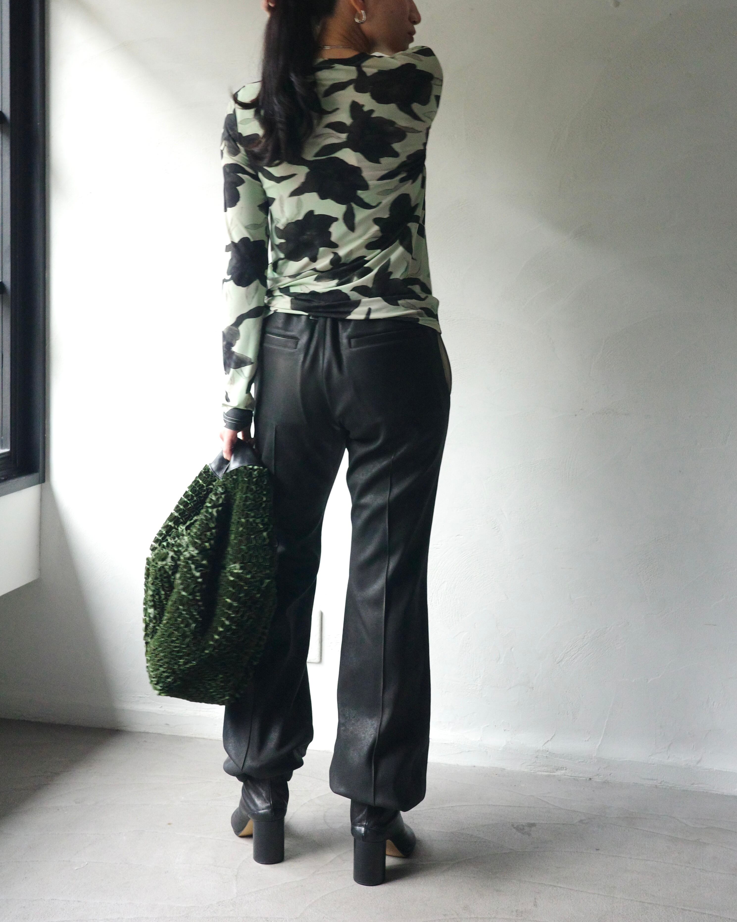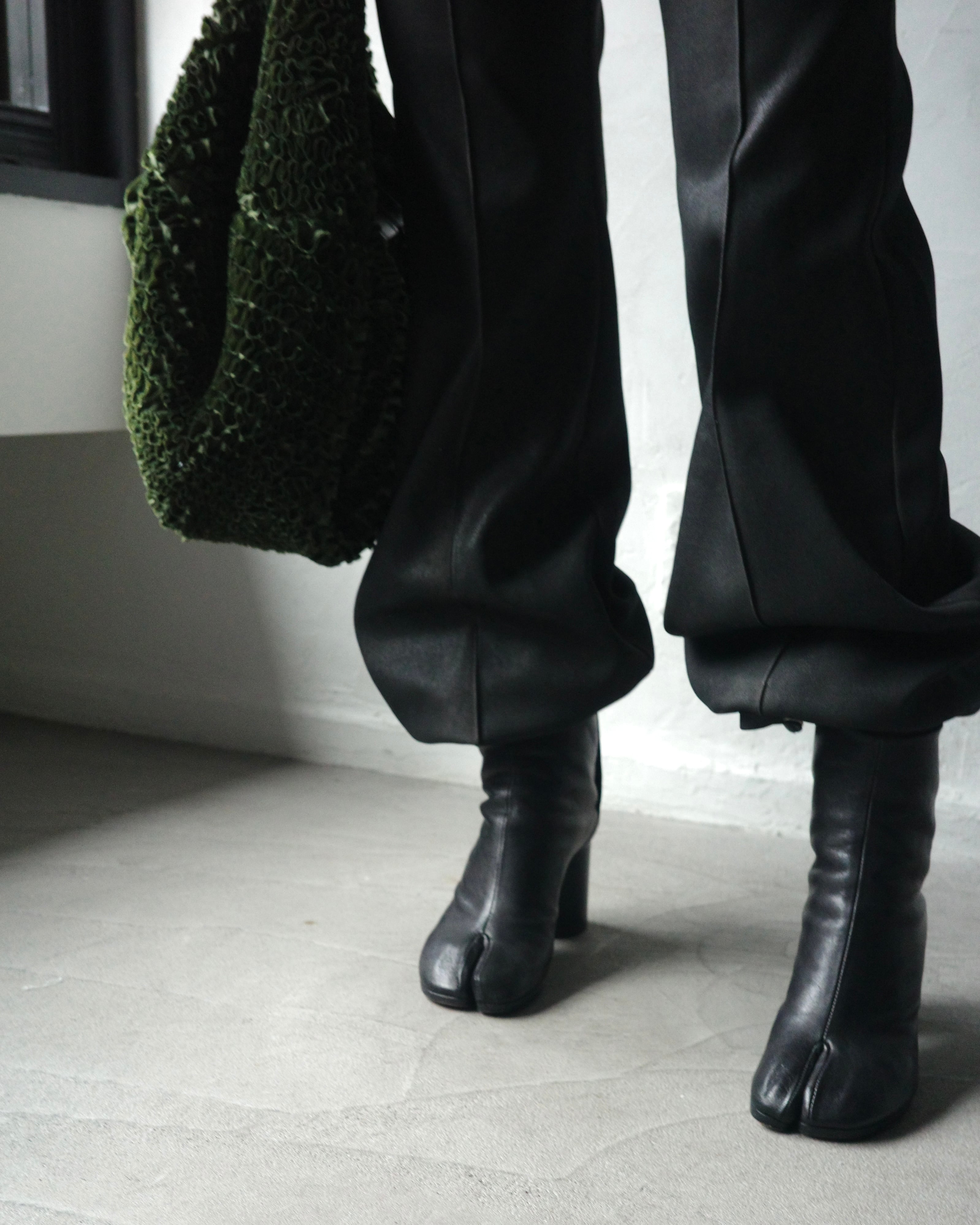 裾のたまりが面白く印象的なデザインで、光の角度によって表情を変える独特な質感が共存する一本。