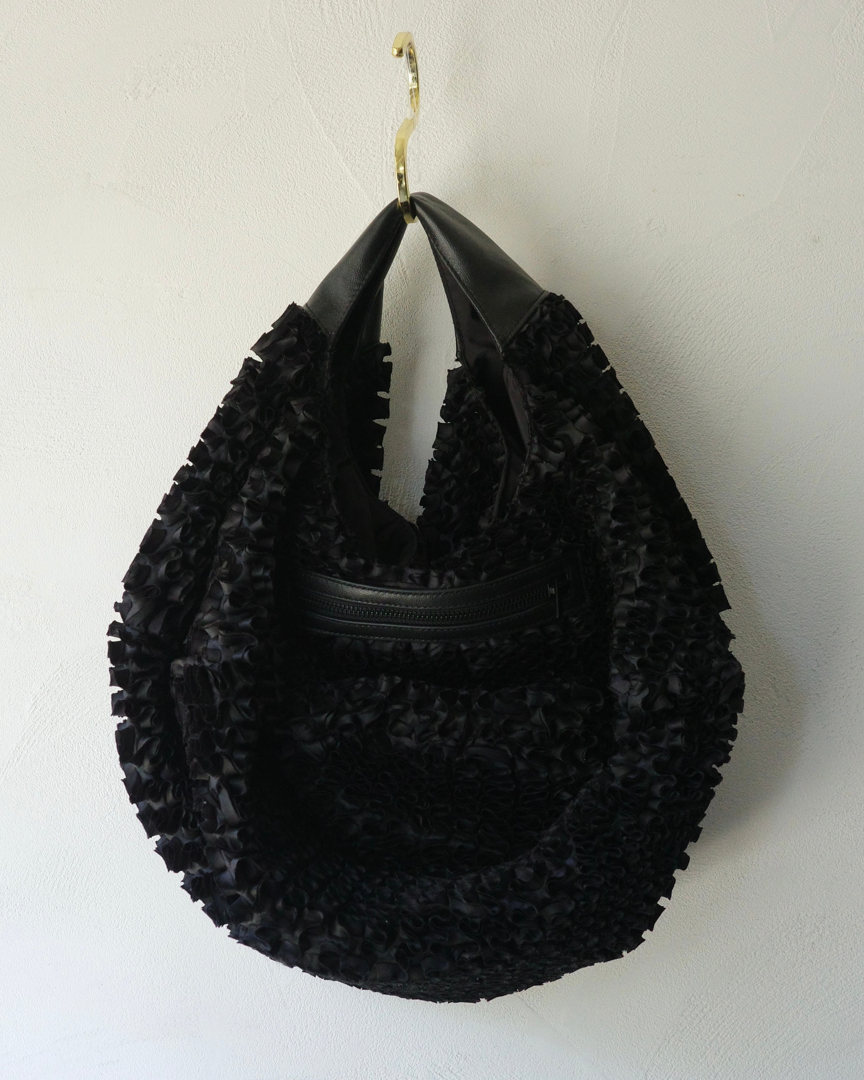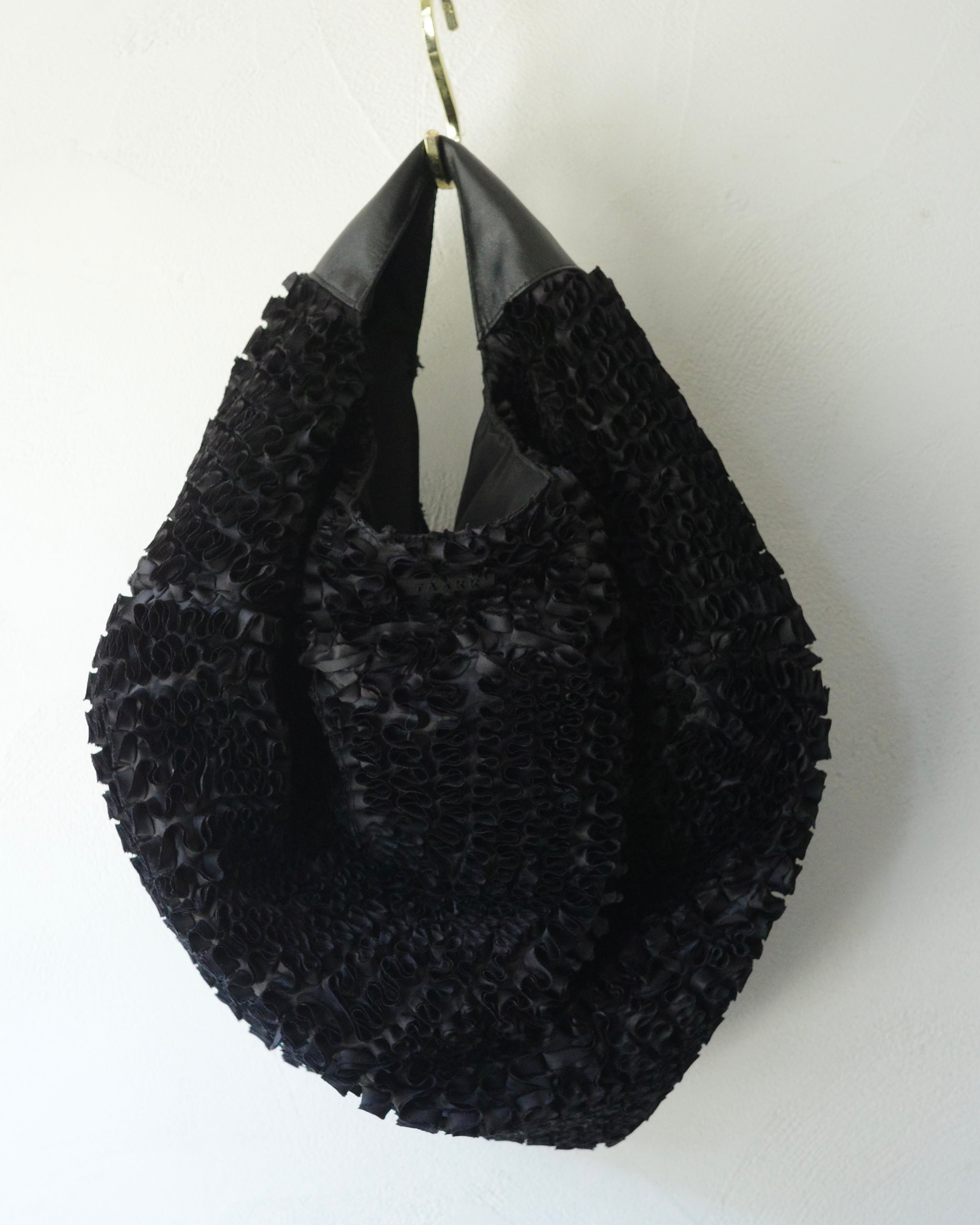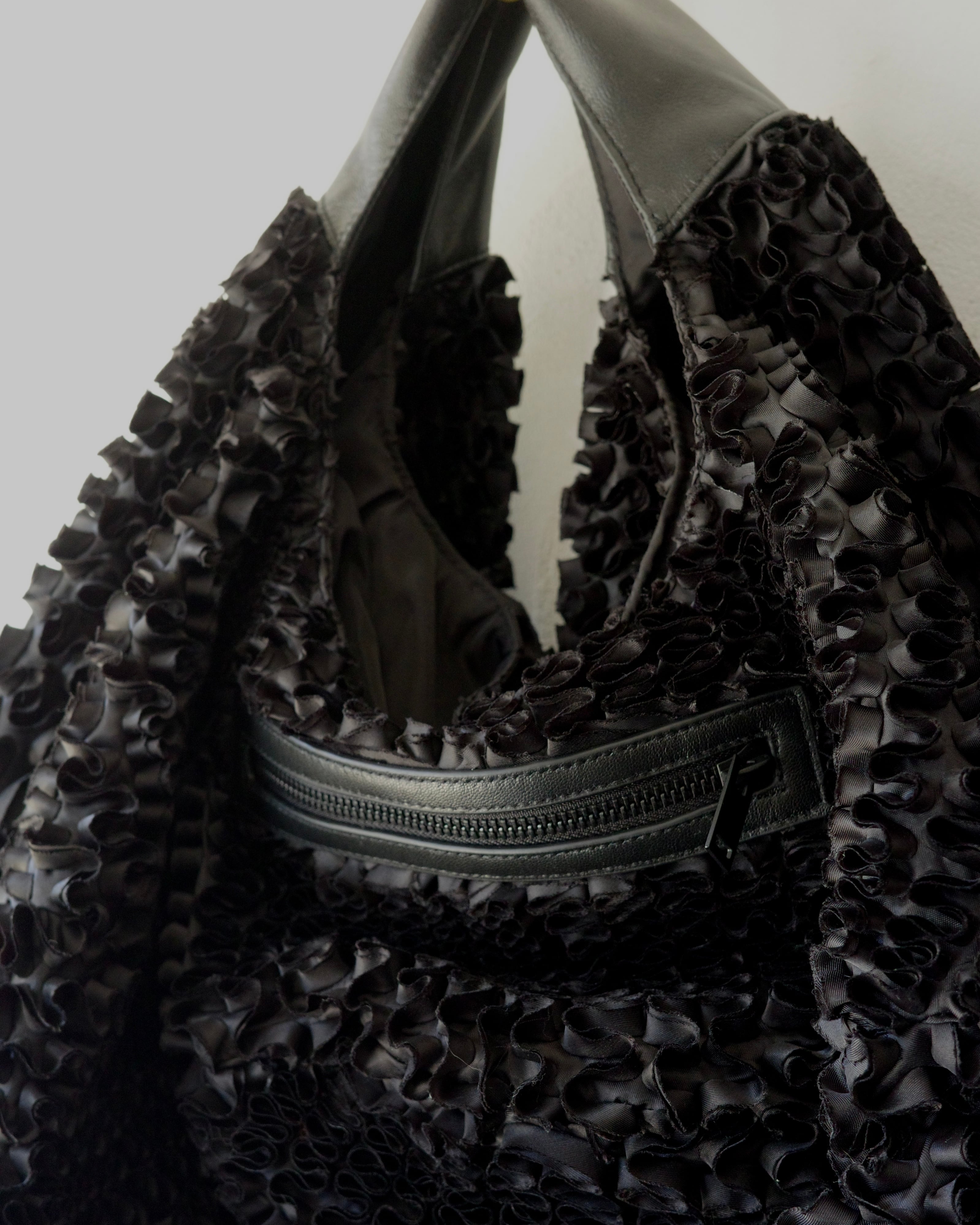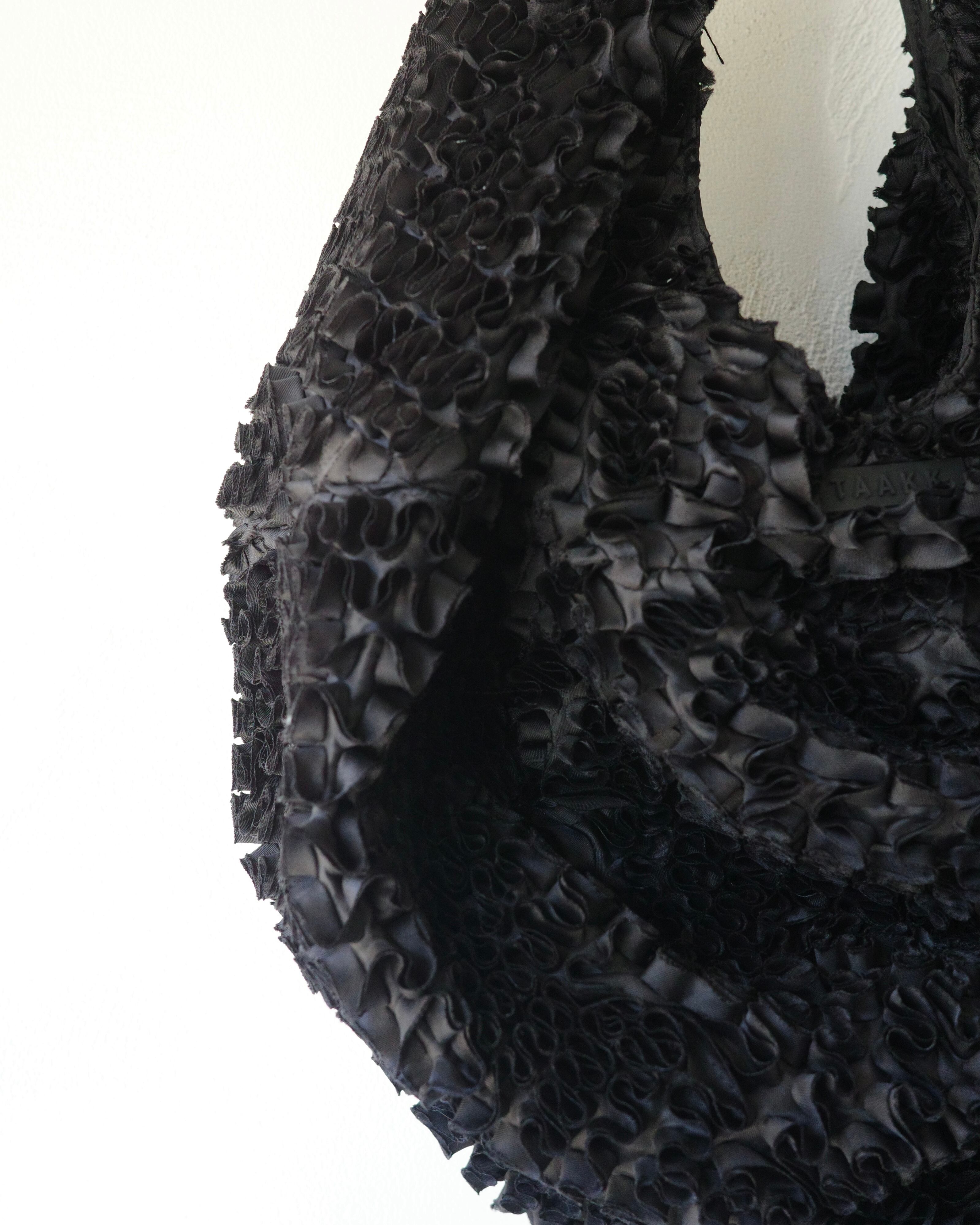 一見シンプルな円形の構造は、持ち上げることで自然に立体化し、実用性を備えたバッグへと変容する。素材には、1mの面積を作るために約7mの生地をバイアス方向に裁断し、膨大な時間をかけて刺繍によって再構築したテキスタイルを使用。彫刻的なフォルムとクラフト的な密度が共存する、TAAKKらしい素材から生まれた実験的プロダクト。