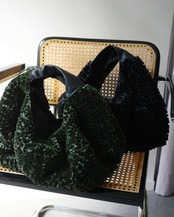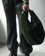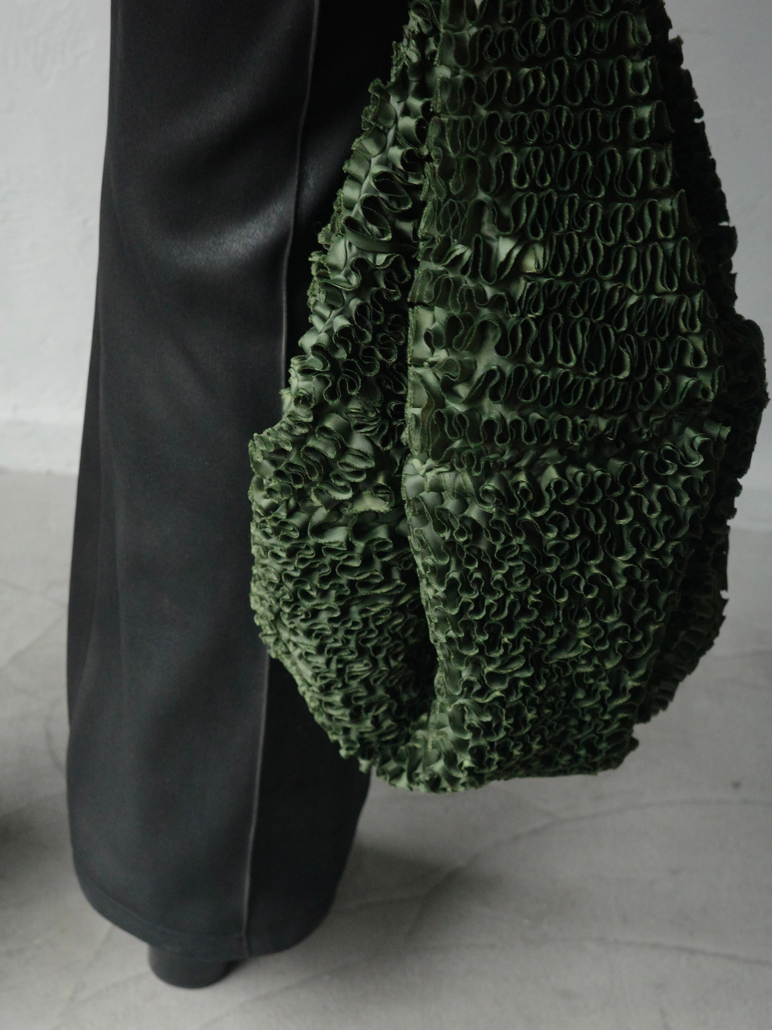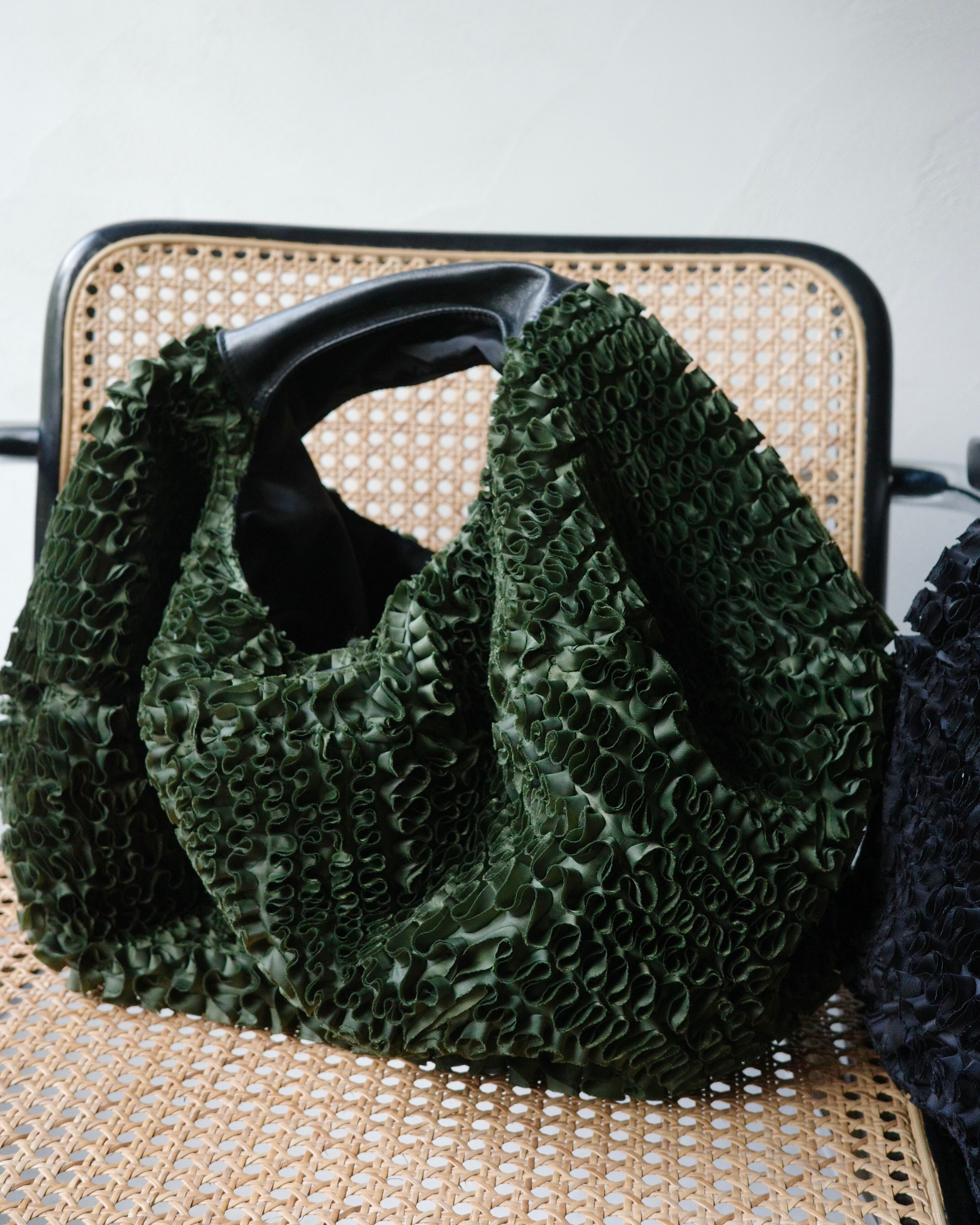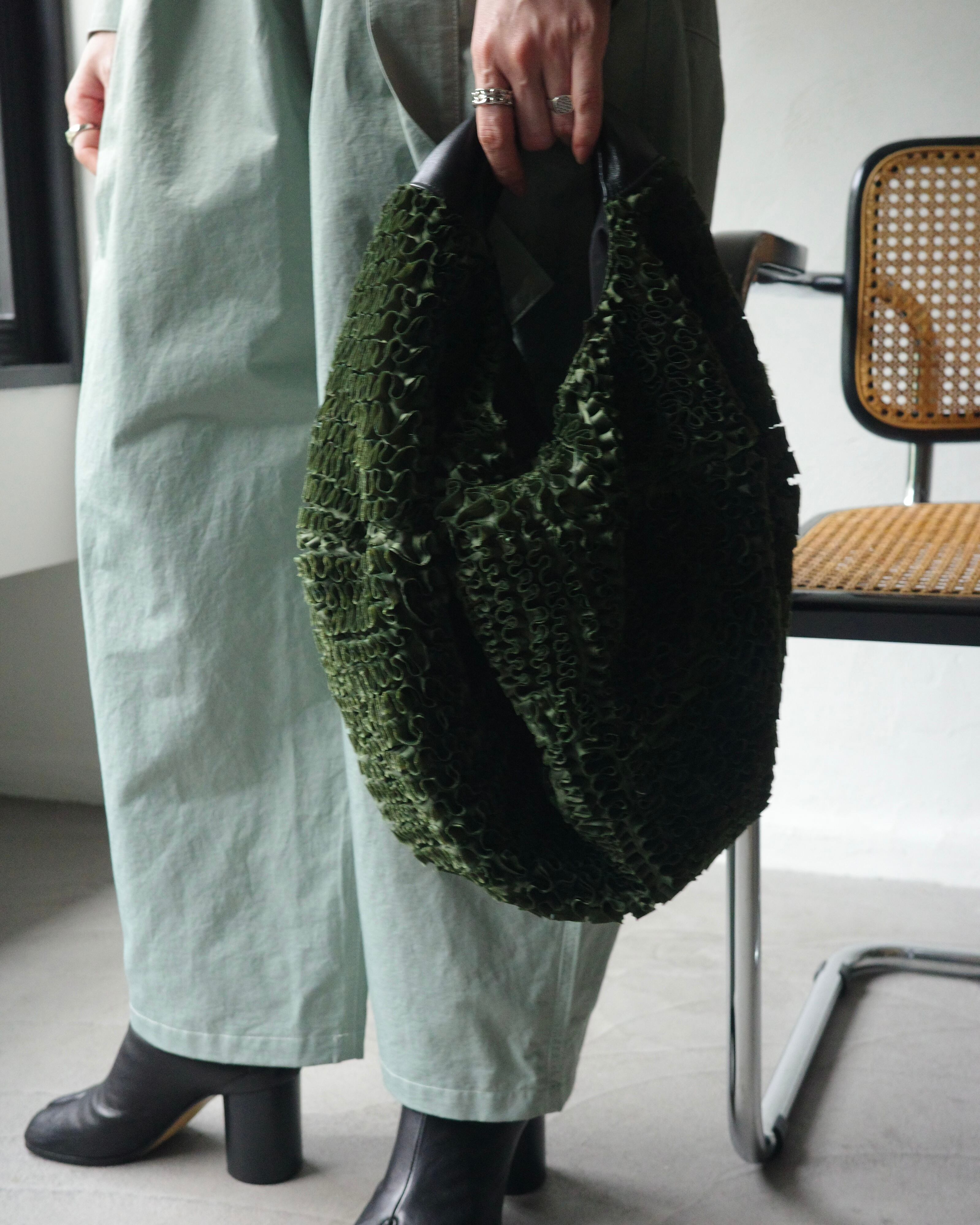 一見シンプルな円形の構造は、持ち上げることで自然に立体化し、実用性を備えたバッグへと変容する。素材には、1mの面積を作るために約7mの生地をバイアス方向に裁断し、膨大な時間をかけて刺繍によって再構築したテキスタイルを使用。彫刻的なフォルムとクラフト的な密度が共存する、TAAKKらしい素材から生まれた実験的プロダクト。
