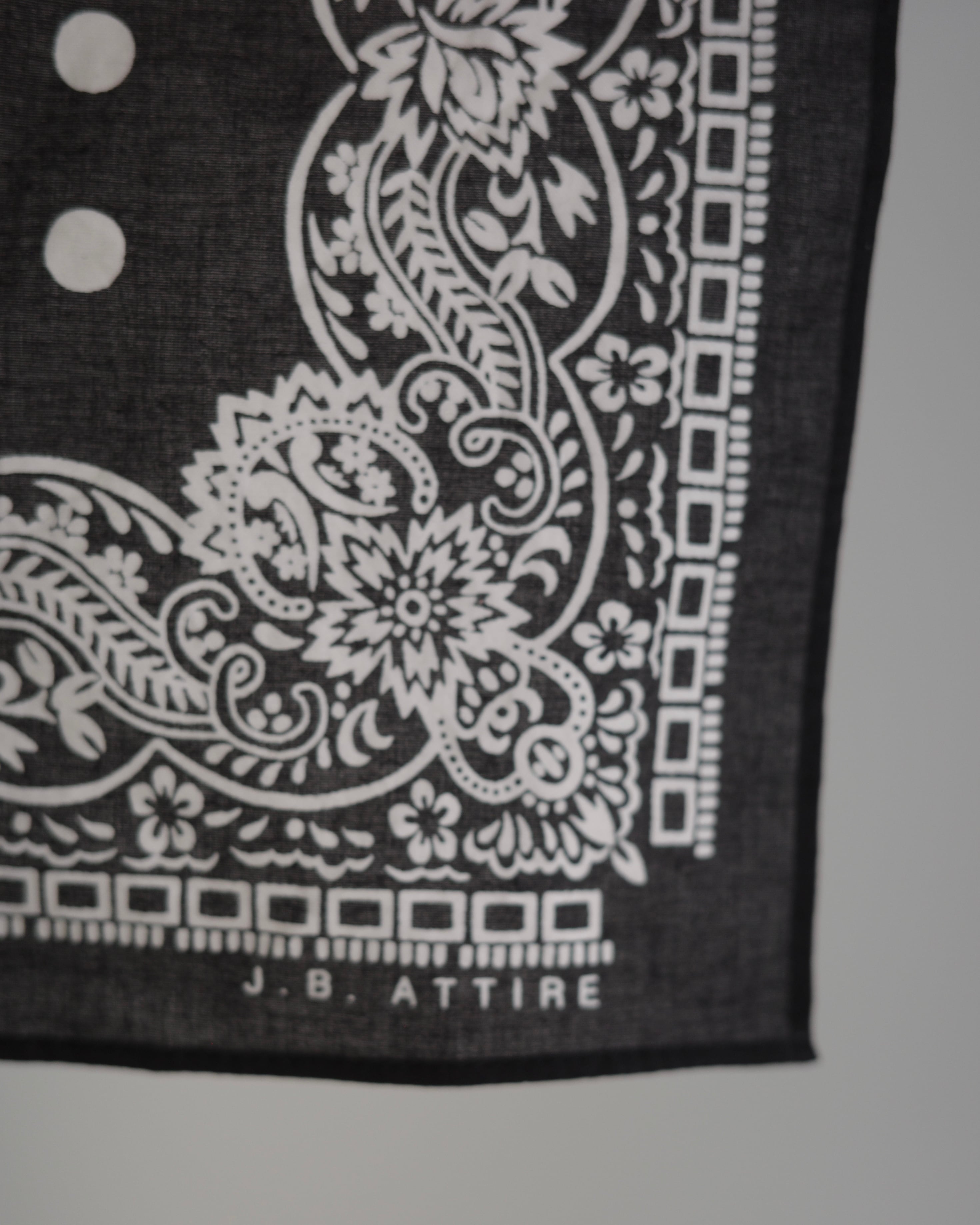 全体にペイズリー柄をあしらいロゴプリントを施したオリジナル柄のミニサイズバンダナ。