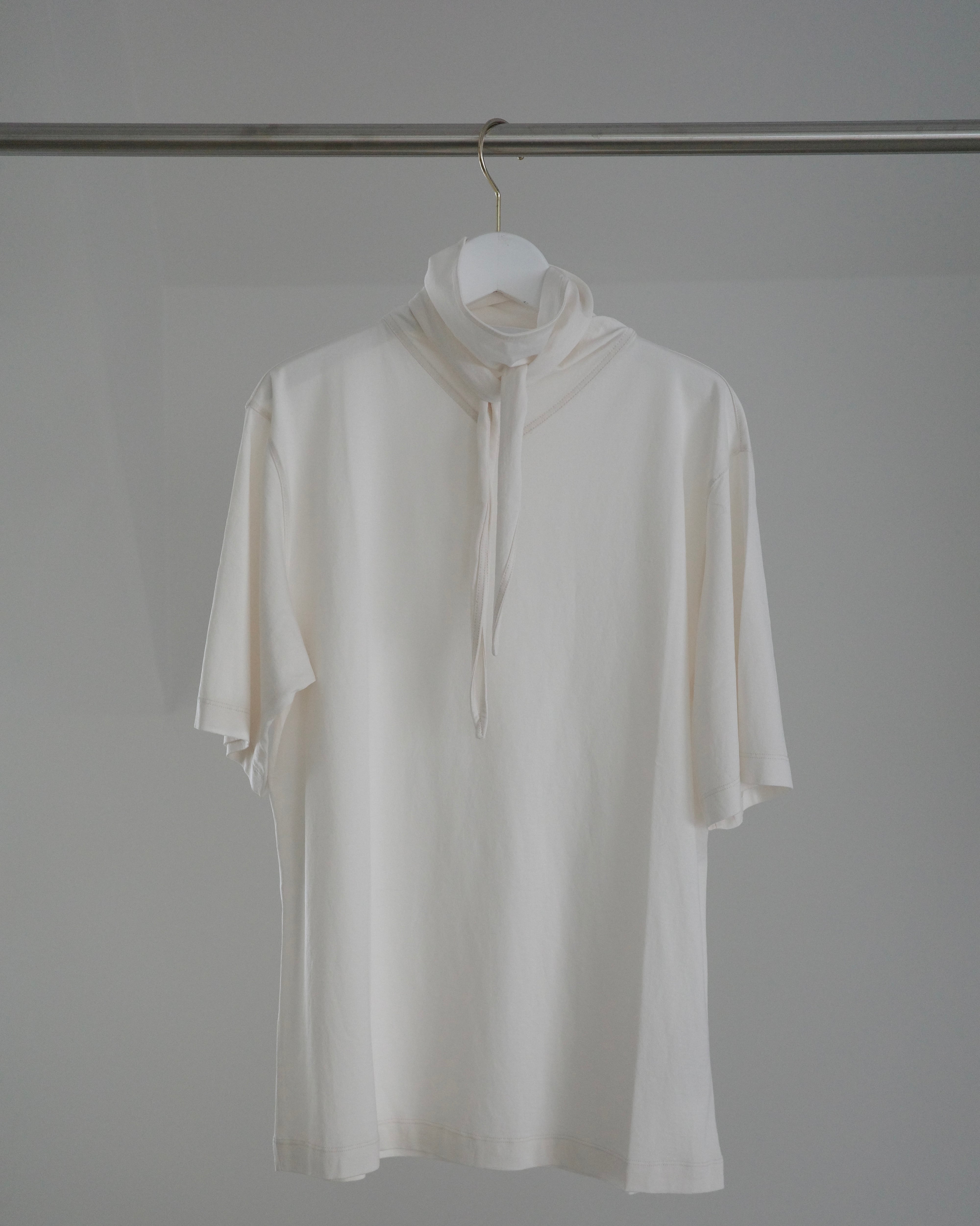 ボックスシルエットのフーラードTシャツは、スタンドカラーのV字型ベースが特徴で、