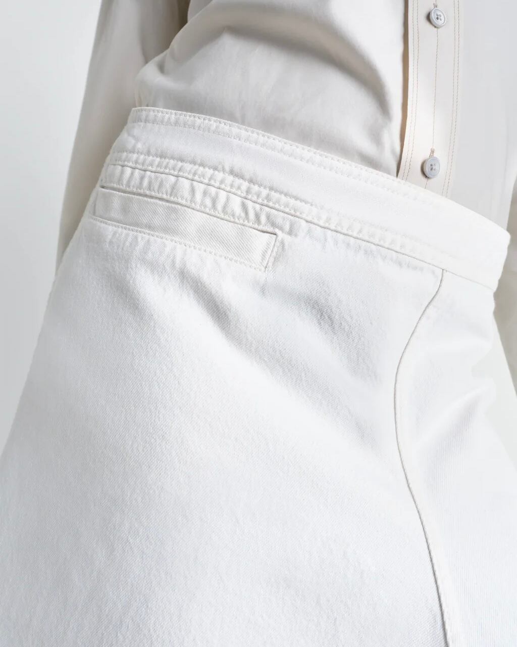 アシンメトリーなカットが特徴のブリーチデニムスカートは、動きと流れるようなシルエットを演出します。トーンオントーンのトップステッチが、このテーマに洗練されたディテールを添えています