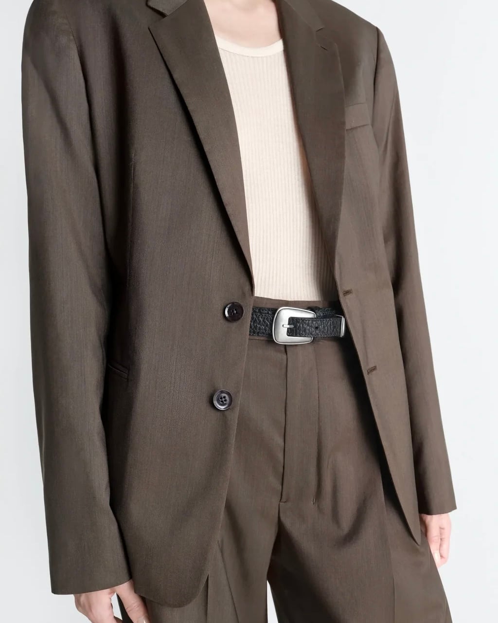 LEMAIREのワードローブに欠かせないウエスタンベルト。豊かな質感が特徴の、重厚で耐久性に優れたLWG(レザーワーキンググループ)シルバー認証のグレインレザーを使用し、二重仕様の留め具を備えています。