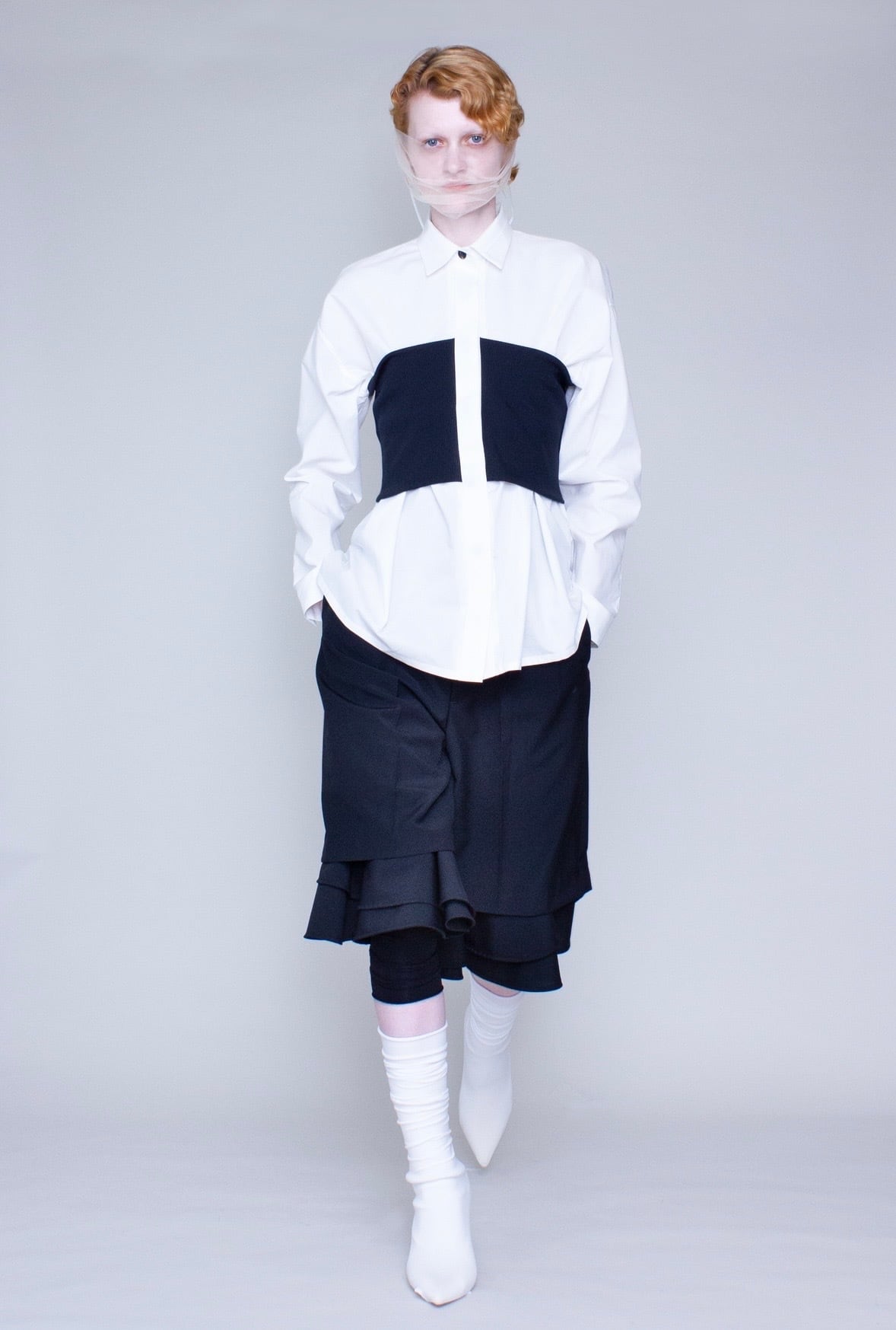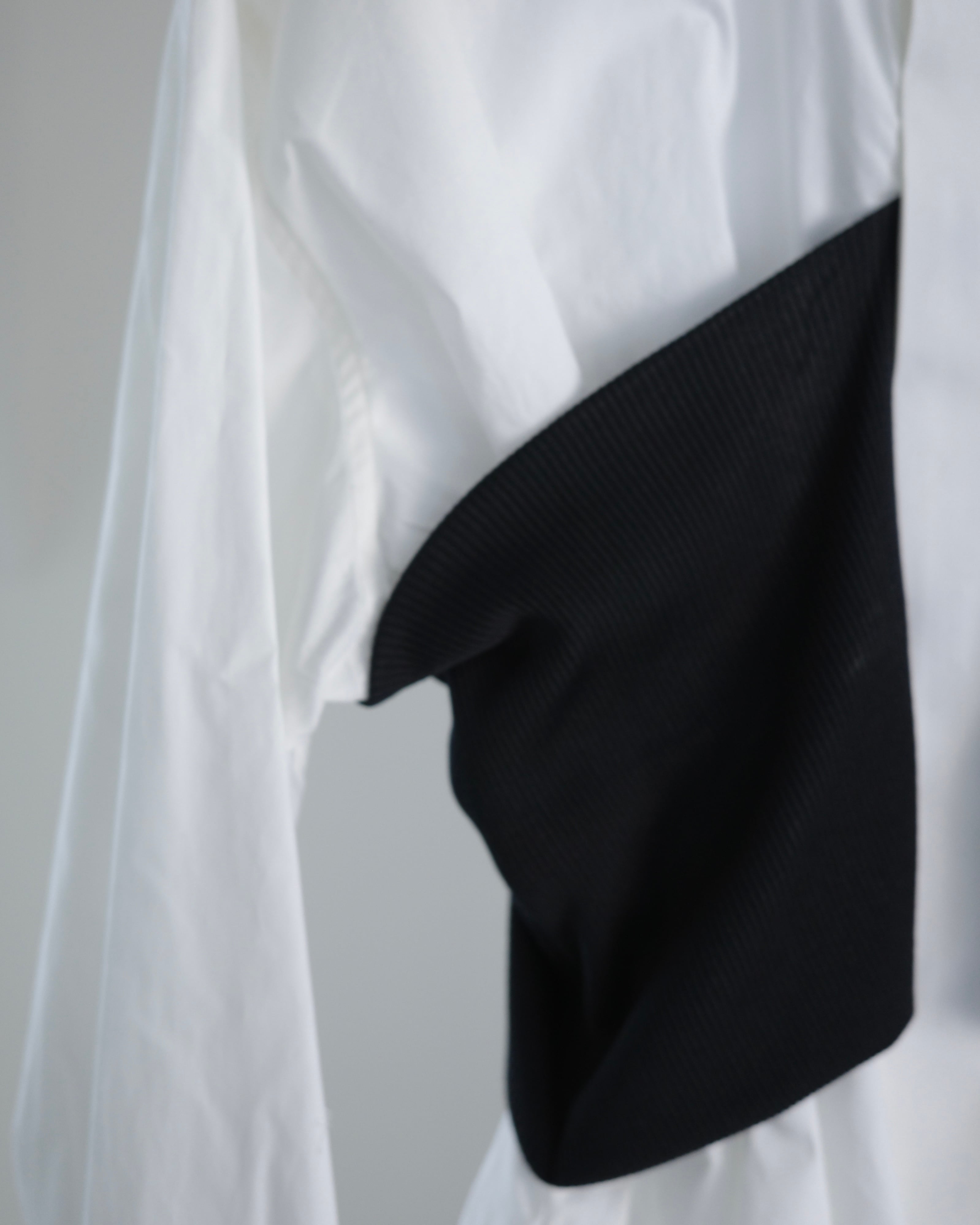 滑らかなコットン生地に、伸縮性のあるリブ編みのビスチェをドッキングしたブラウス。