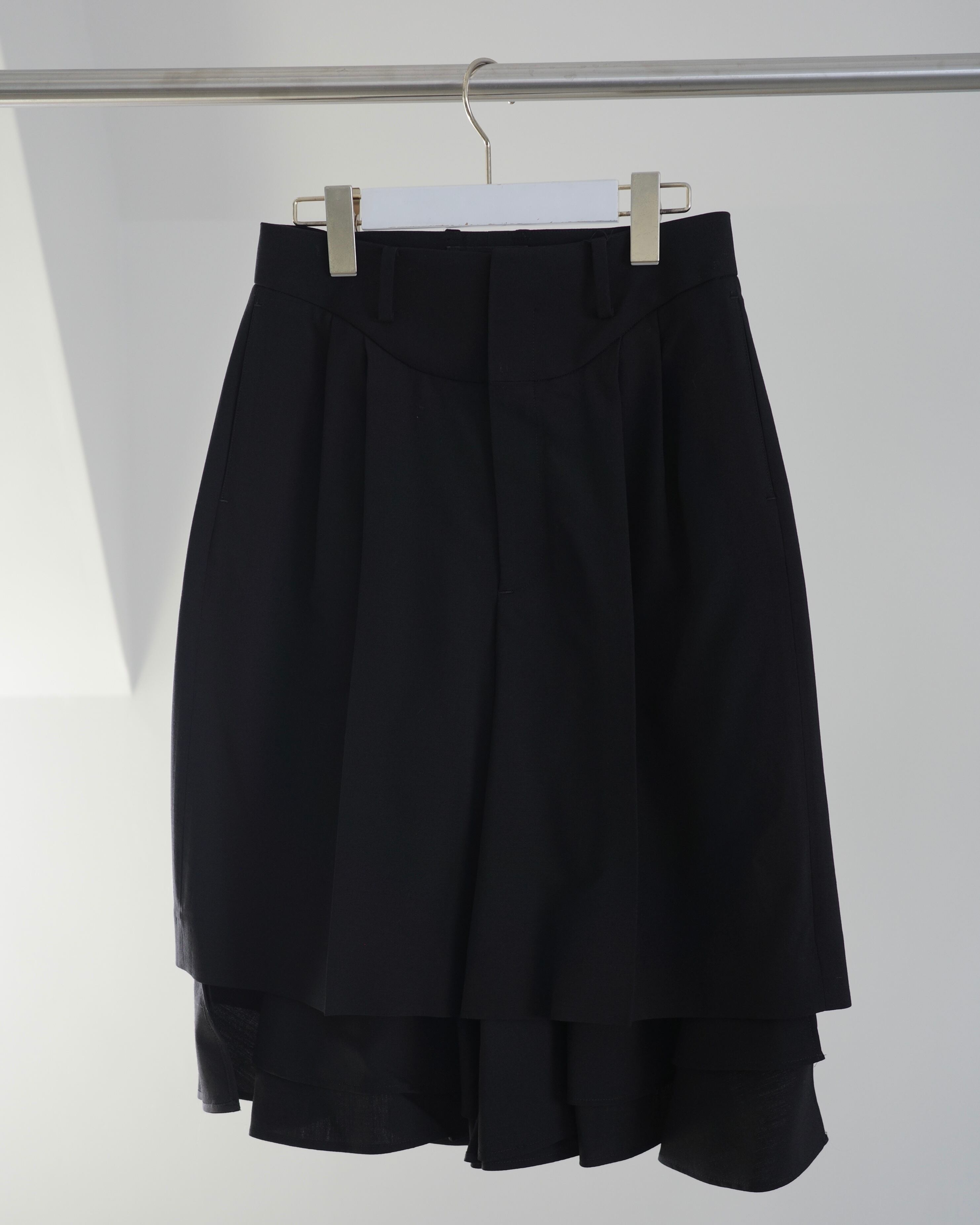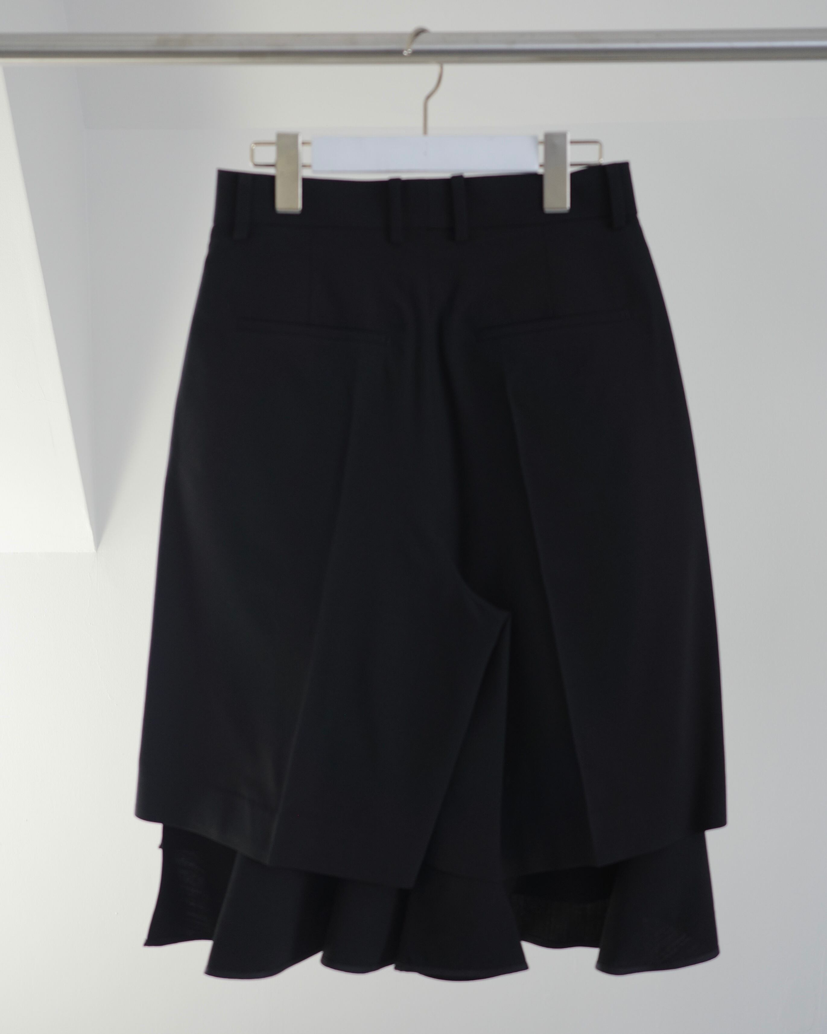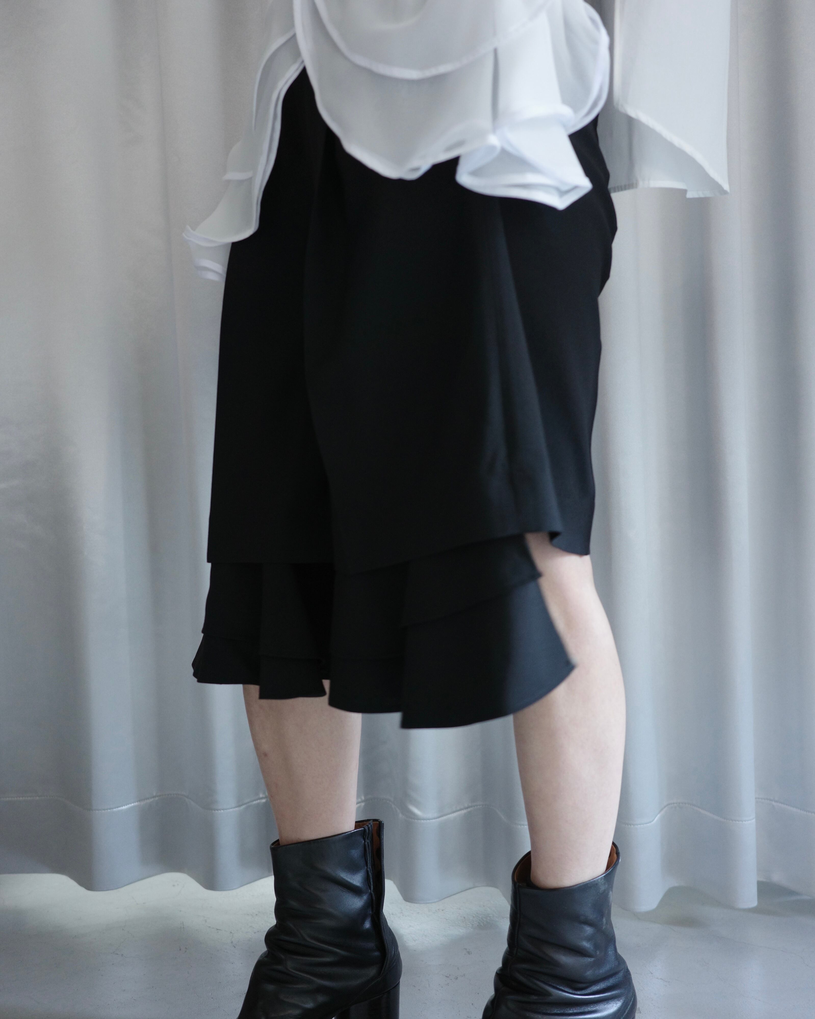 前裾に2段のフリルを施し、動くたびにさりげなく個性を振りまくデザインに昇華したのハーフパンツ。