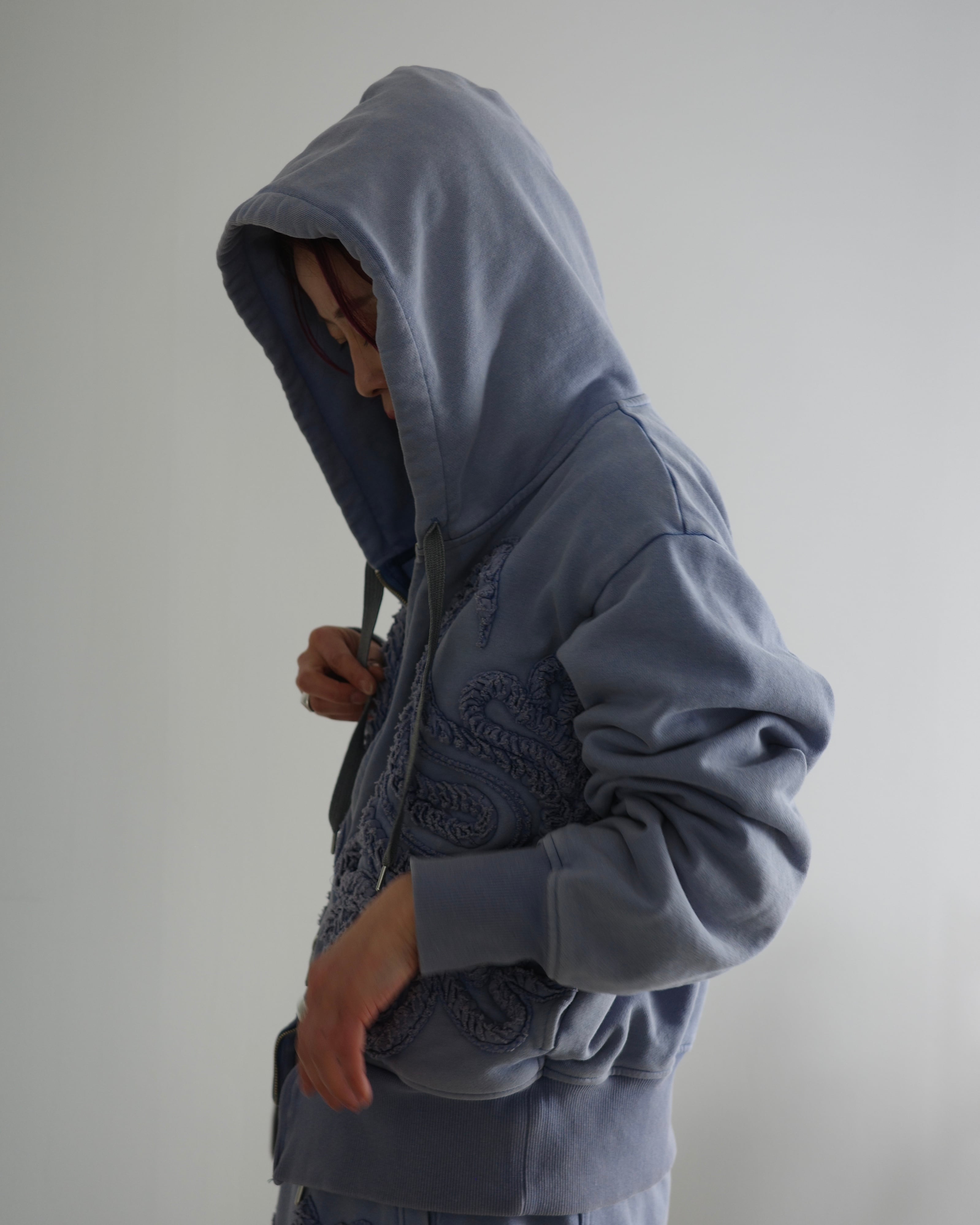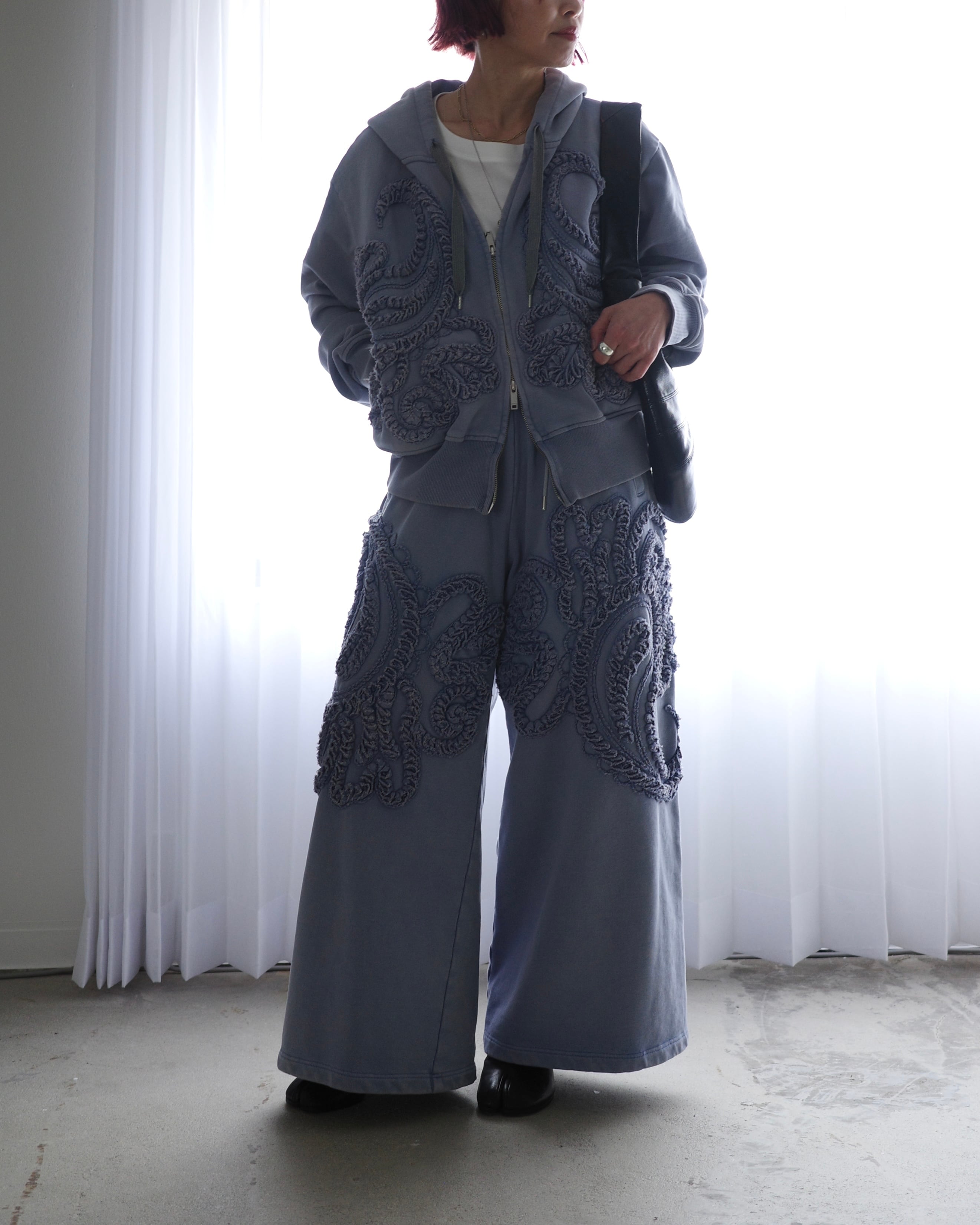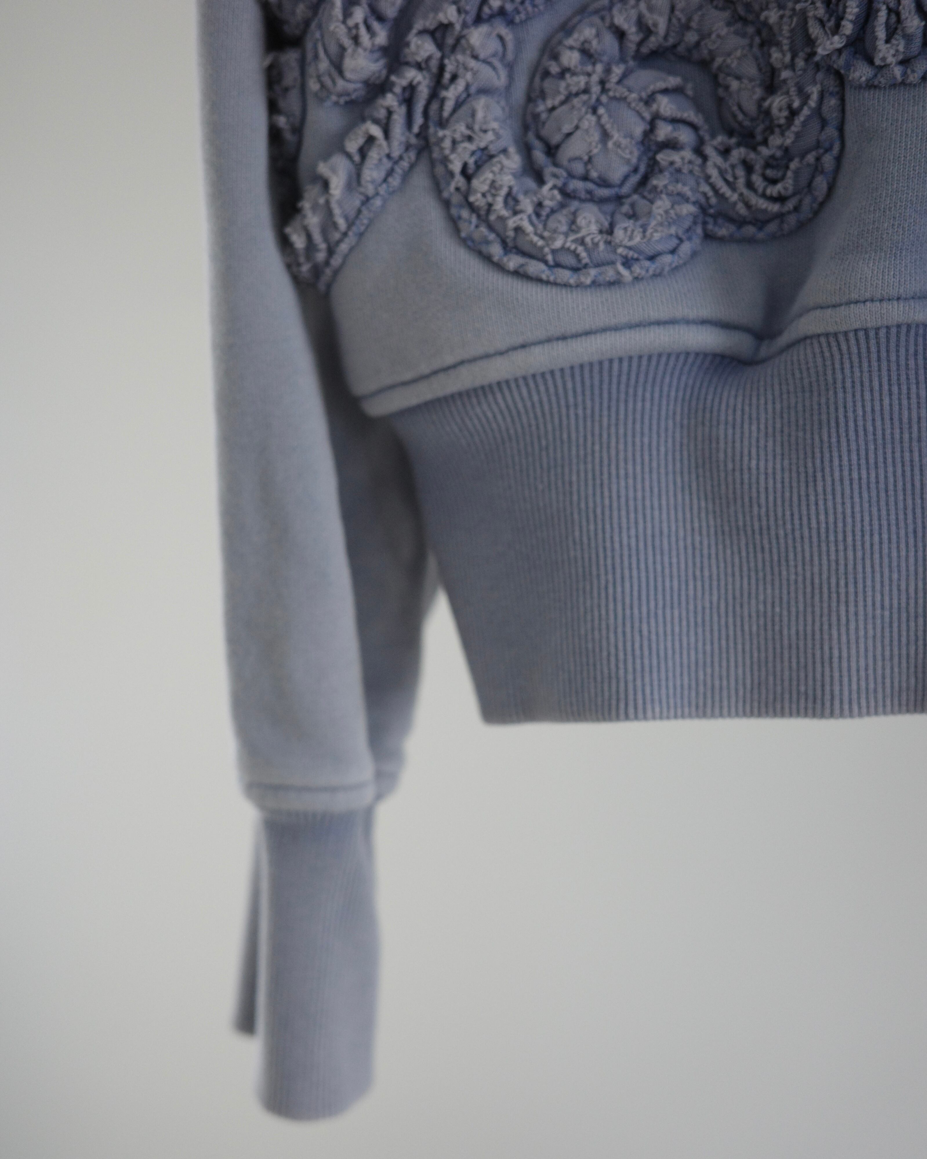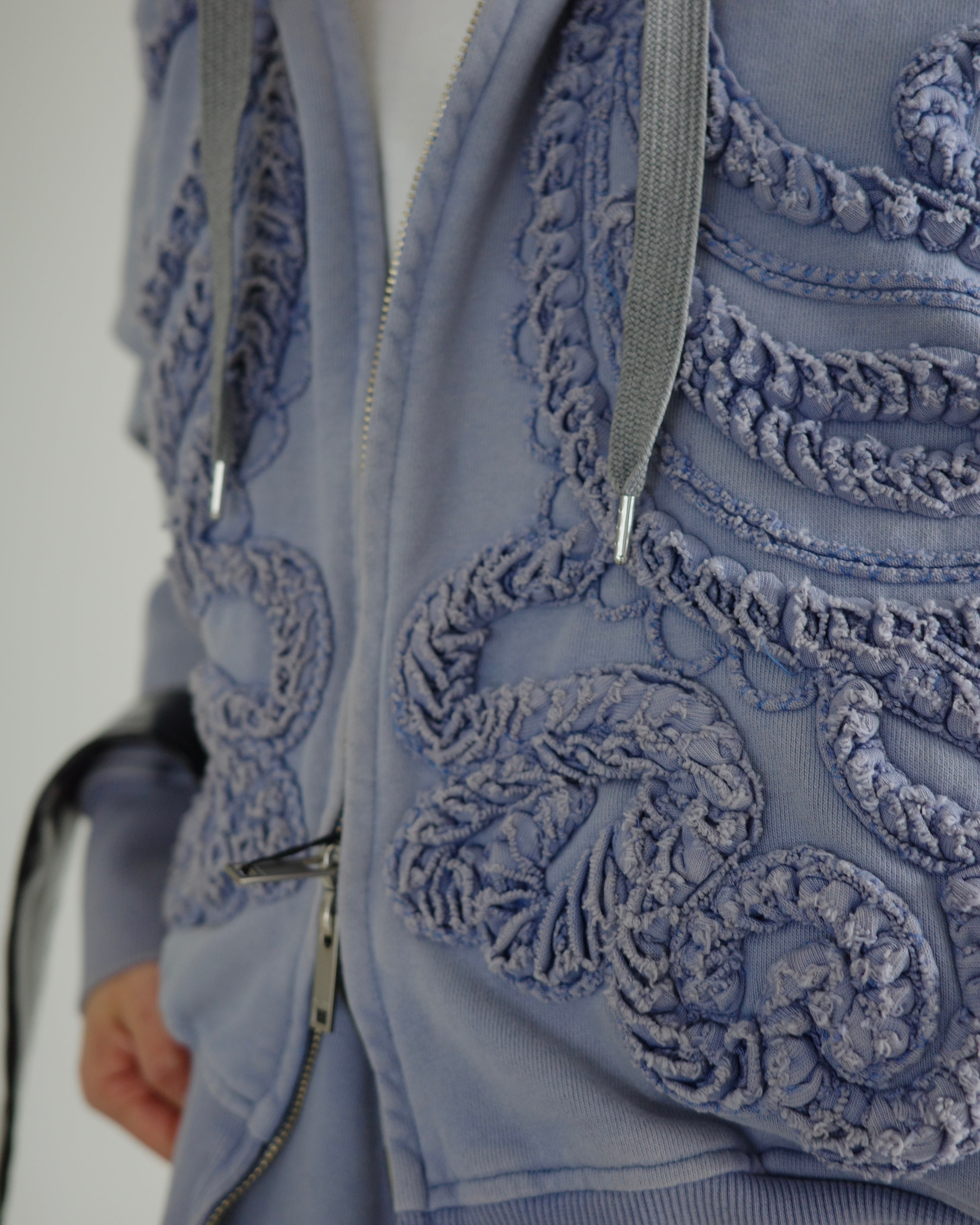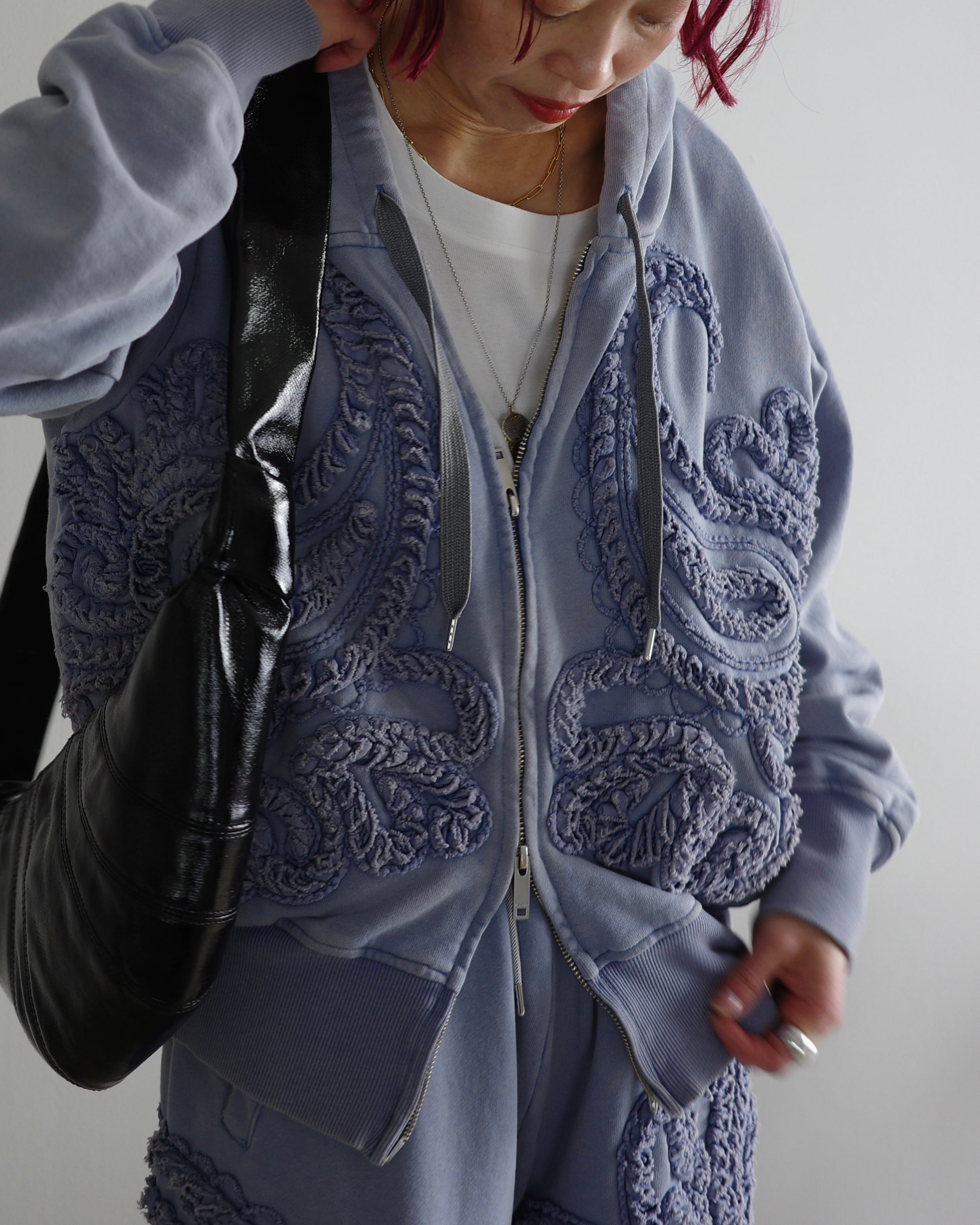 重厚で装飾的なモチーフに対し、ボディ全体にはケミカルウォッシュを施すことで、素材の奥行きと刺繍の陰影を際立たせている。